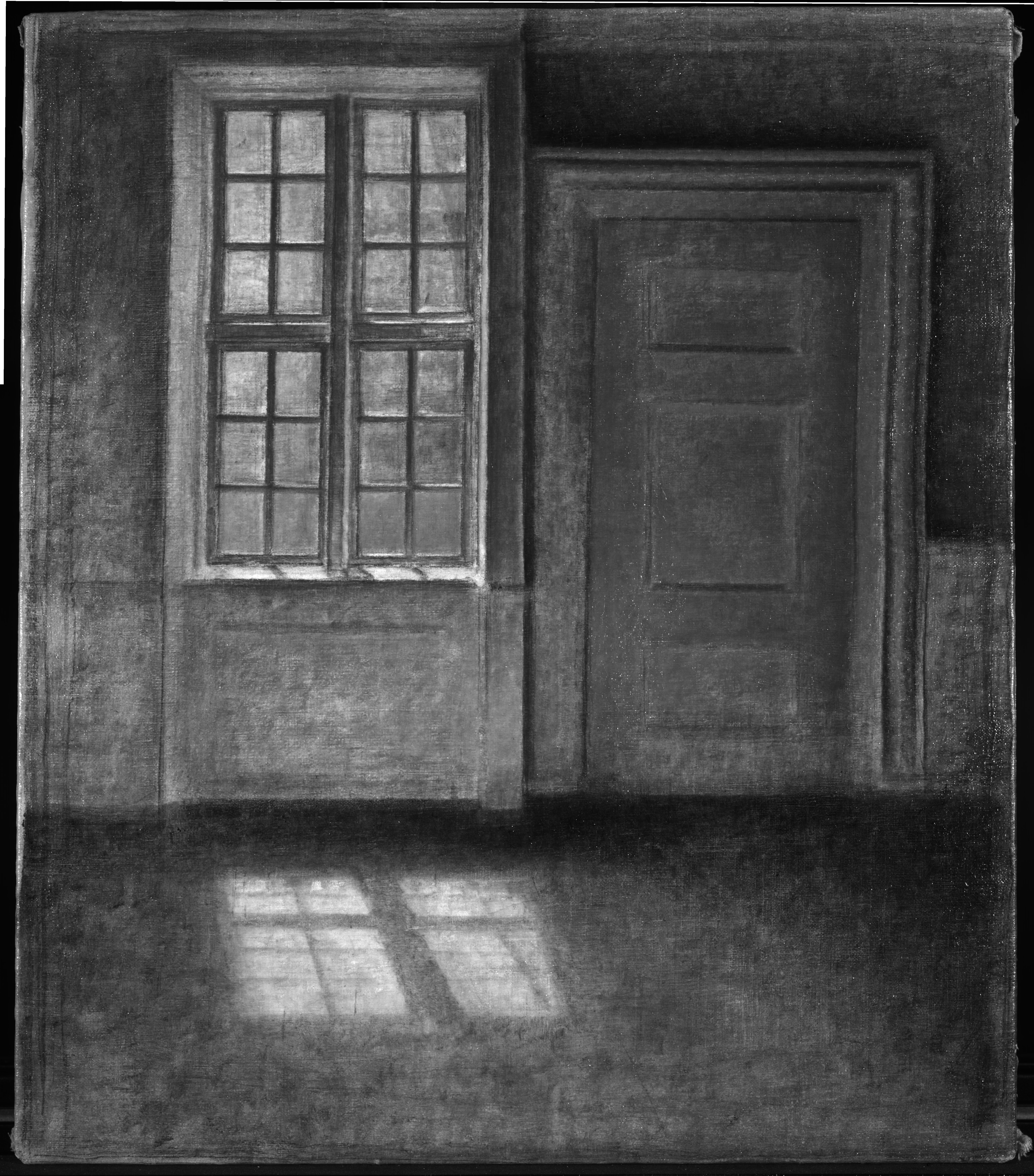 Paint layers are applied over the ground layer and are composed of pigments or colorants mixed with a binding medium. Throughout history, artists have used various binders. In the Middle Ages, egg yolk was commonly used in tempera painting for altar pieces, while during the Renaissance, oil became the preferred medium. In modern times, synthetic binders such as those found in acrylic paints are also widely used. In Hammershøi’s time, artists painted mainly with oil paint. The paint layer forms the visible image of the artwork and is often built up in multiple layers to create effects of color, texture, depth, and transparency.
