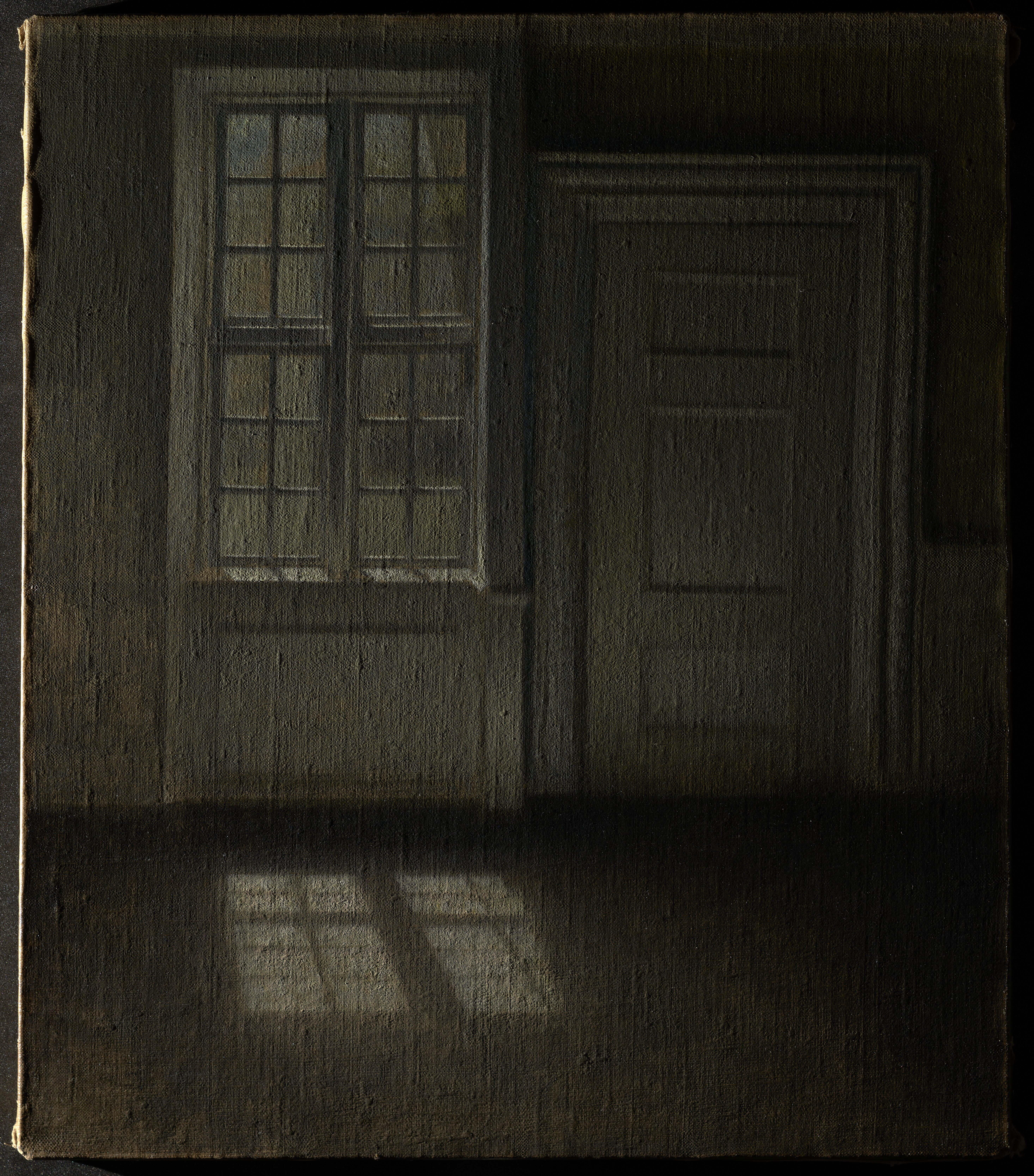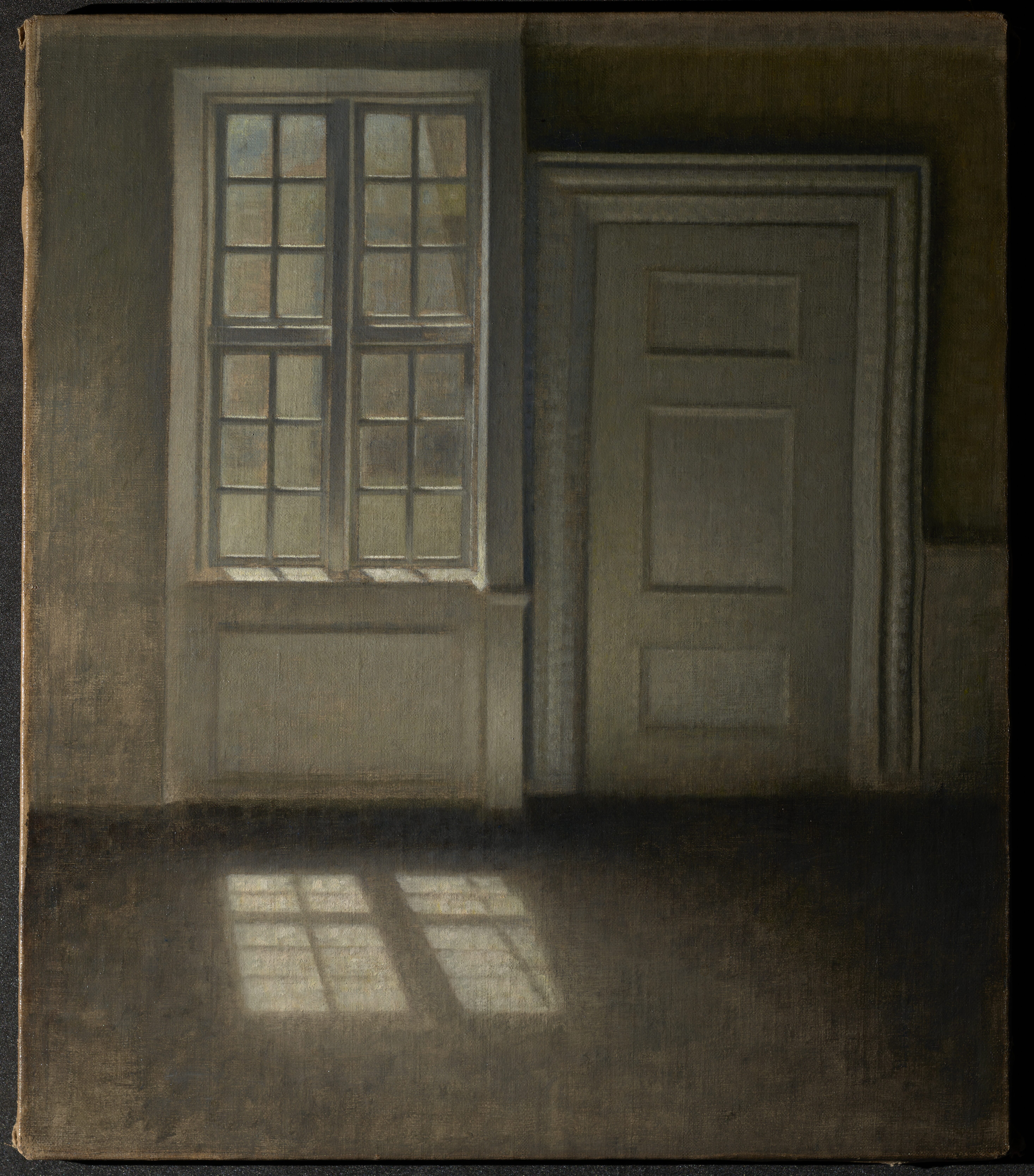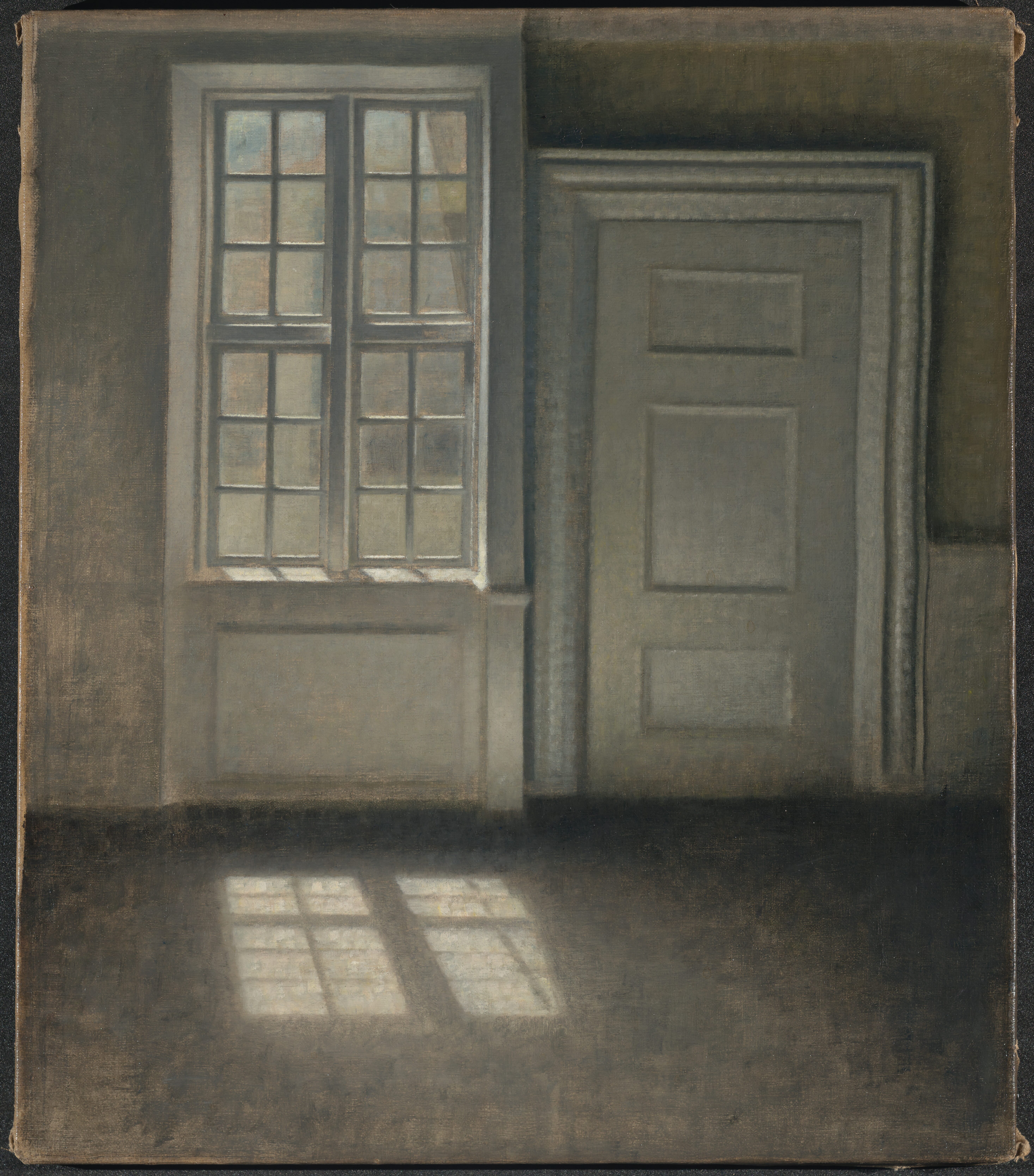 This particular window + door section seems to have been one of Hammershøis favourite spots in the apartment at Strandgade 30. He painted the light coming in at different times of the day and night with variations in the strokes and delicately toned color shades.