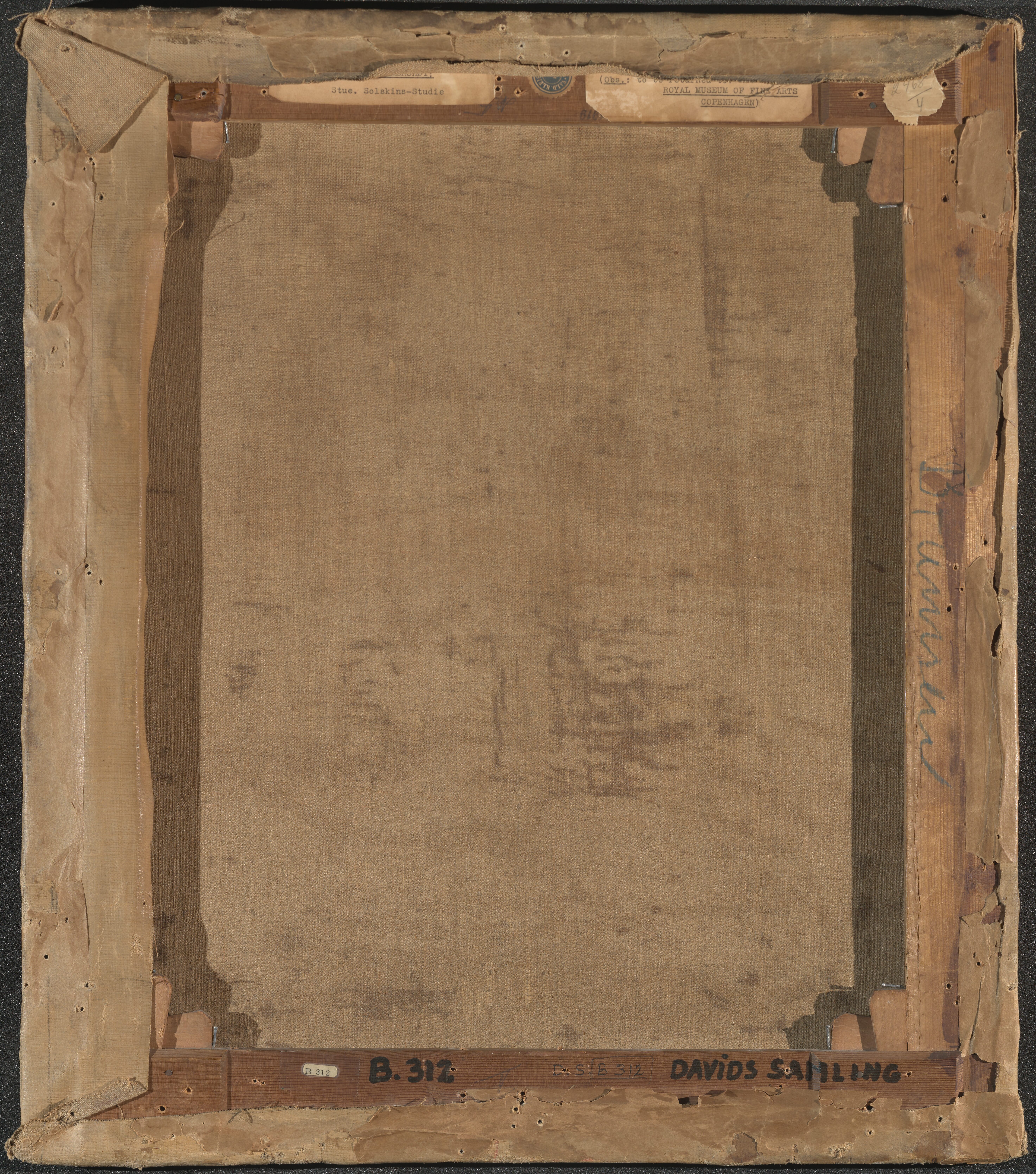 On the top bar are the following labels: two owner and transport labels associated with Alfred Bramsen, one of which partly covers a stamp reading '1919' (?) and the other partly covering an inscription in pencil reading 'Nr. 5' (?). Futher on the top bar are one circular (auction?) label with the digits 2468/4 and another circular label with 'Vald. Kleiss. Vesterbrogade 58'. On the rigthand bar, an inscription in blue crayon reads 'Bramsen'. On the bottom bar are inscriptions in black ink, reading 'B. 312 Davids samling', and, in pencil 'D.S. B 312' and a small label printed 'B 312'.