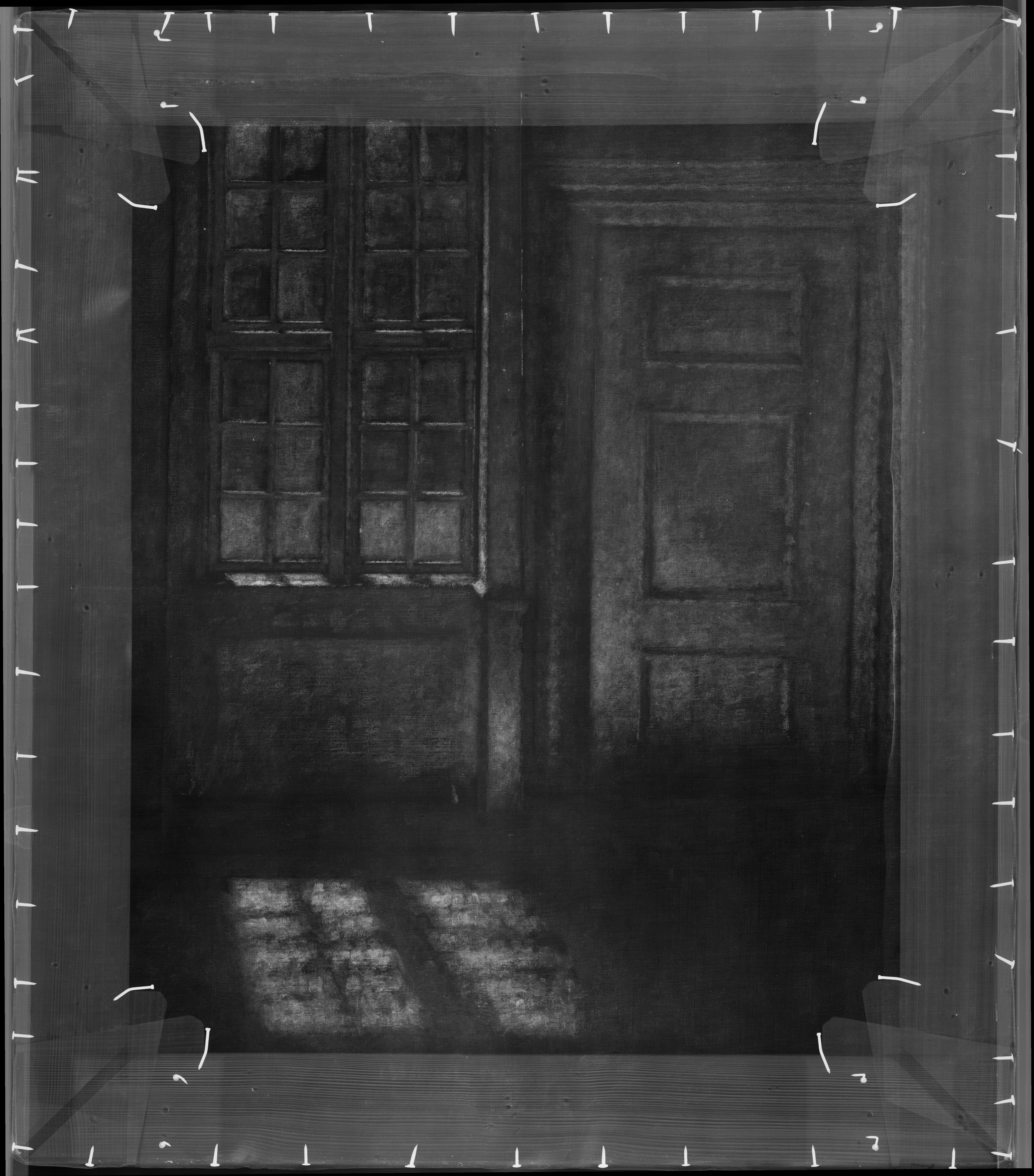 The canvas was stretched at a slight angle with the result that the composition is tilted a little towards the right. This, as well as the secondary cusping being slightly perceptible in the outline of the right-hand door frame, suggests that the stretching was perhaps not carried out by Hammershøi himself. The tacking edges, folded over the stretcher to the reverse of the painting, are partly covered with thin paper.