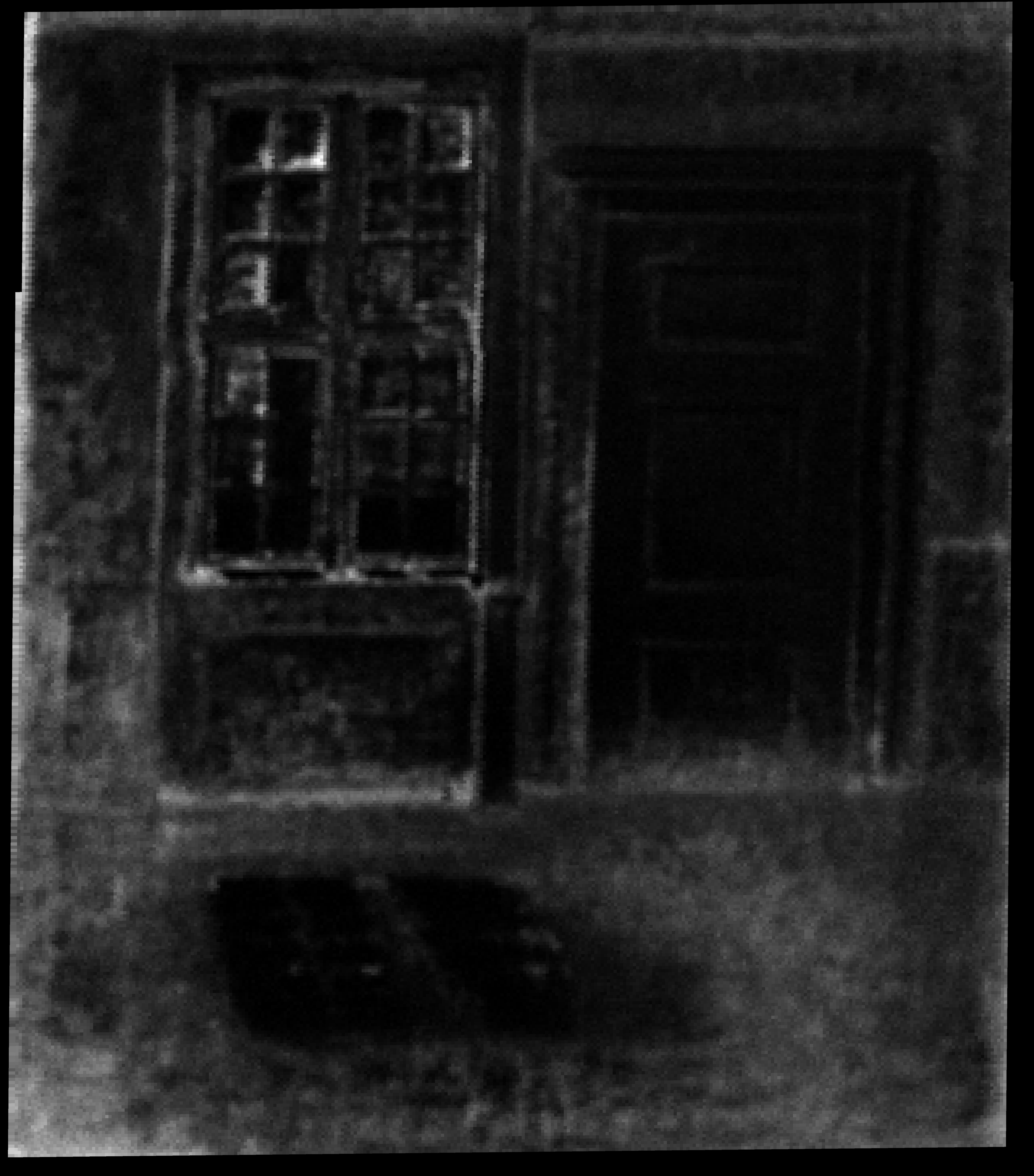 The composition was painted generally from dark to light with short brush strokes and a rather open brushwork leaving the ground and underdrawing visible in many places. The latter is particularly obvious in the window, in the left-hand side of the back wall, and in much of the floor. The modeling of the door frame and the door was carried out with mainly very short, narrow brush strokes and - in the doorframe - conspicuously perpendicular to the longitudinal direction. The brushwork in the back wall are generally vertically orientated while the brush strokes of the floor have no predominant direction.