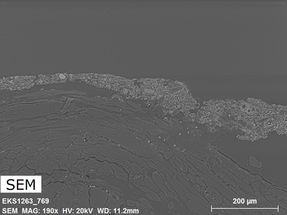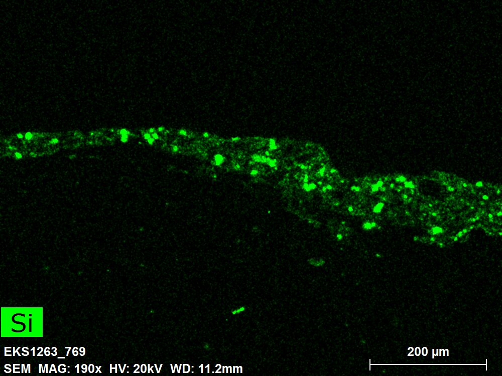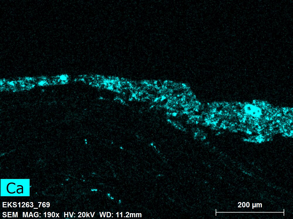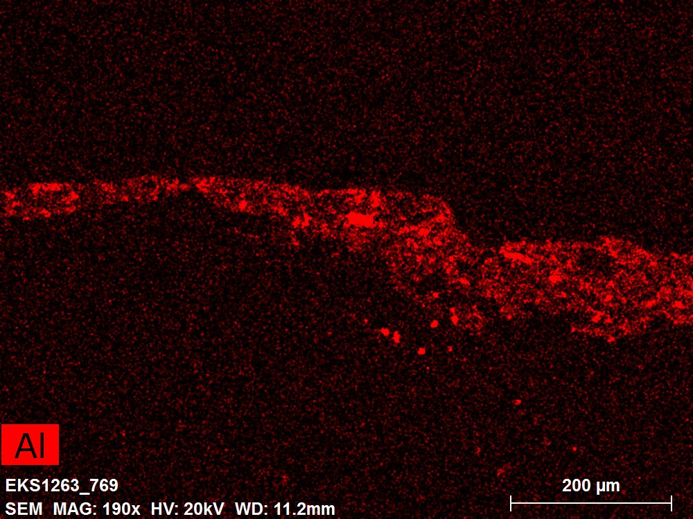 SEM-EDXS is a technique that provides highly detailed images at the microscopic level while simultaneously identifying the elemental composition of a sample. It is particularly valuable for studying the stratigraphy of paint cross sections at very fine scales, for the chemical characterisation of pigments, fillers and degradation products, and for detecting trace elements that may indicate very specific materials. Below, the elements listed in parentheses refer to minor elements whose relative abundance is below 10% of the total signal. The F1 map below represents the Pb M line. Read more under SEM-EDXS in the glossary.