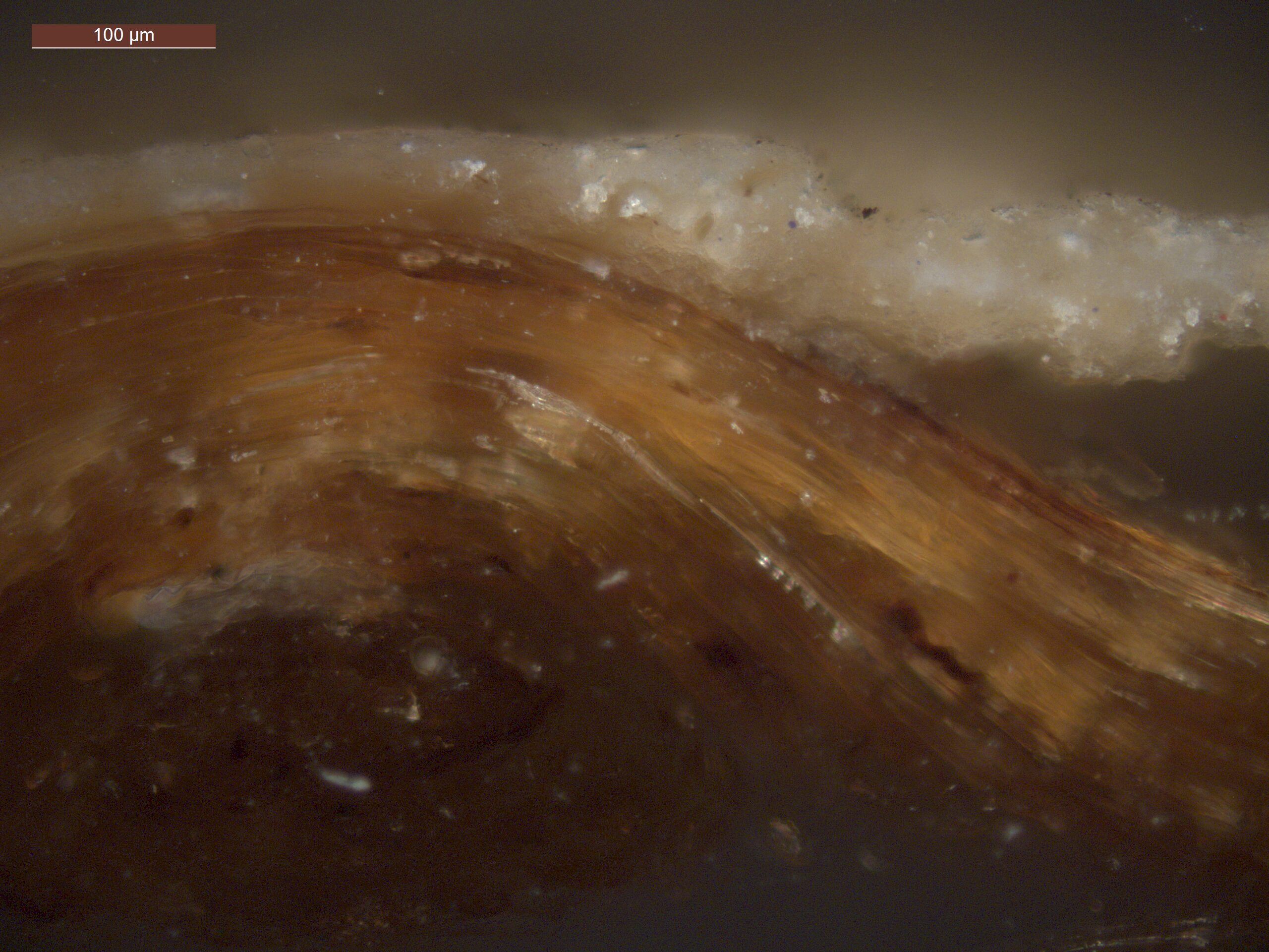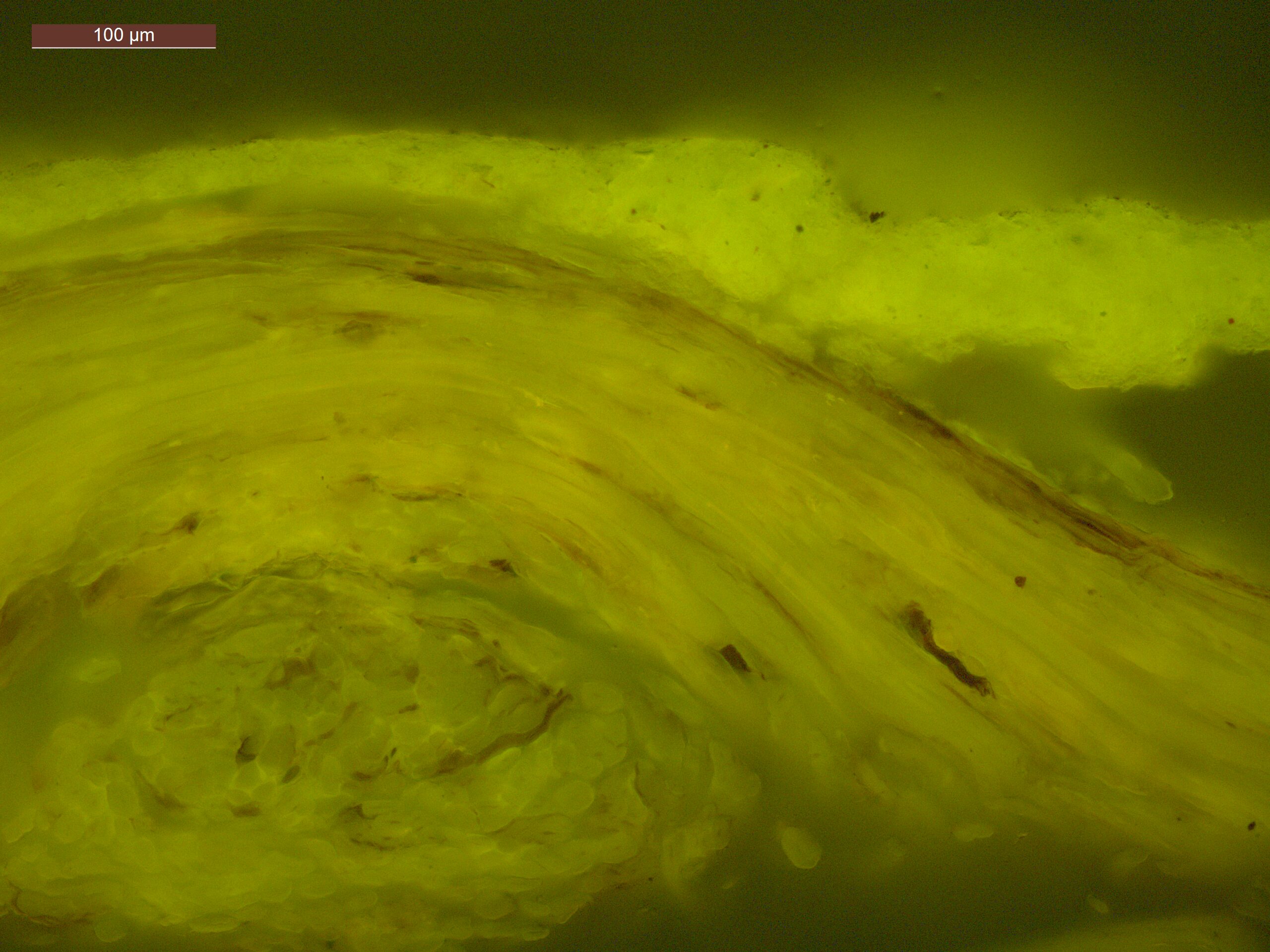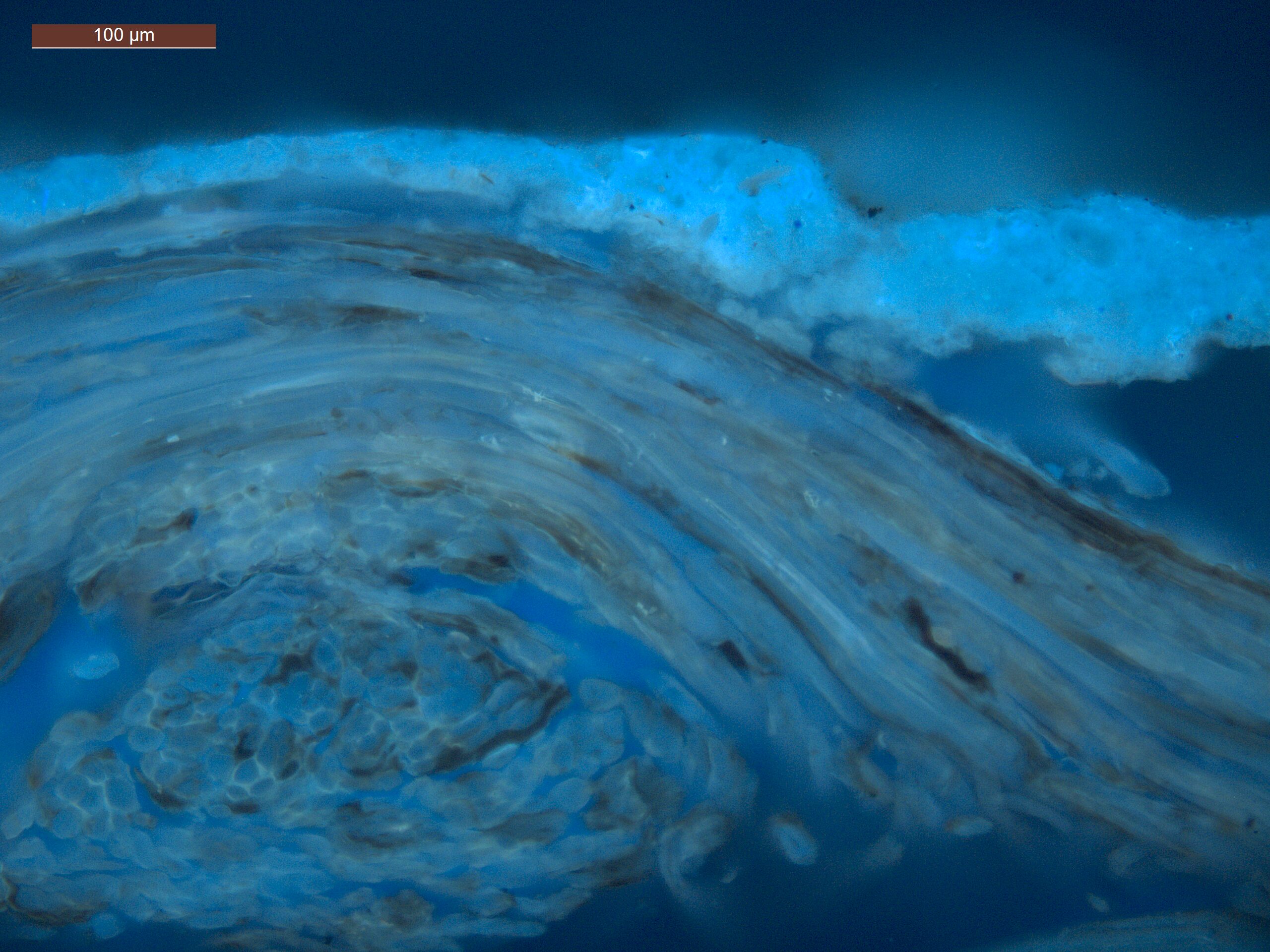 Optical microscopy uses visible light and lenses to magnify and examine the surface and structure of a painting. When applied to cross sections of paint samples, it allows for detailed observation of a painting’s stratigraphy (layer structure) and pigment particles. It is often employed with various illumination techniques, such as dark field and UV fluorescence, to enhance the analysis. Layer number 1 in the results section below the images refers to the layer at the bottom of the cross section.