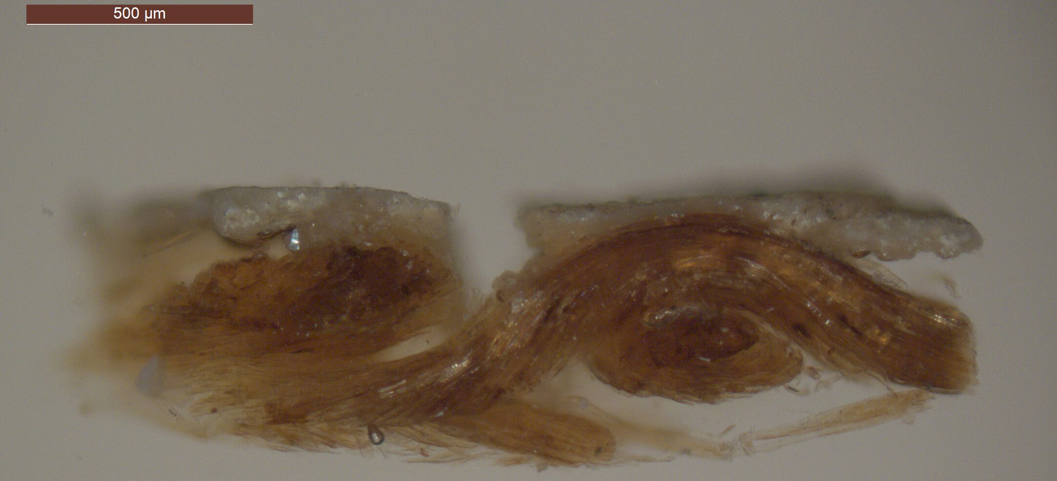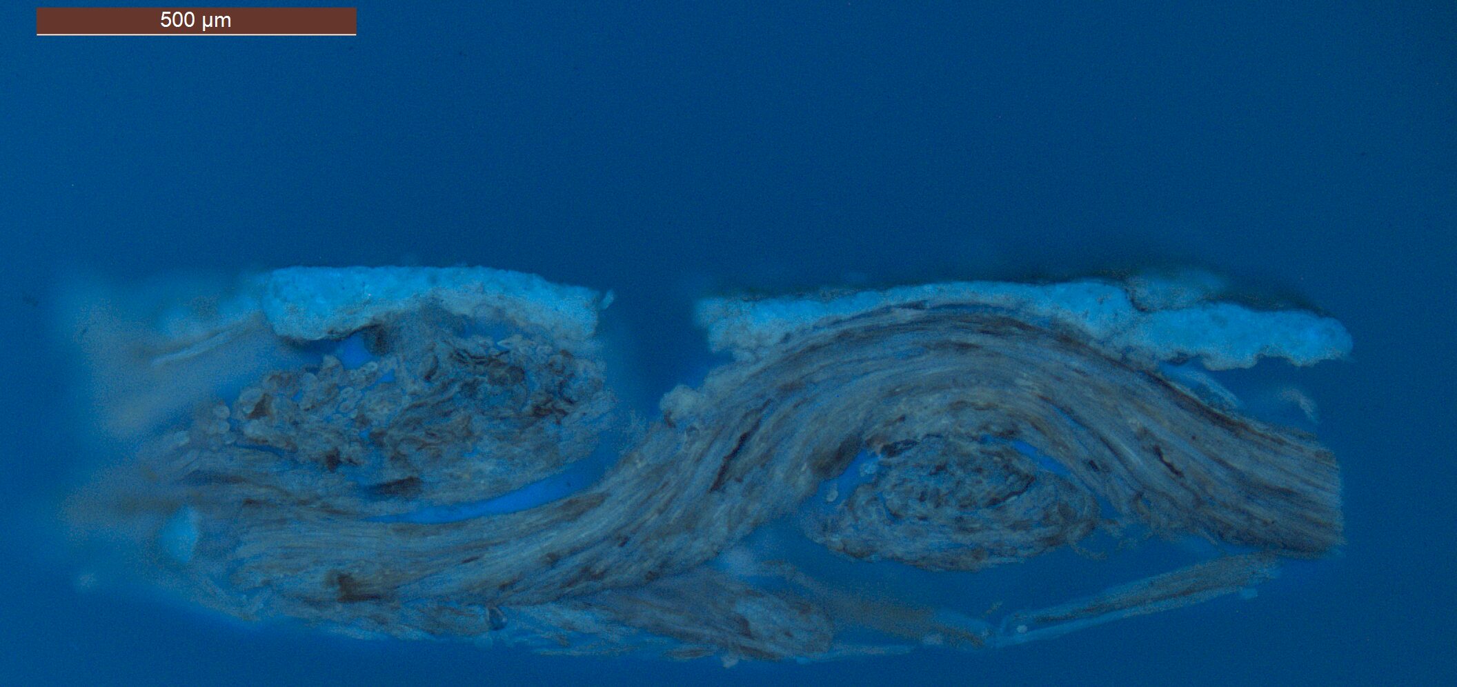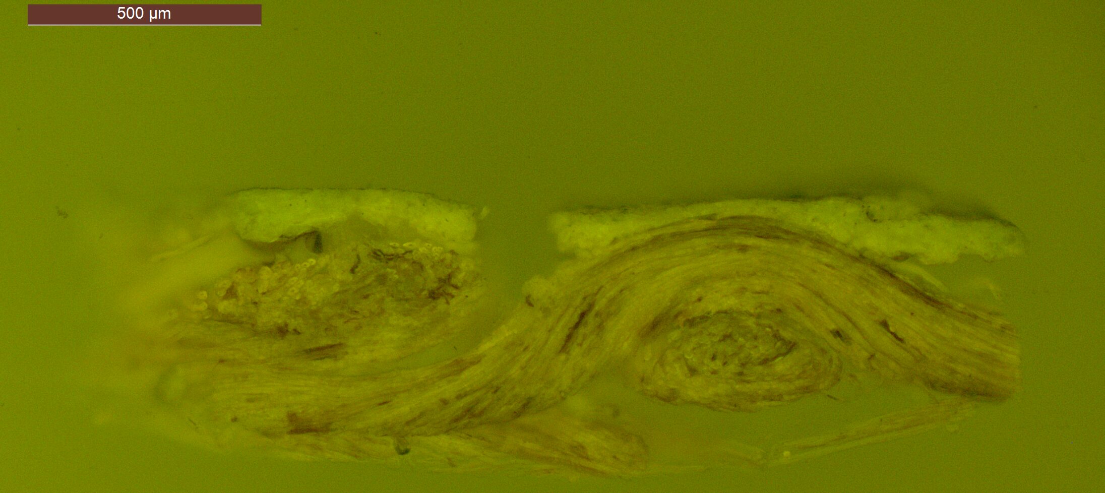 Optical microscopy uses visible light and lenses to magnify and examine the surface and structure of a painting. When applied to cross sections of paint samples, it allows for detailed observation of a painting’s stratigraphy (layer structure) and pigment particles. It is often employed with various illumination techniques, such as dark field and UV fluorescence, to enhance the analysis. Layer number 1 in the results section below the images refers to the layer at the bottom of the cross section.