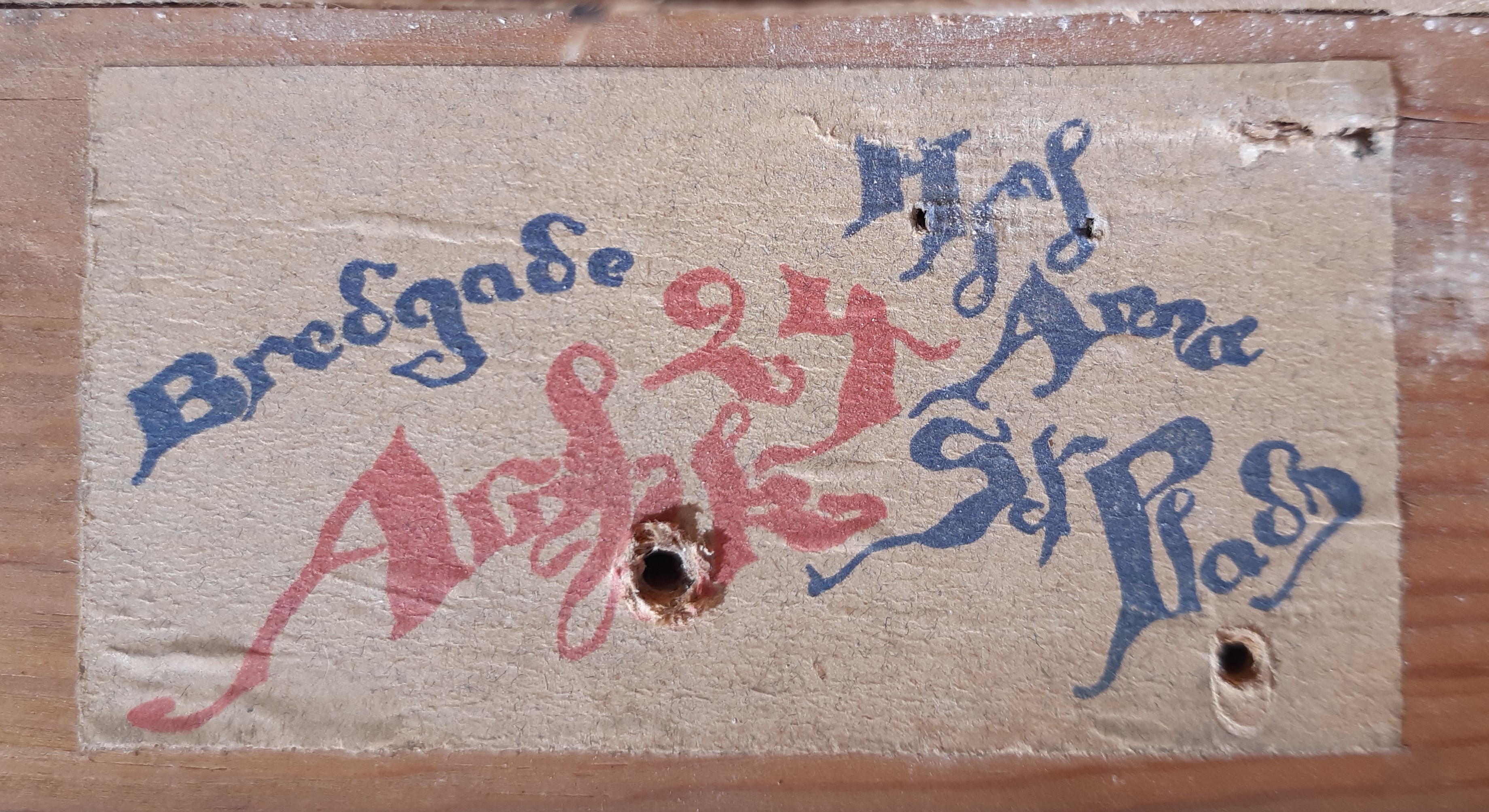 The print on the label reads 'Bredgade Hj af Skt Annæ Plads' / A[….] 24'.