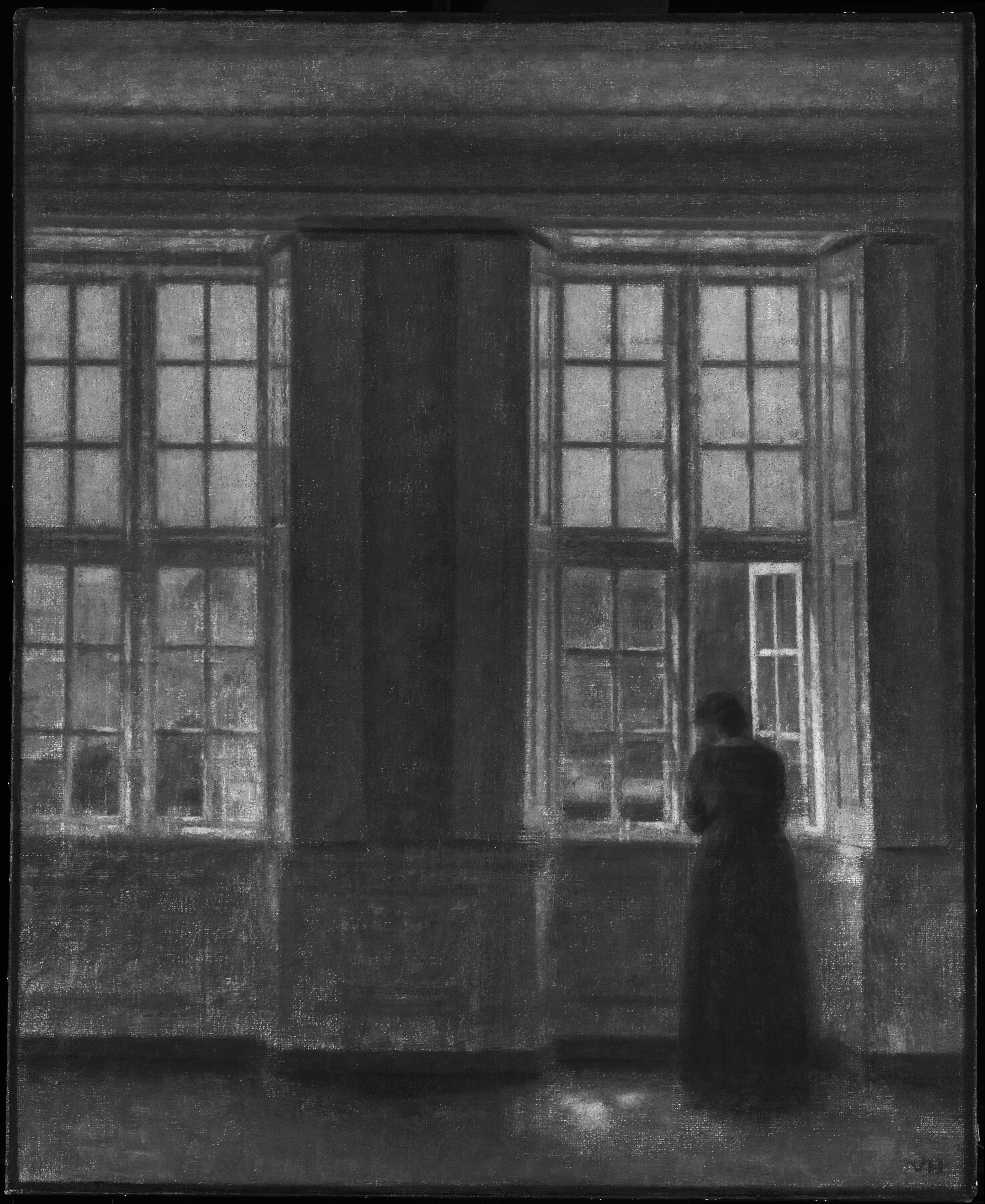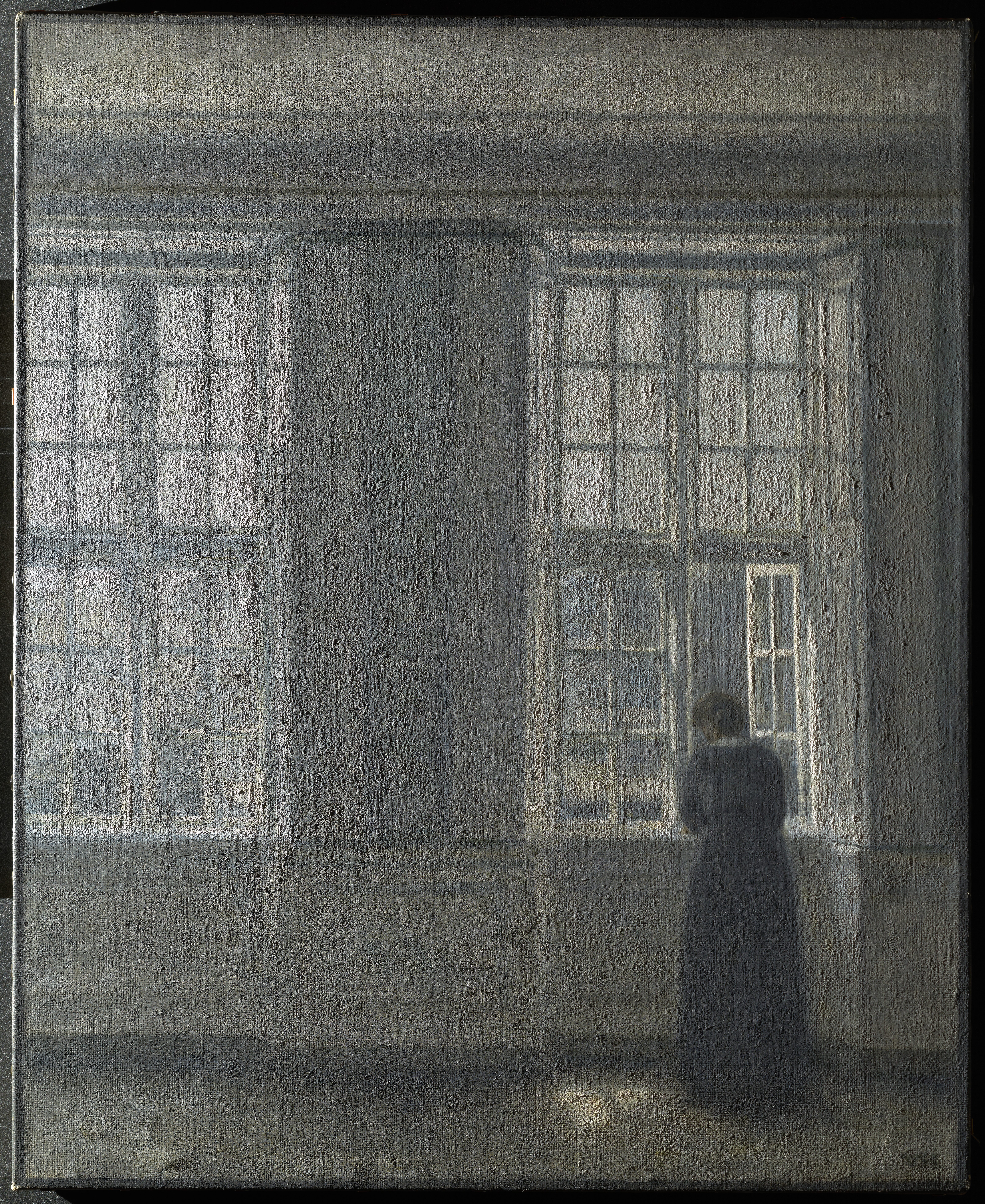 Paint layers are applied over the ground layer and are composed of pigments or colorants mixed with a binding medium. Throughout history, artists have used various binders. In the Middle Ages, egg yolk was commonly used in tempera painting for altar pieces, while during the Renaissance, oil became the preferred medium. In modern times, synthetic binders such as those found in acrylic paints are also widely used. In Hammershøi’s time, artists painted mainly with oil paint. The paint layer forms the visible image of the artwork and is often built up in multiple layers to create effects of color, texture, depth, and transparency.