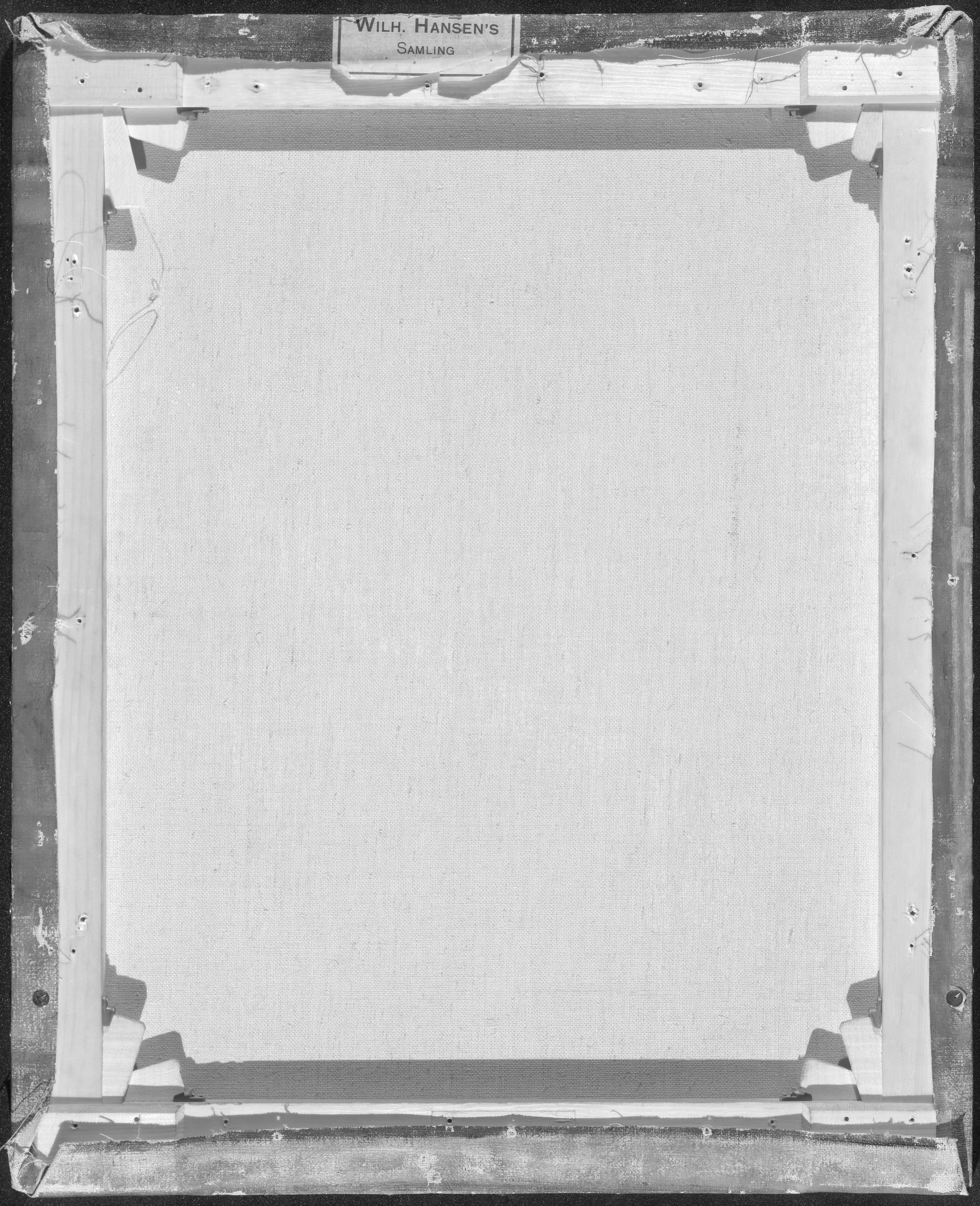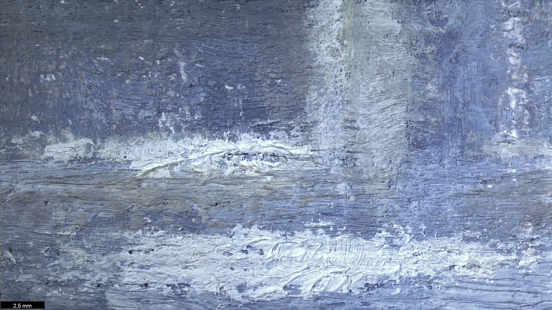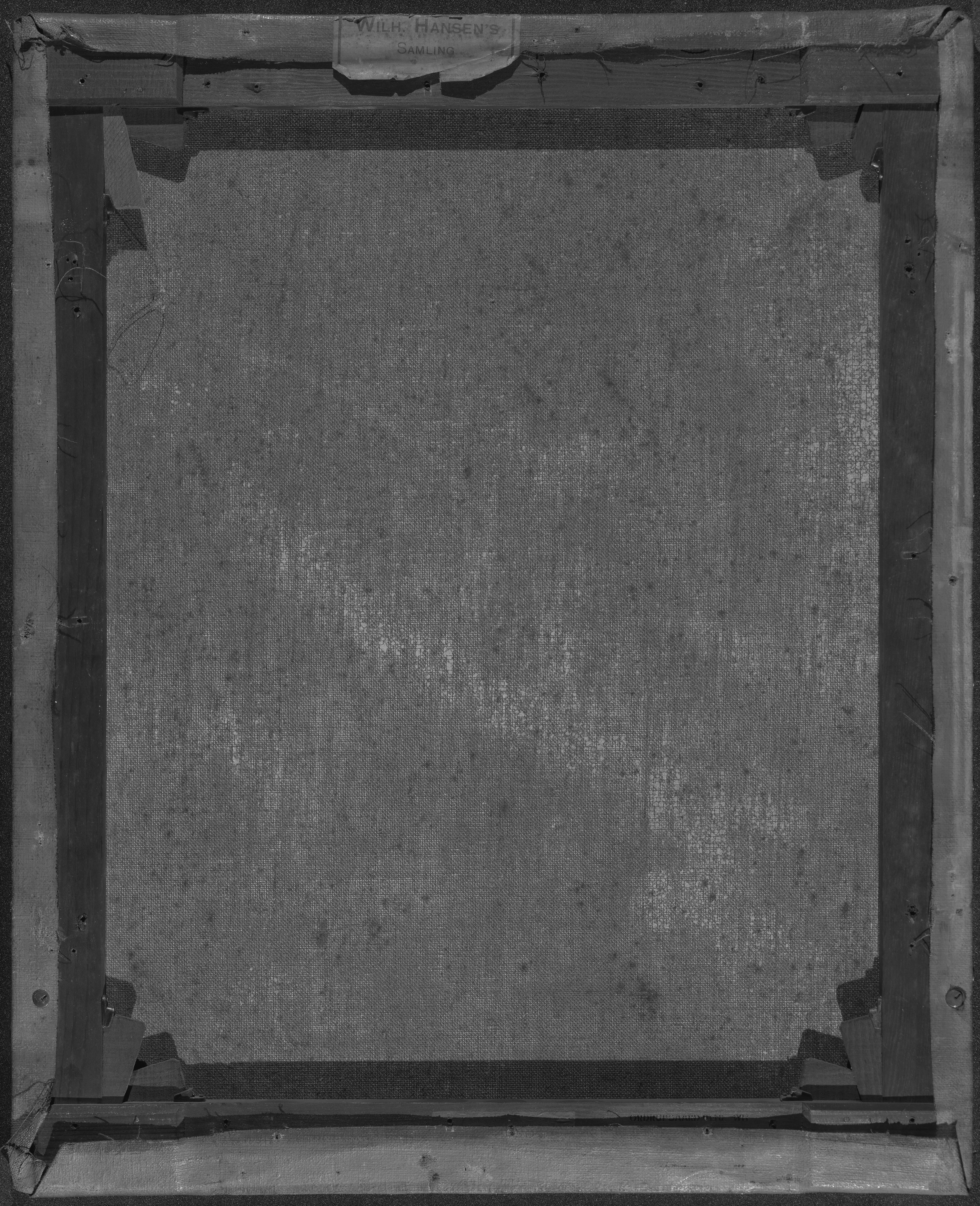 The ground layer is a preparatory layer applied directly to the support to create a smooth surface for painting. It is typically opaque and monochrome in color, providing a neutral base that influences the subsequent application of paint layers and the final appearance of the painting. The composition of the ground layer varies depending on the type of support and the historical period of the artwork. Hammershøi typically painted on white and industrially primed canvasses.