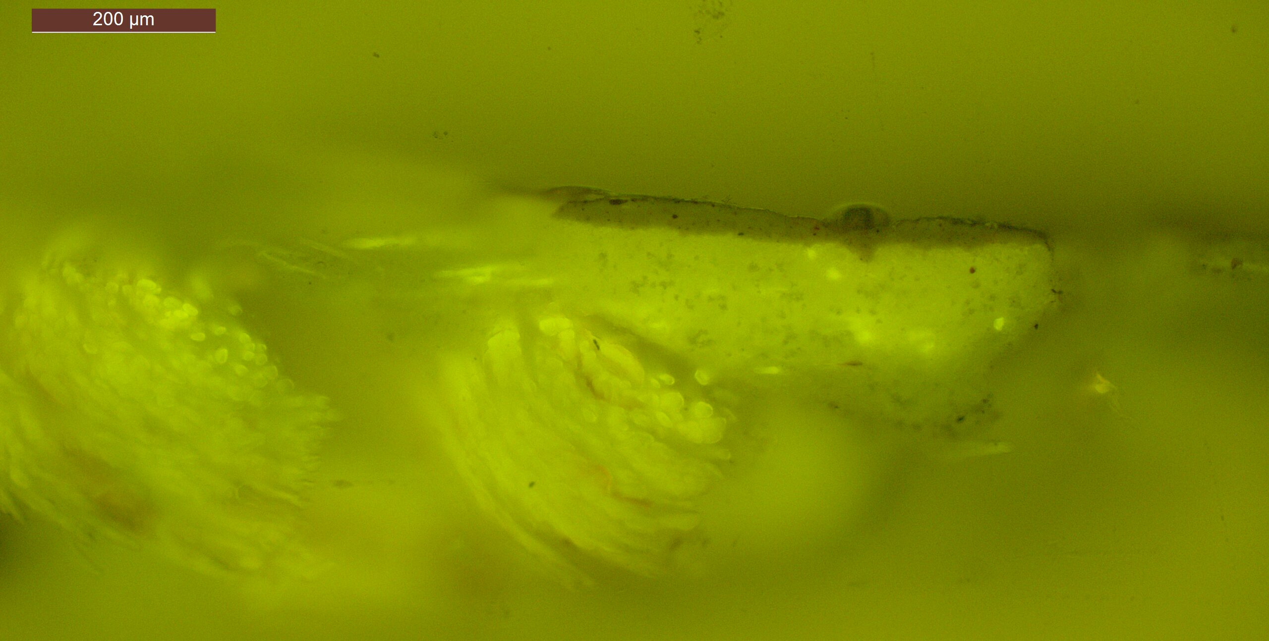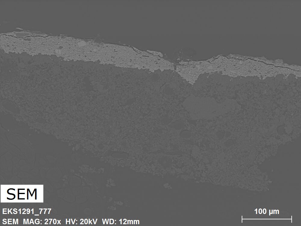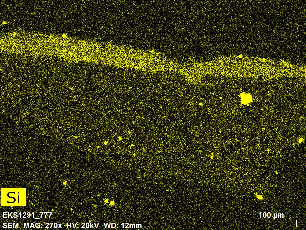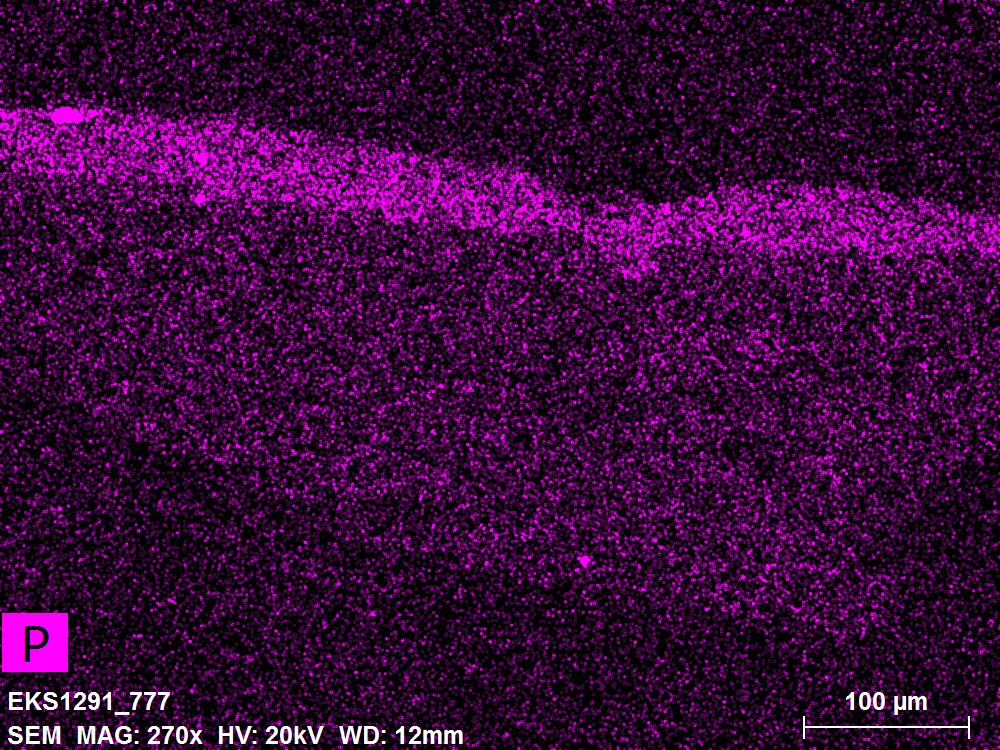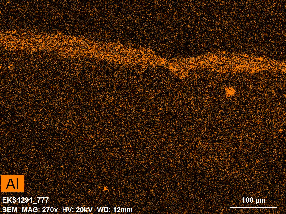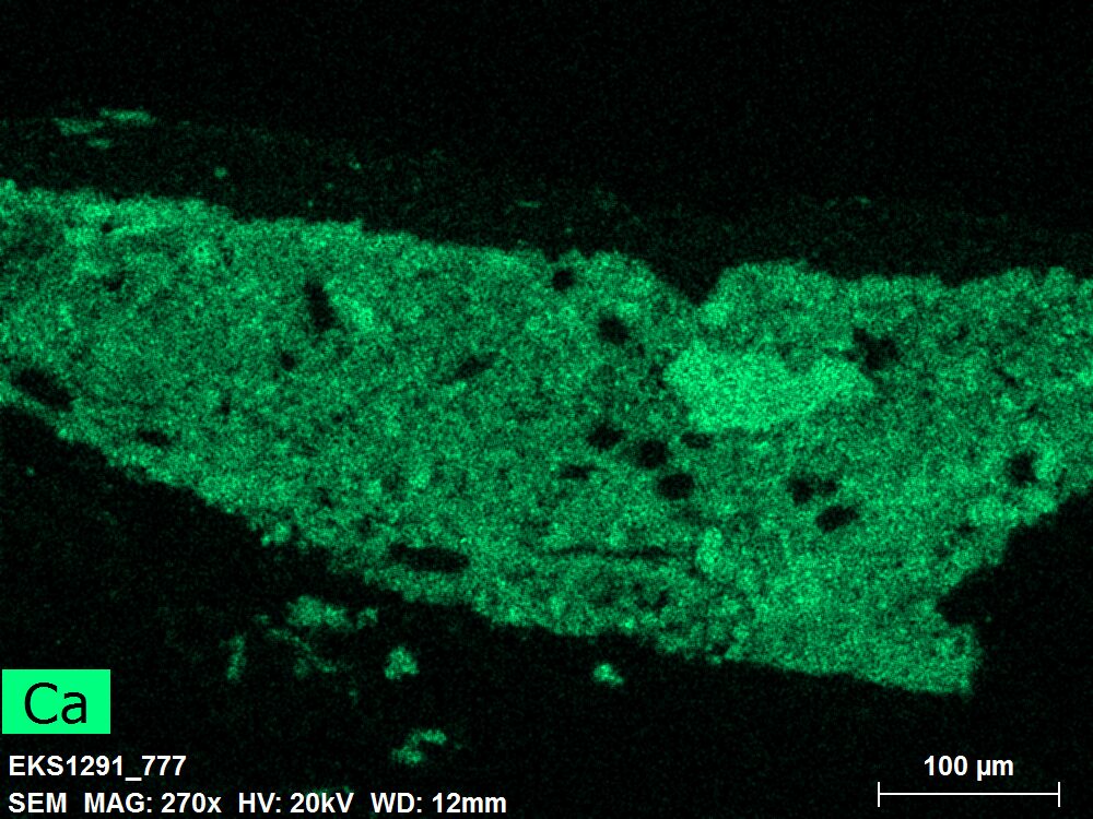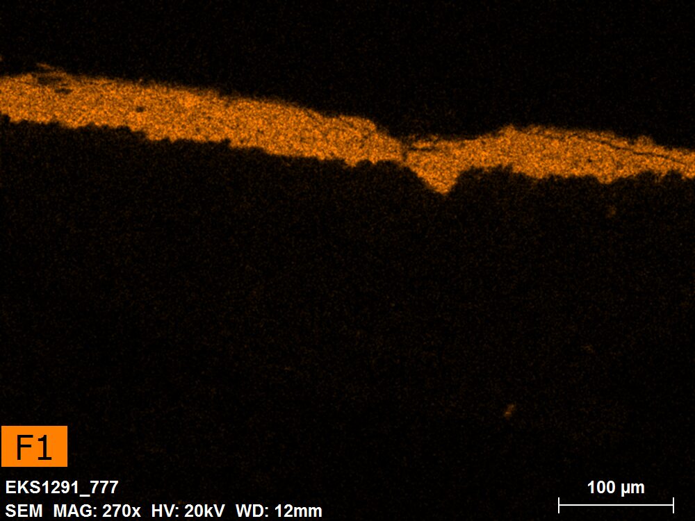 SEM-EDXS is a technique that provides highly detailed images at the microscopic level while simultaneously identifying the elemental composition of a sample. It is particularly valuable for studying the stratigraphy of paint cross sections at very fine scales, for the chemical characterisation of pigments, fillers and degradation products, and for detecting trace elements that may indicate very specific materials. Below, the elements listed in parentheses refer to minor elements whose relative abundance is below 10% of the total signal. The F1 map below represents the Pb M line. Read more under SEM-EDXS in the glossary.