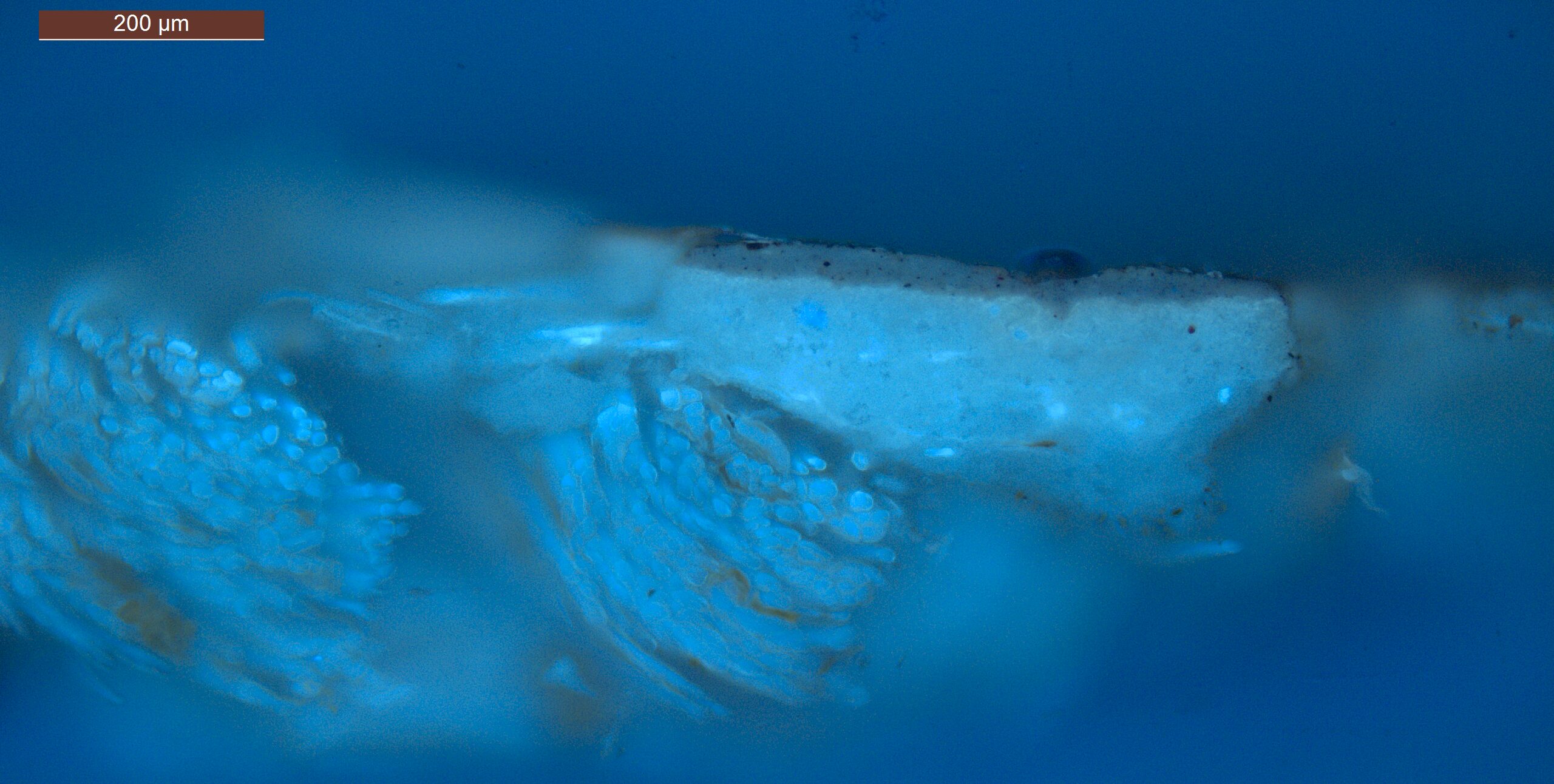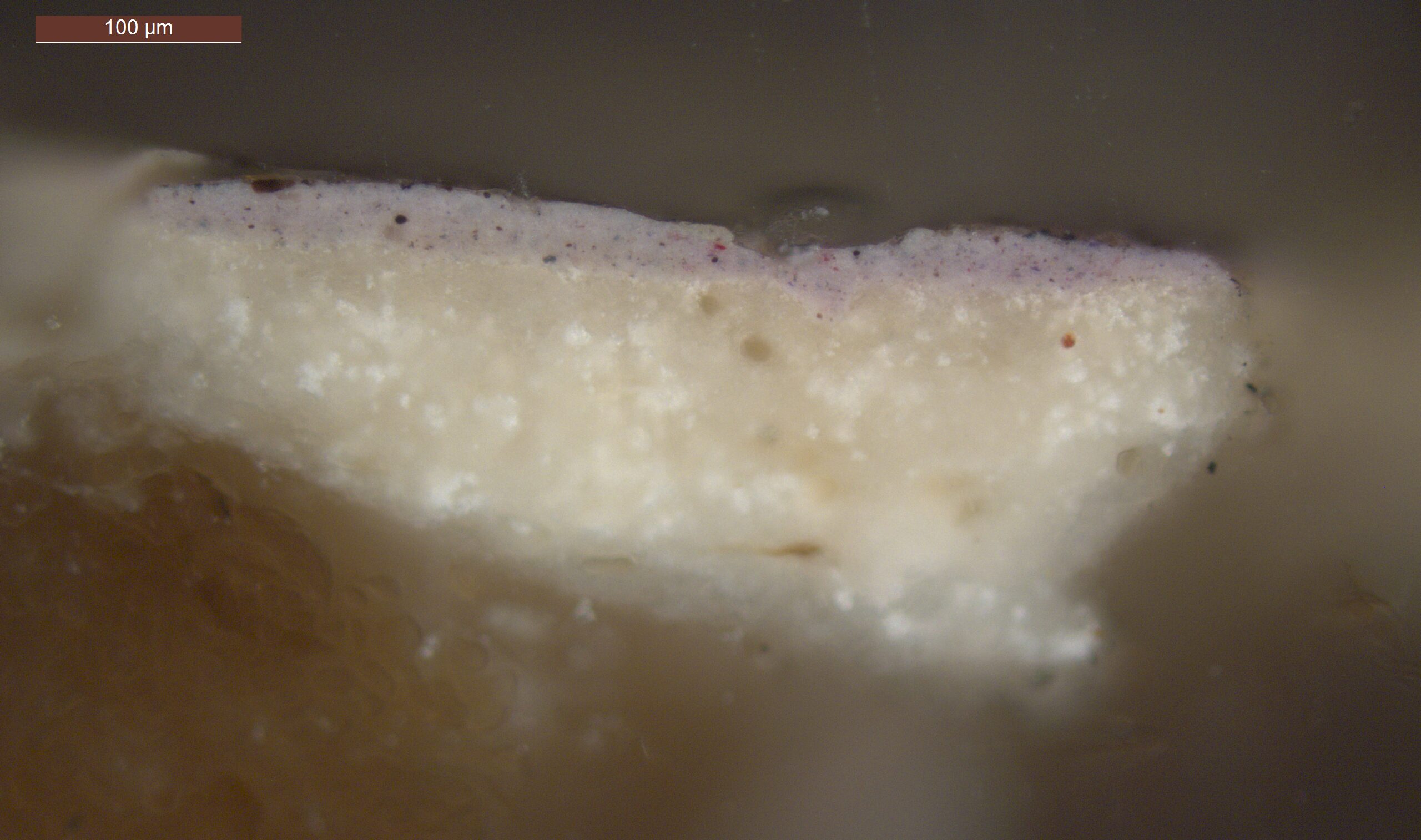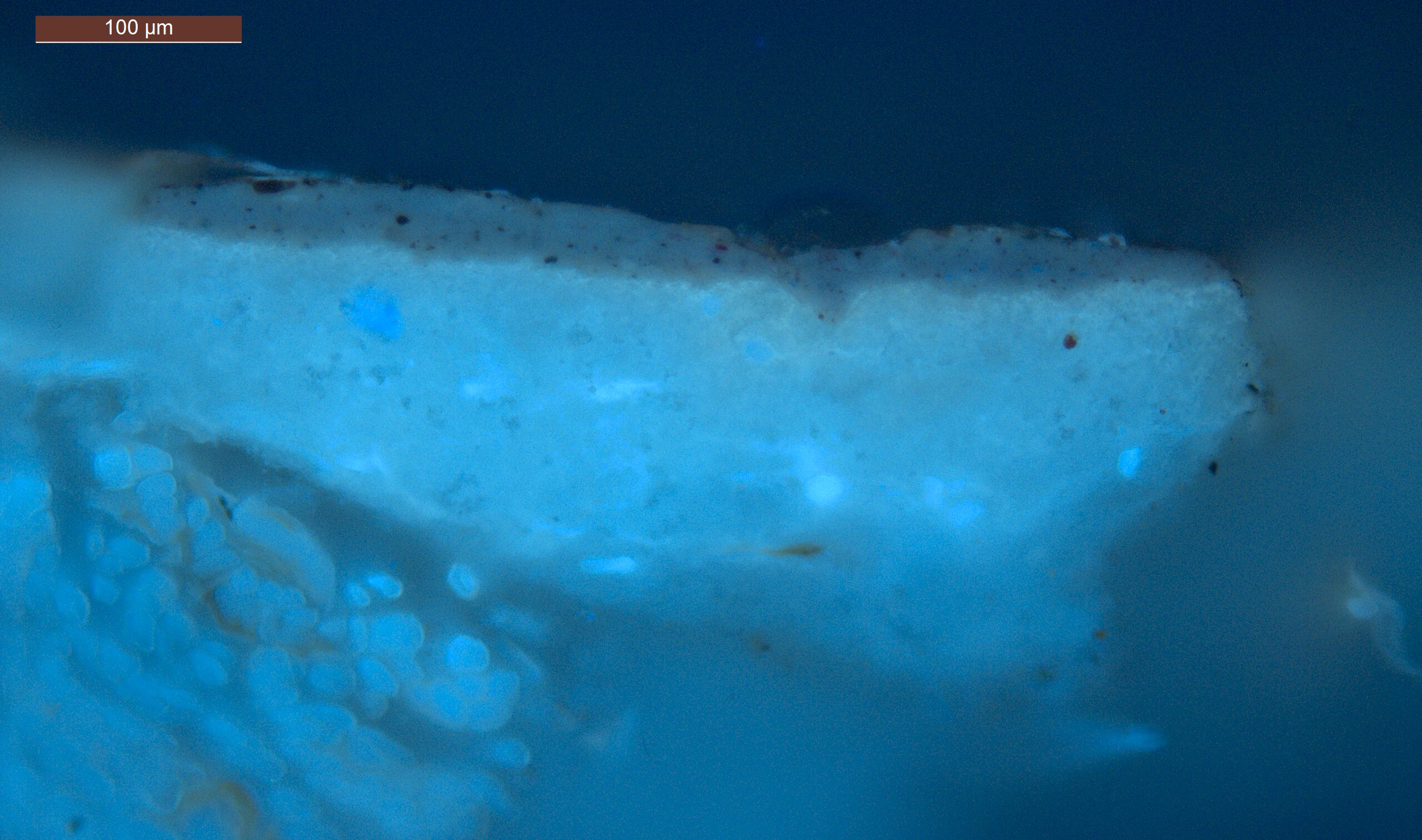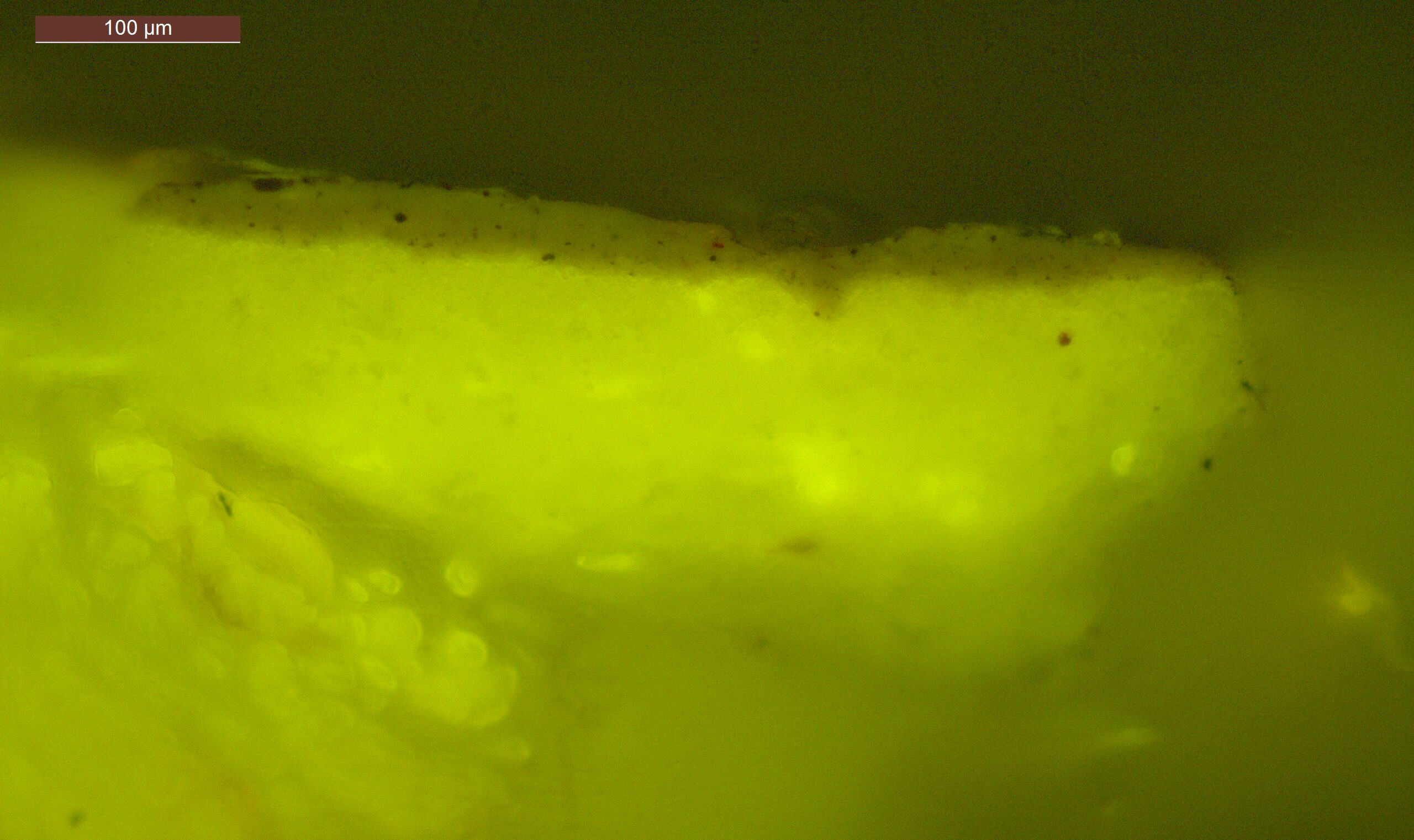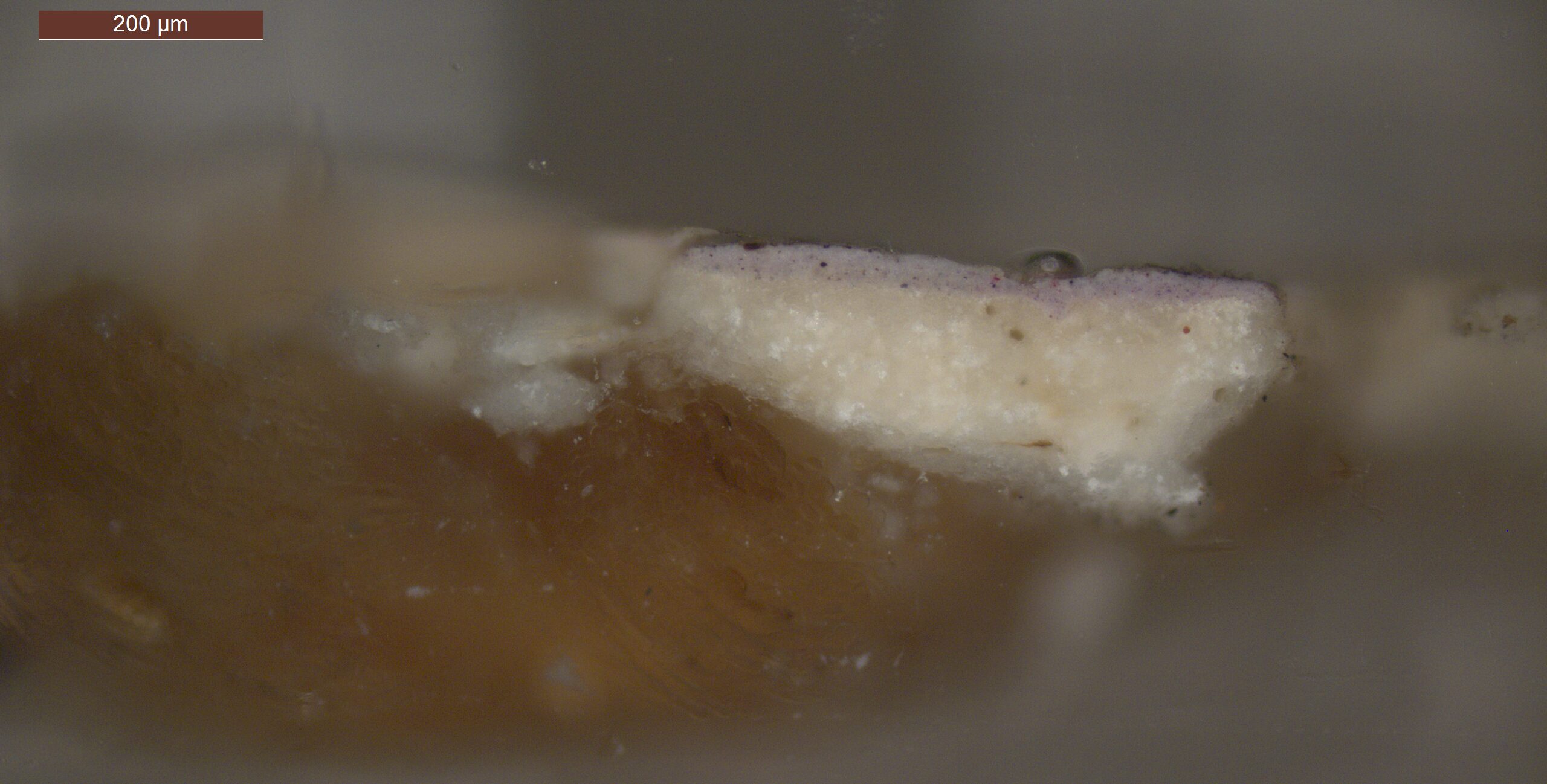 Optical microscopy uses visible light and lenses to magnify and examine the surface and structure of a painting. When applied to cross sections of paint samples, it allows for detailed observation of a painting’s stratigraphy (layer structure) and pigment particles. It is often employed with various illumination techniques, such as dark field and UV fluorescence, to enhance the analysis. Layer number 1 in the results section below the images refers to the layer at the bottom of the cross section.
