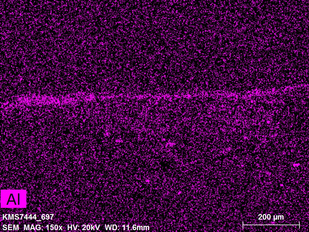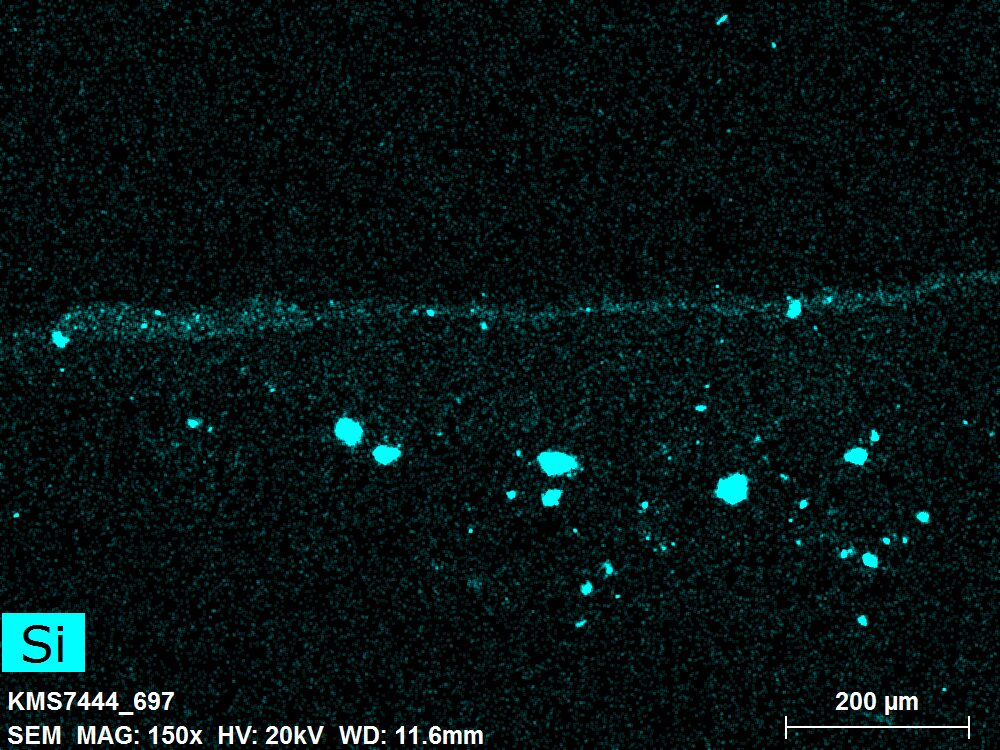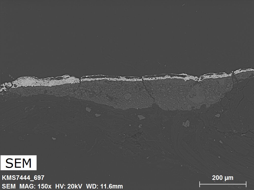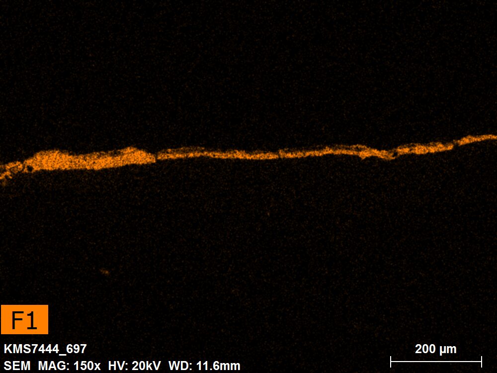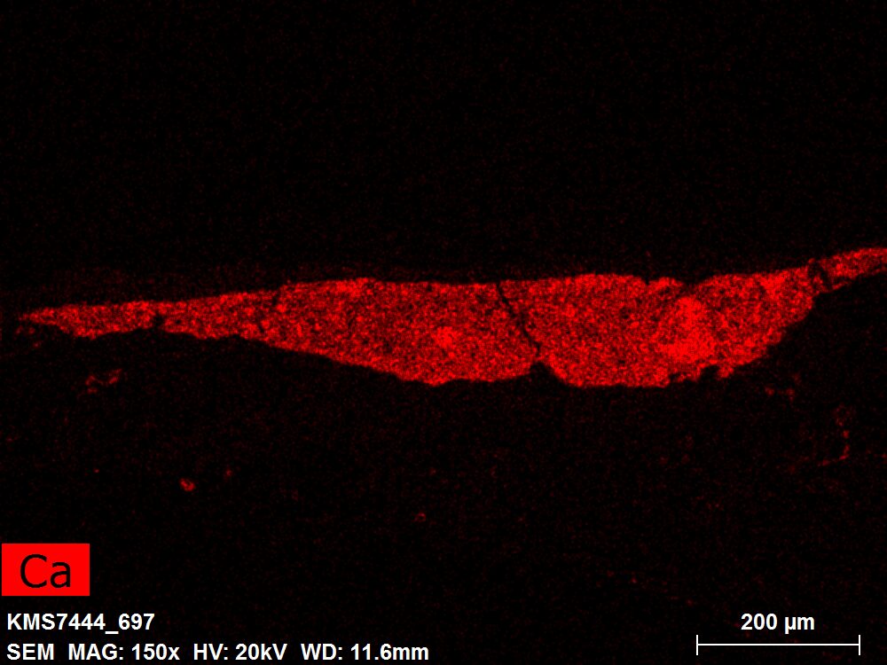 SEM-EDXS is a technique that provides highly detailed images at the microscopic level while simultaneously identifying the elemental composition of a sample. It is particularly valuable for studying the stratigraphy of paint cross sections at very fine scales, for the chemical characterisation of pigments, fillers and degradation products, and for detecting trace elements that may indicate very specific materials. Below, the elements listed in parentheses refer to minor elements whose relative abundance is below 10% of the total signal. The F1 map below represents the Pb M line. Read more under SEM-EDXS in the glossary.