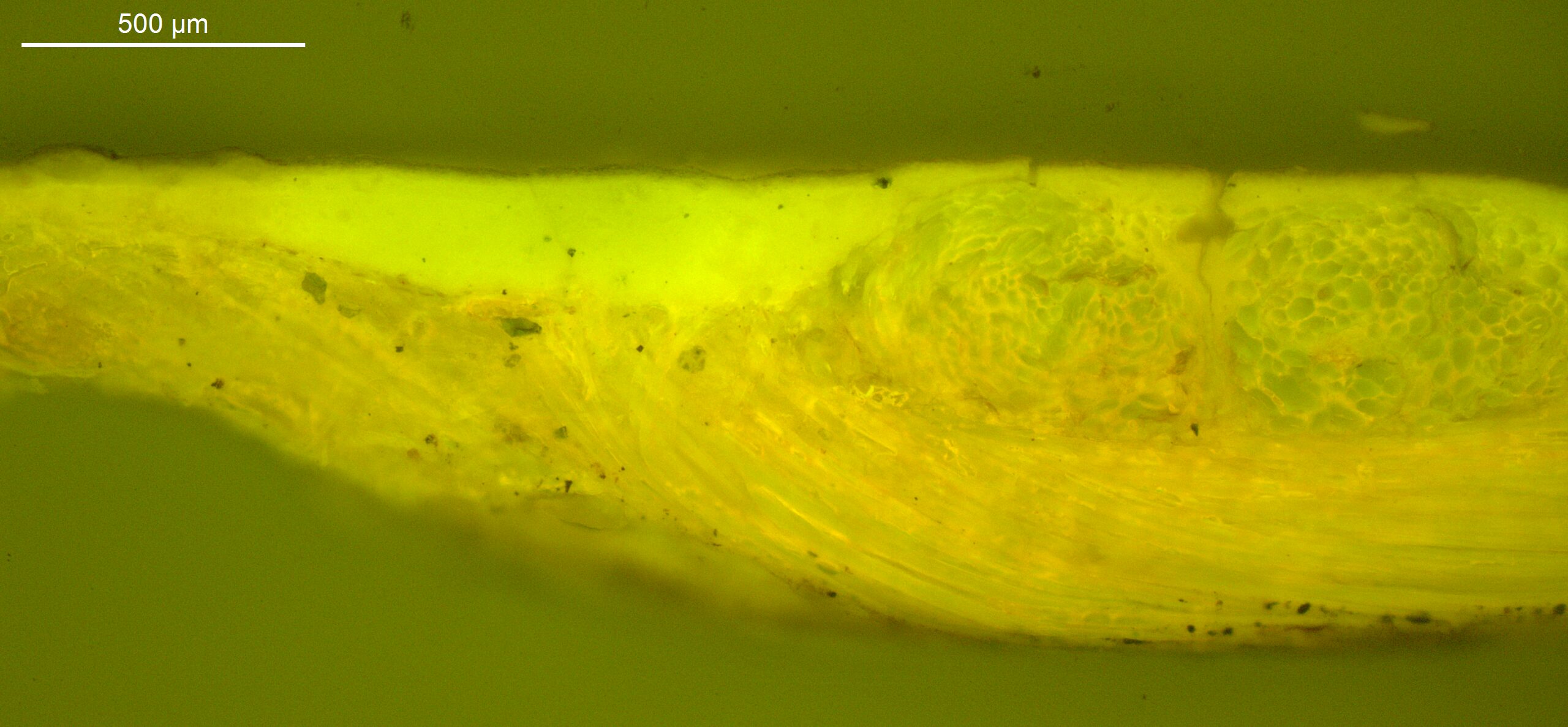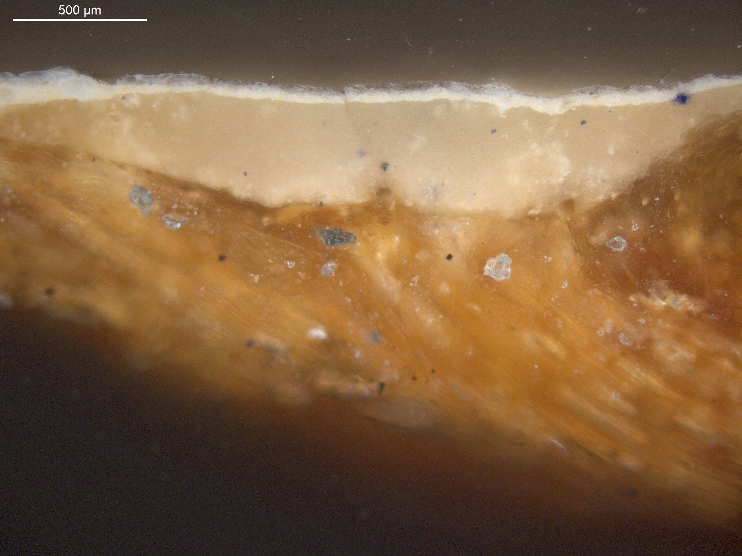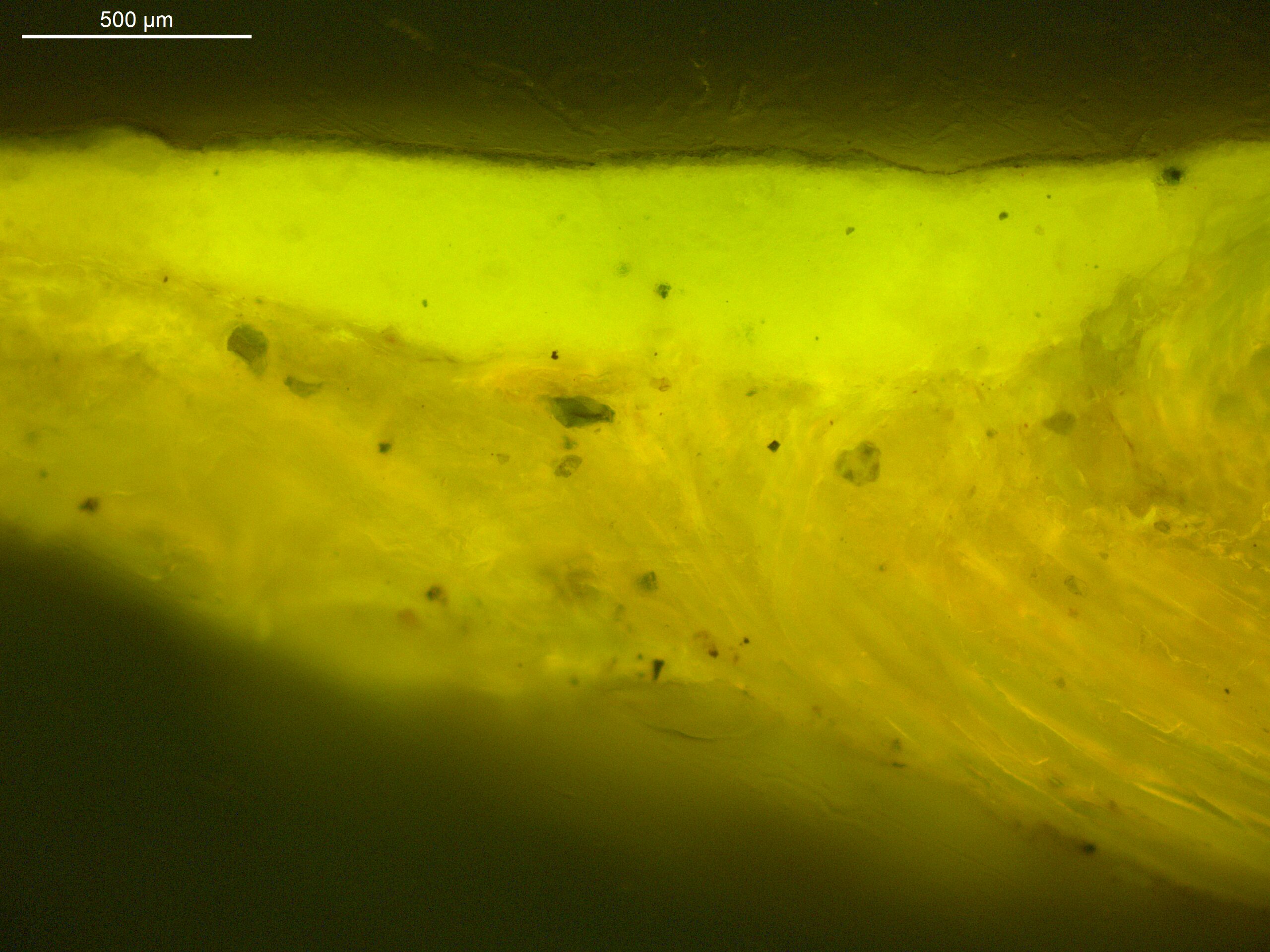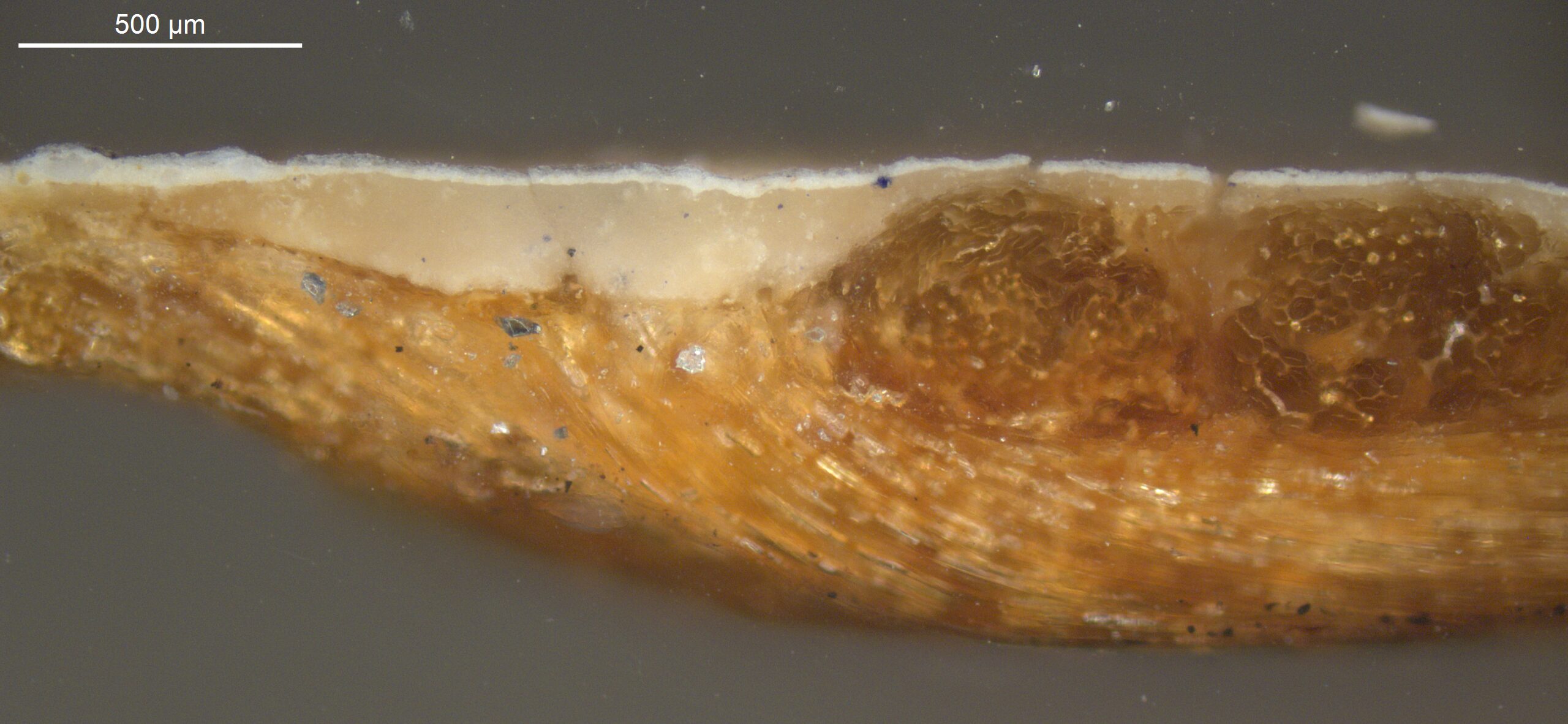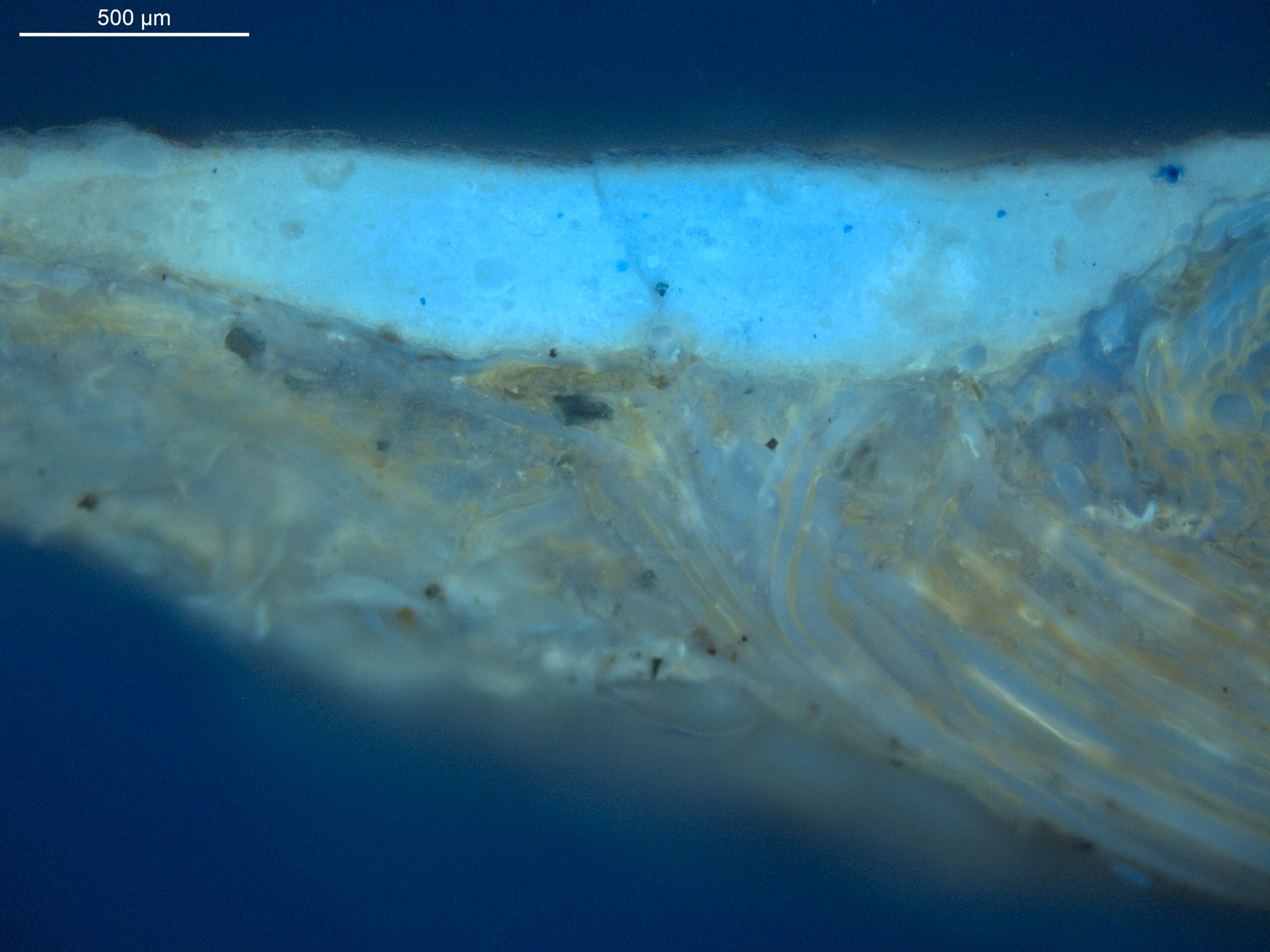 Optical microscopy uses visible light and lenses to magnify and examine the surface and structure of a painting. When applied to cross sections of paint samples, it allows for detailed observation of a painting’s stratigraphy (layer structure) and pigment particles. It is often employed with various illumination techniques, such as dark field and UV fluorescence, to enhance the analysis. Layer number 1 in the results section below the images refers to the layer at the bottom of the cross section.