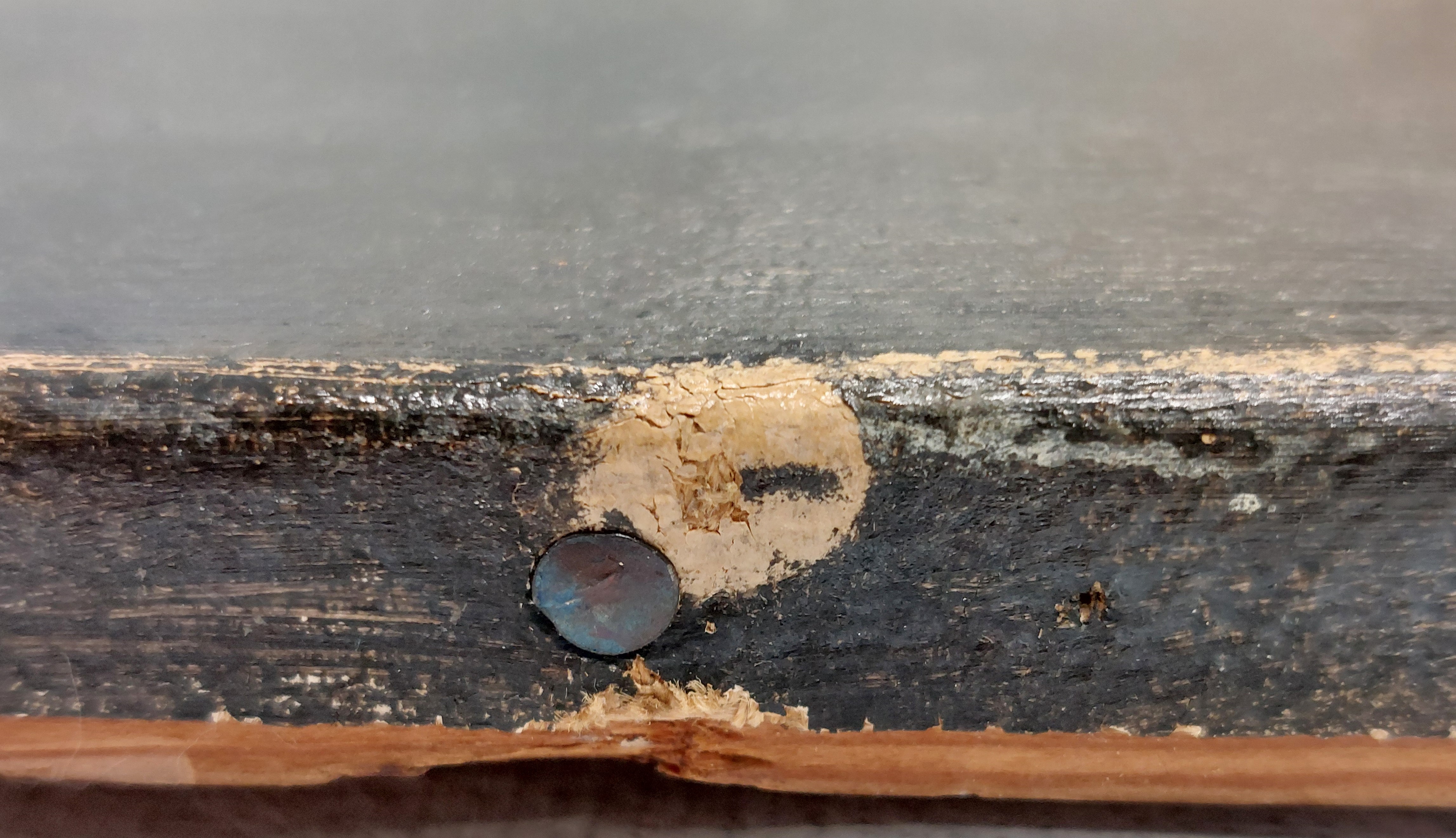 Black underpaint has been scraped off the horisontal edge at the bottom left-hand corner. The outlines of the sofa seat on the right was also scratched into the black underpaint.