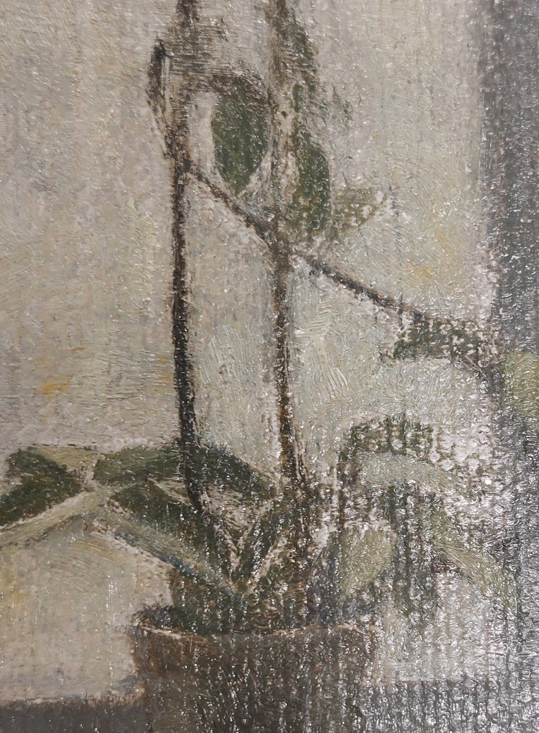 The ground is exposed in several places such as the panel in the corner under the window, along the left-hand edge at the window, and in the reserved area surrounding the plant in the window. It is also visible in reserves in the paint of the sofa, in the the top right-hand side of the wall and in the reserves along the figure's chest and at the back of the neckline in the dress of the woman.