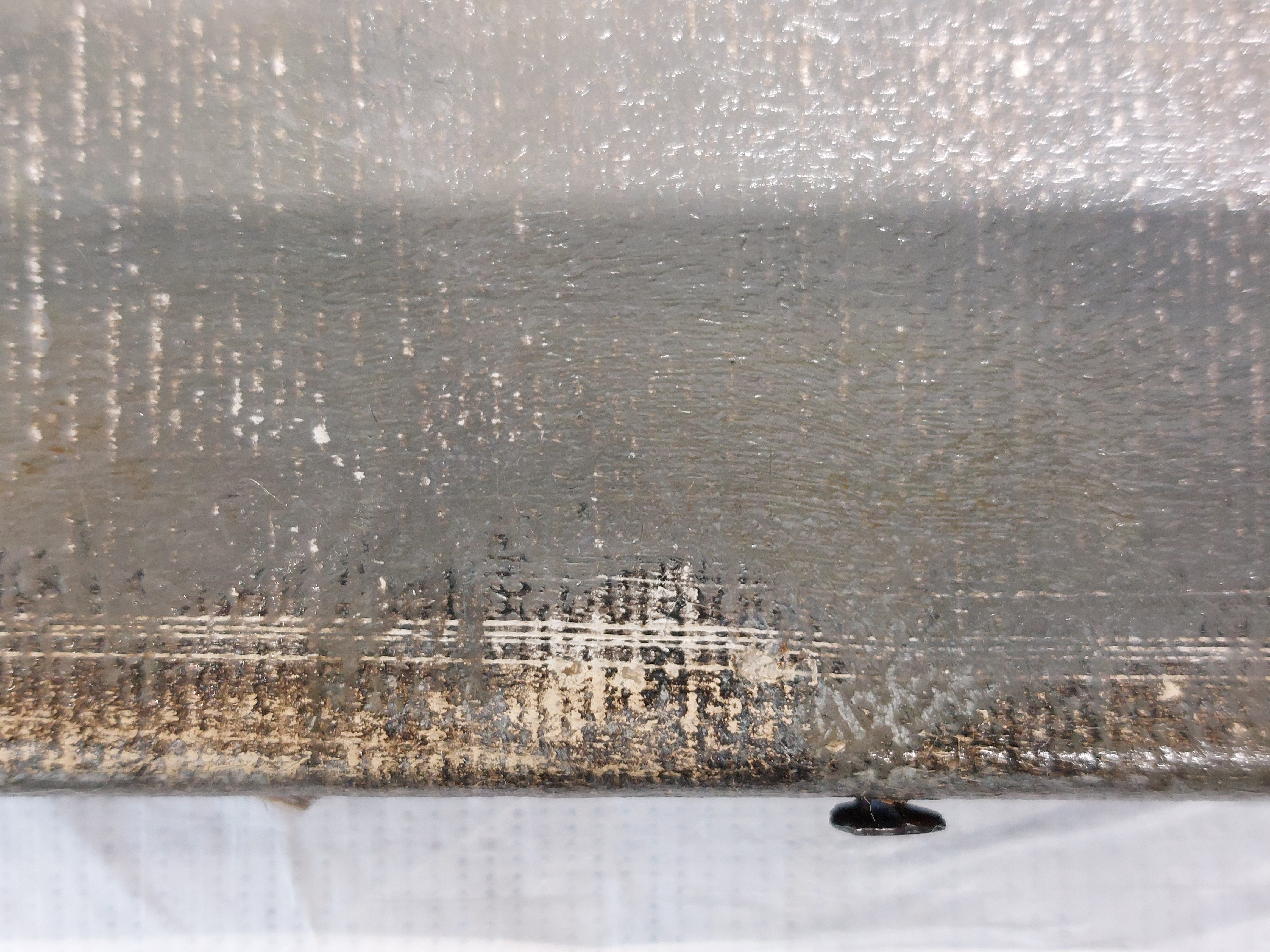 There are some nail holes on the tacking edges, spaced wide apart and very irregular. The lower half of the right-hand tacking edge is very narrow.