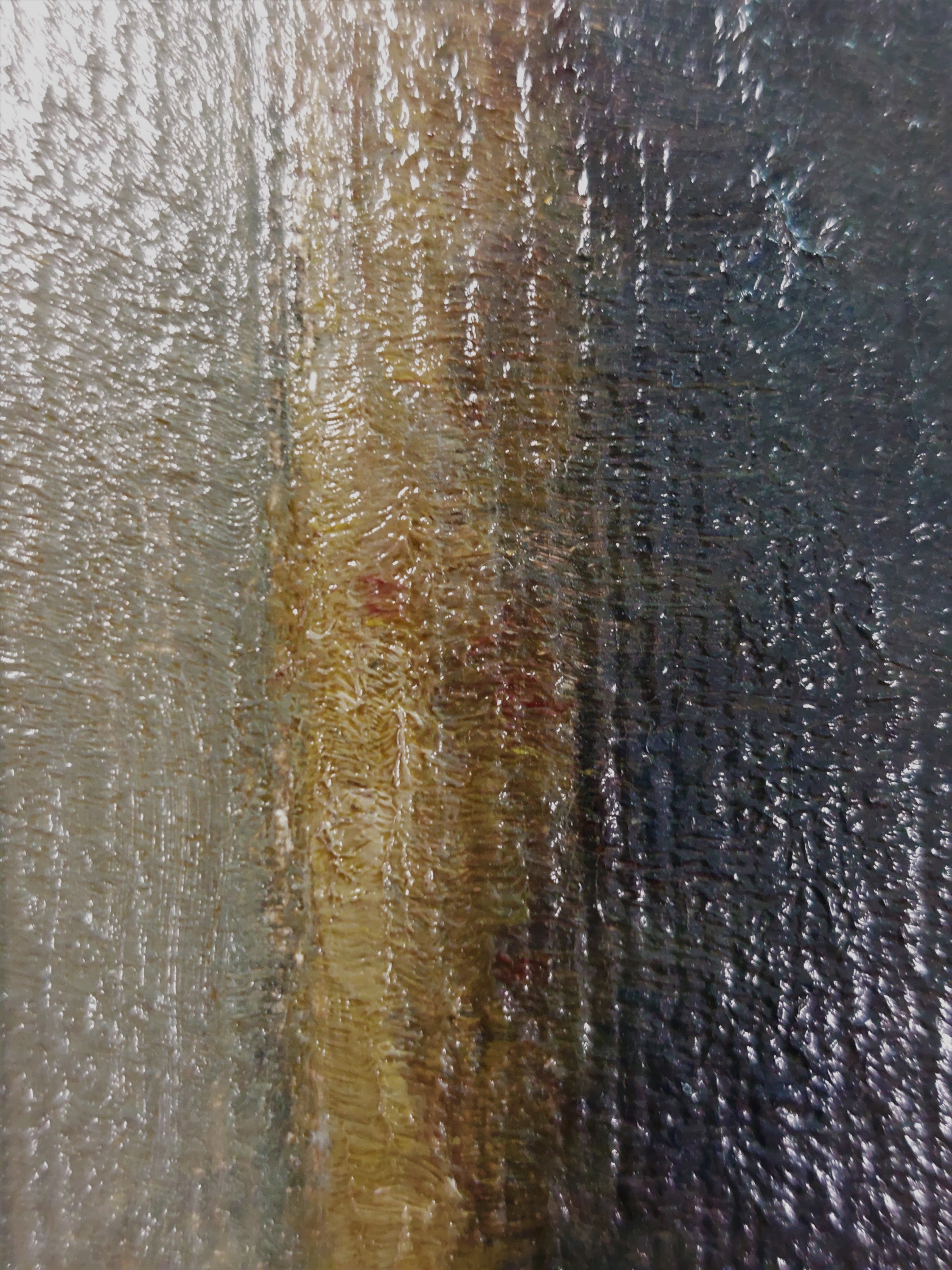 The facial skin tones are mainly in shades of earth colours over a dark underpaint. The top layers contains little dabs and picked up blue, yellow and pink traces.