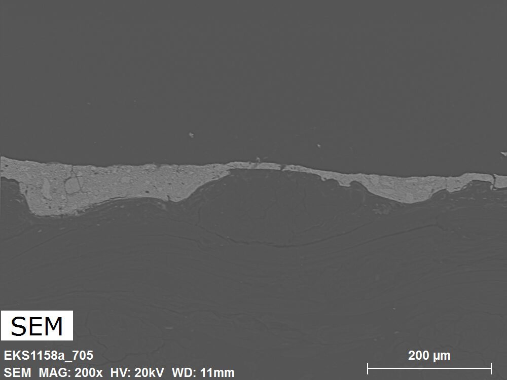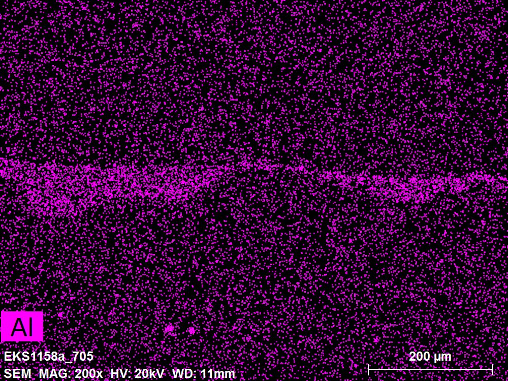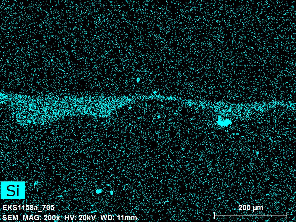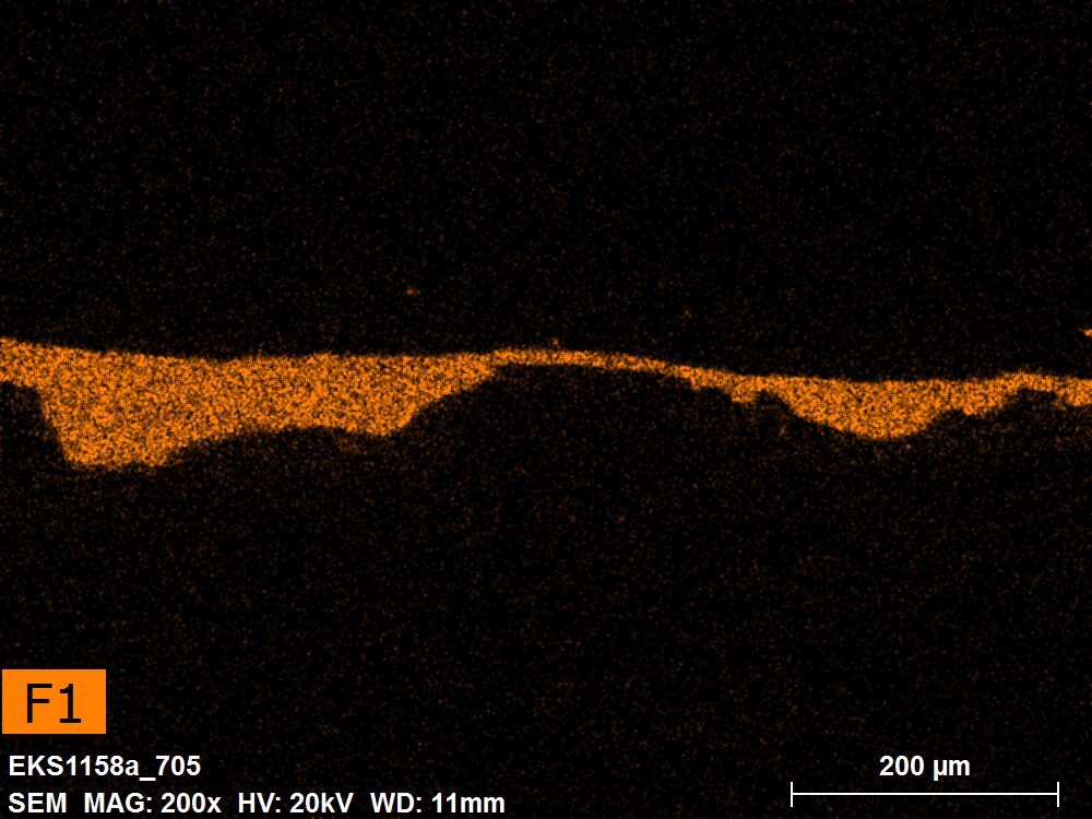 SEM-EDXS is a technique that provides highly detailed images at the microscopic level while simultaneously identifying the elemental composition of a sample. It is particularly valuable for studying the stratigraphy of paint cross sections at very fine scales, for the chemical characterisation of pigments, fillers and degradation products, and for detecting trace elements that may indicate very specific materials. Below, the elements listed in parentheses refer to minor elements whose relative abundance is below 10% of the total signal. The F1 map below represents the Pb M line. Read more under SEM-EDXS in the glossary.