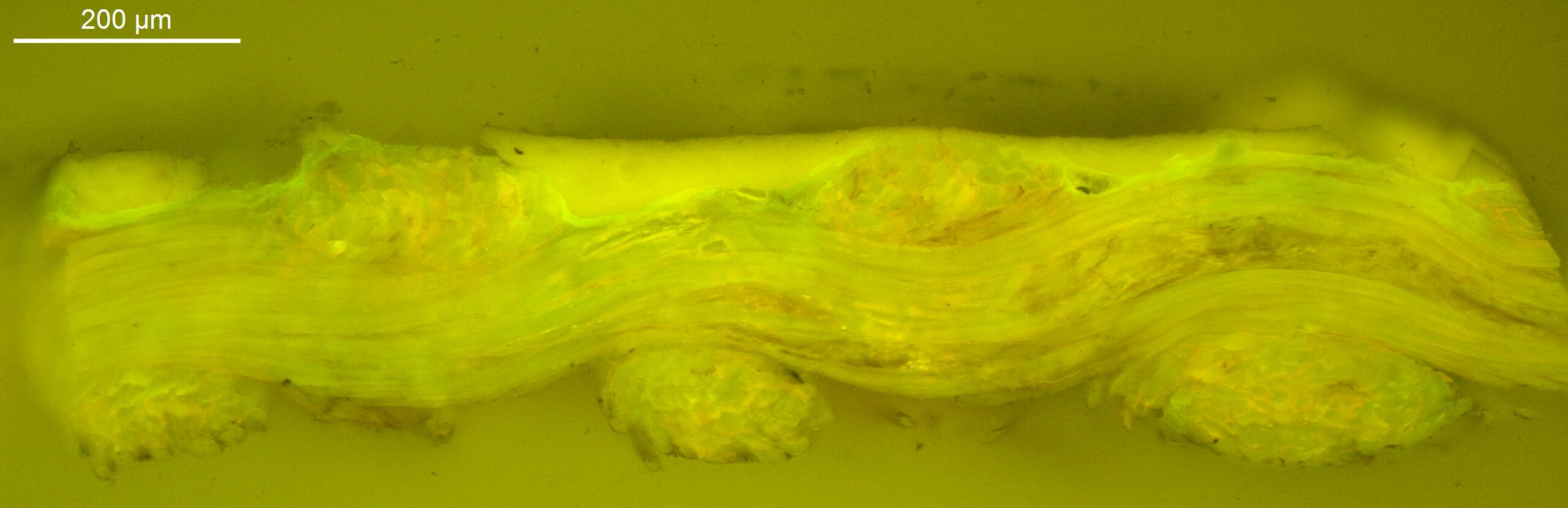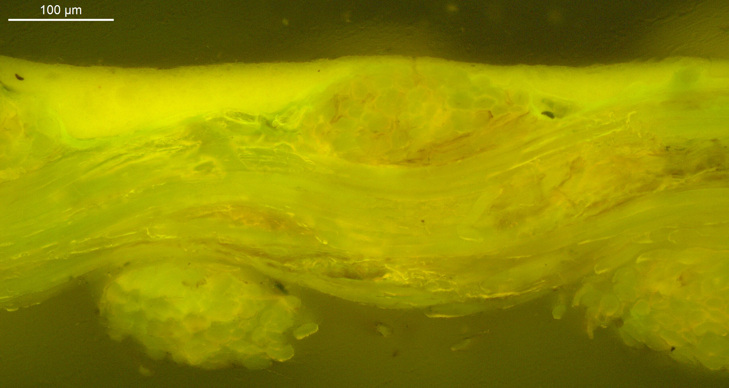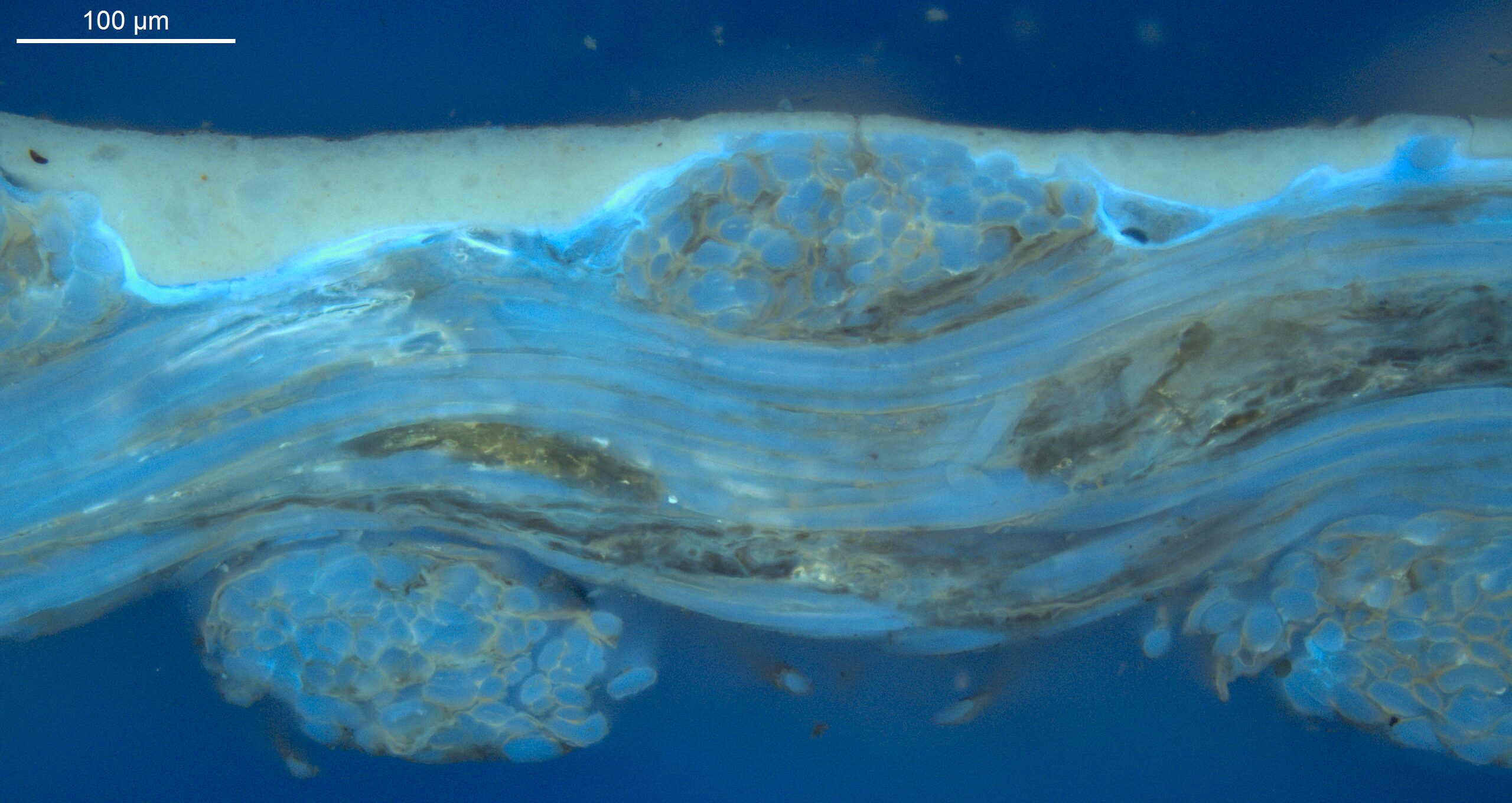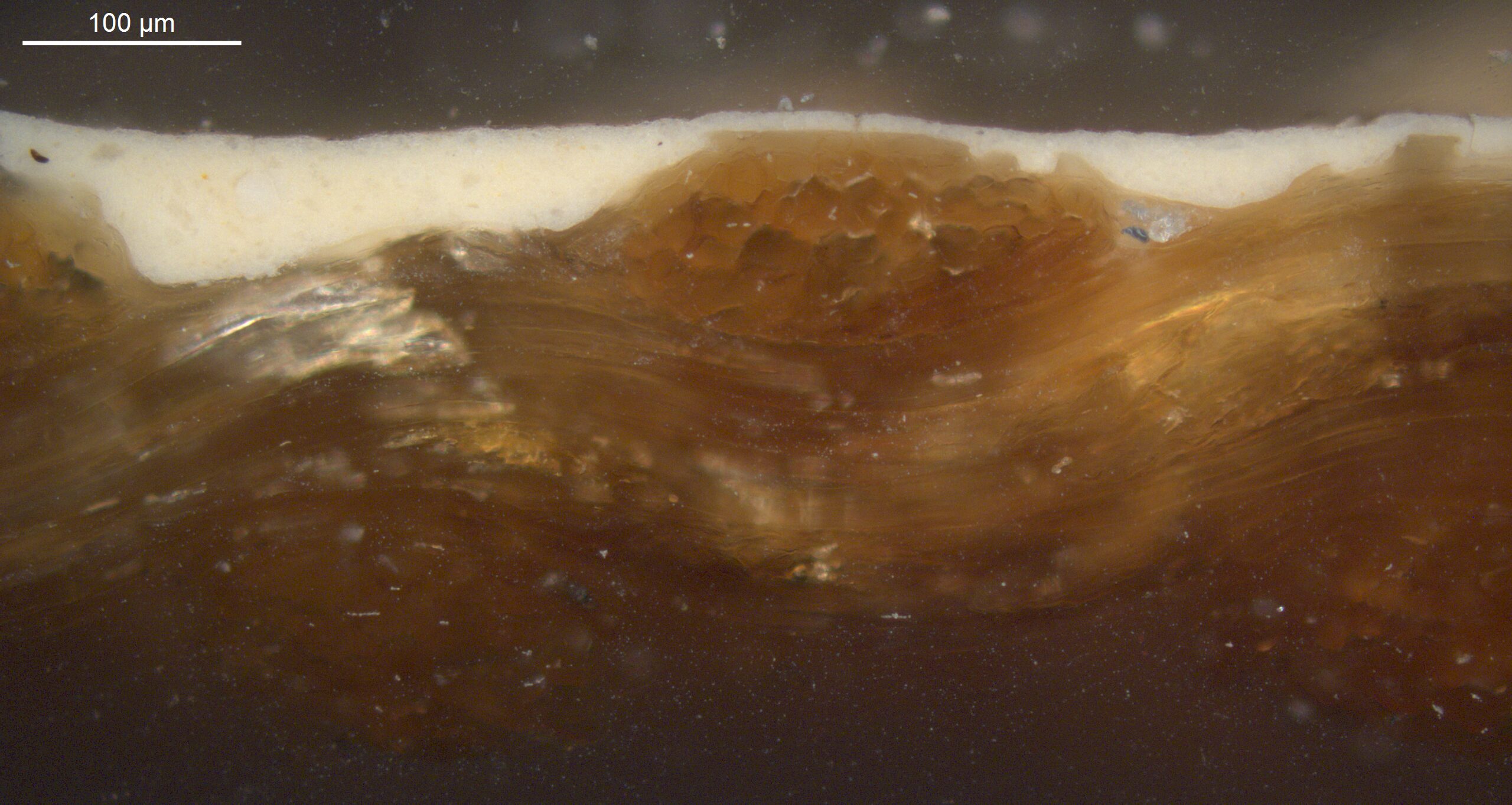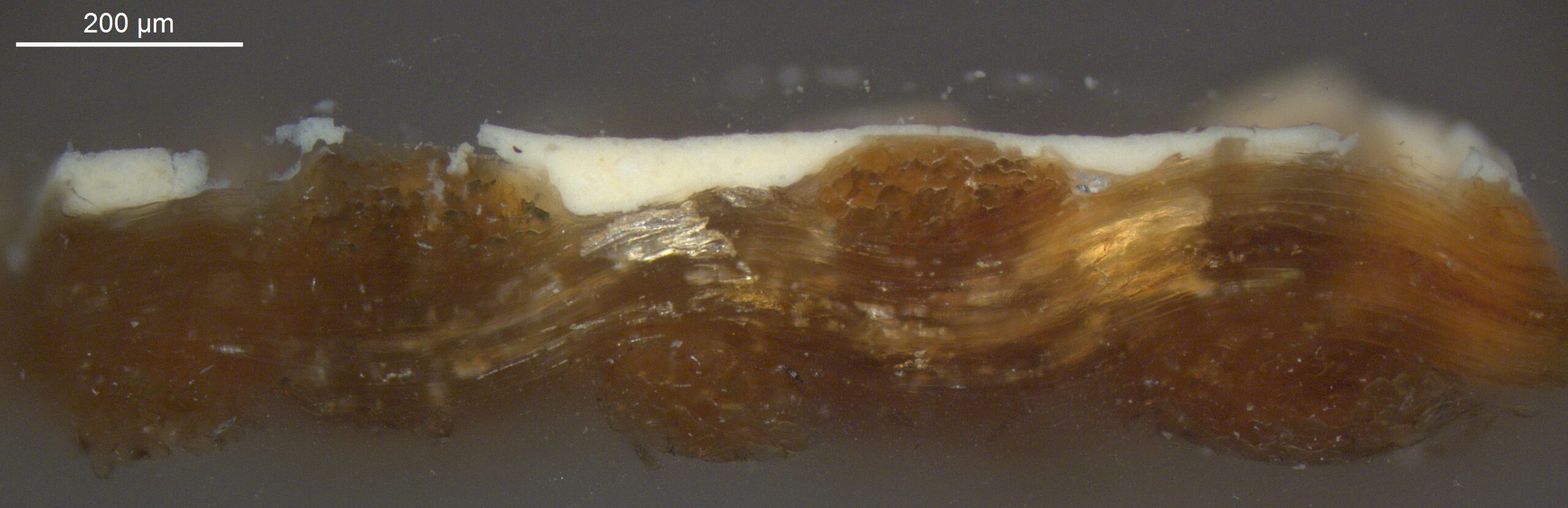 Optical microscopy uses visible light and lenses to magnify and examine the surface and structure of a painting. When applied to cross sections of paint samples, it allows for detailed observation of a painting’s stratigraphy (layer structure) and pigment particles. It is often employed with various illumination techniques, such as dark field and UV fluorescence, to enhance the analysis. Layer number 1 in the results section below the images refers to the layer at the bottom of the cross section.