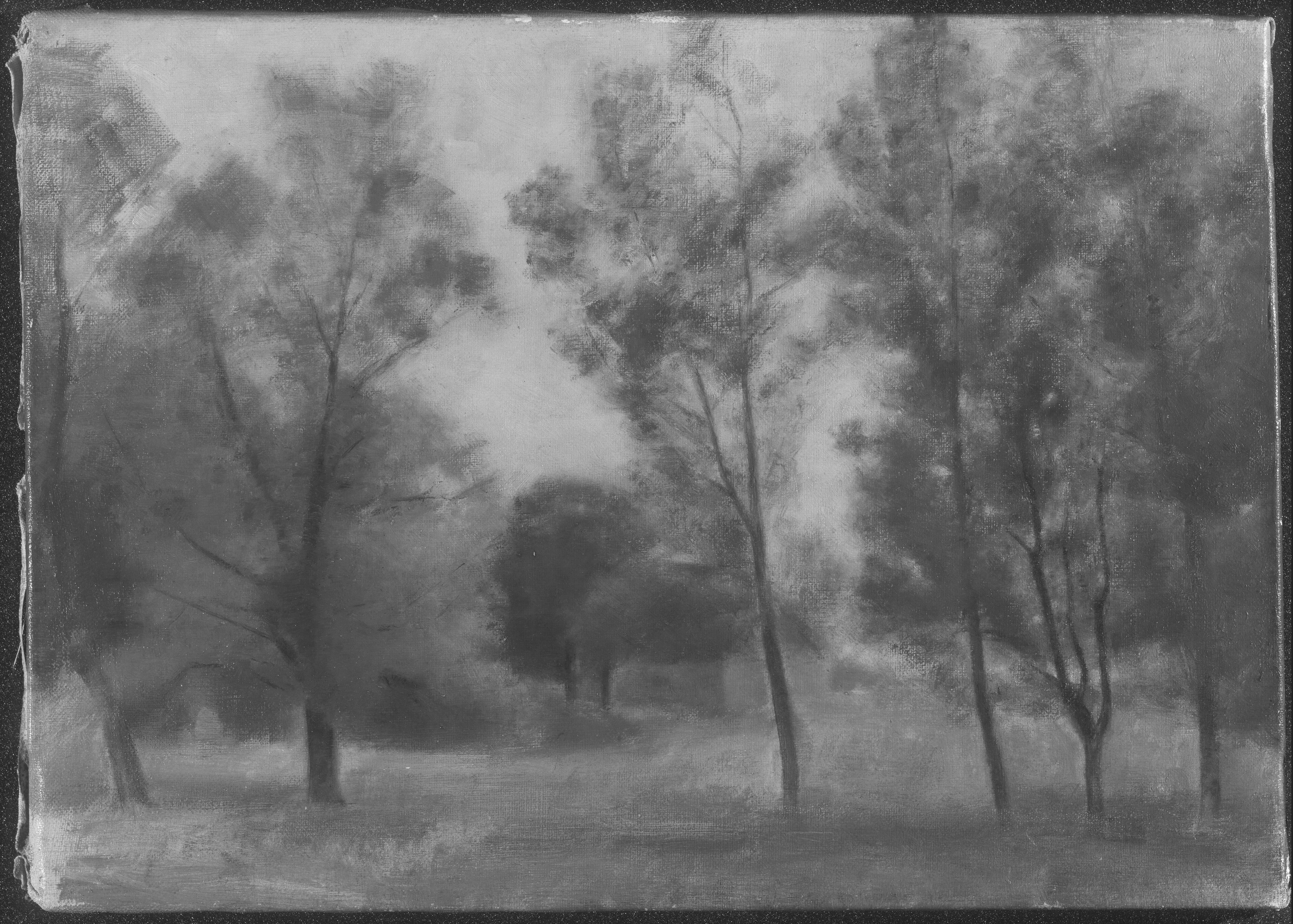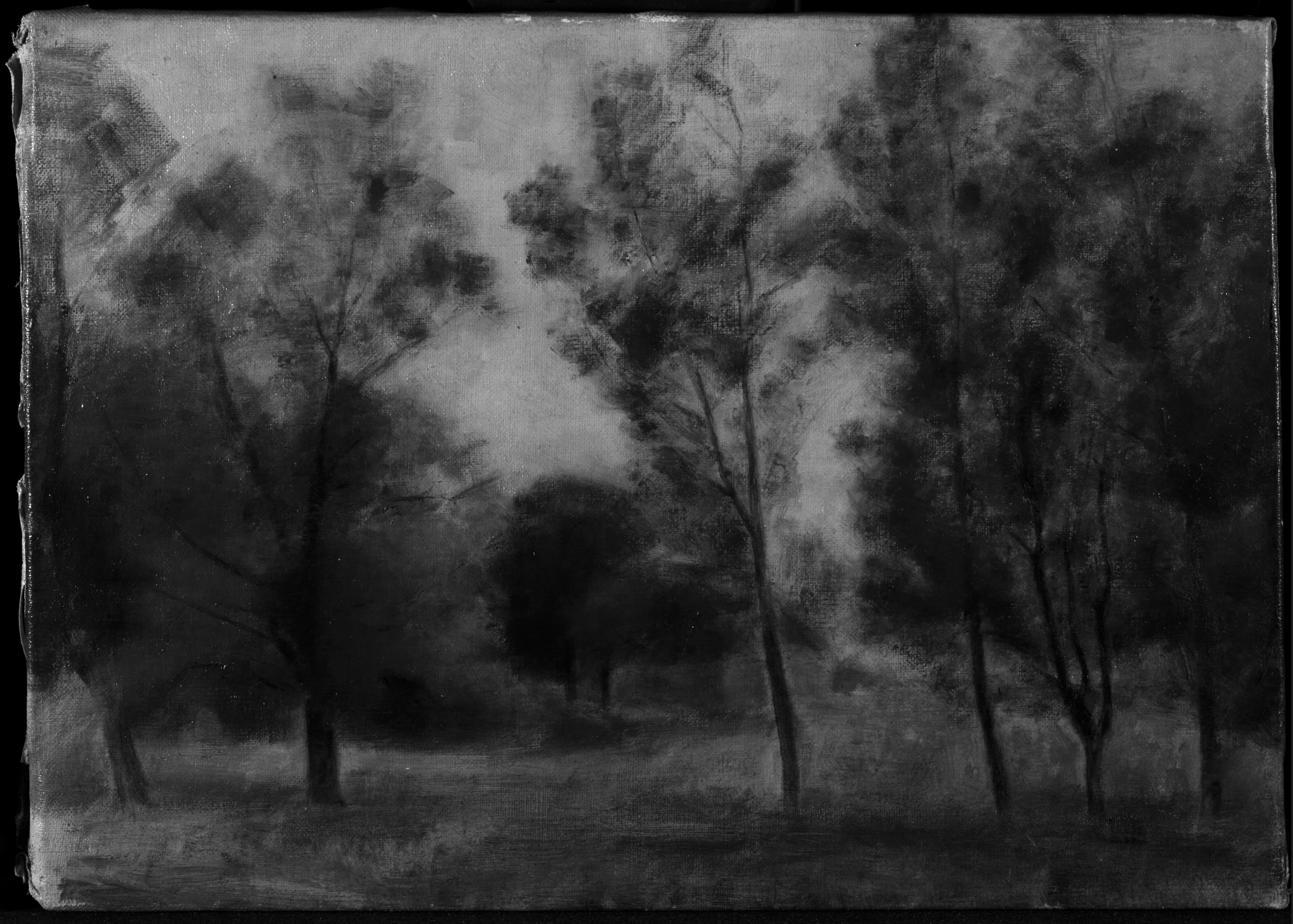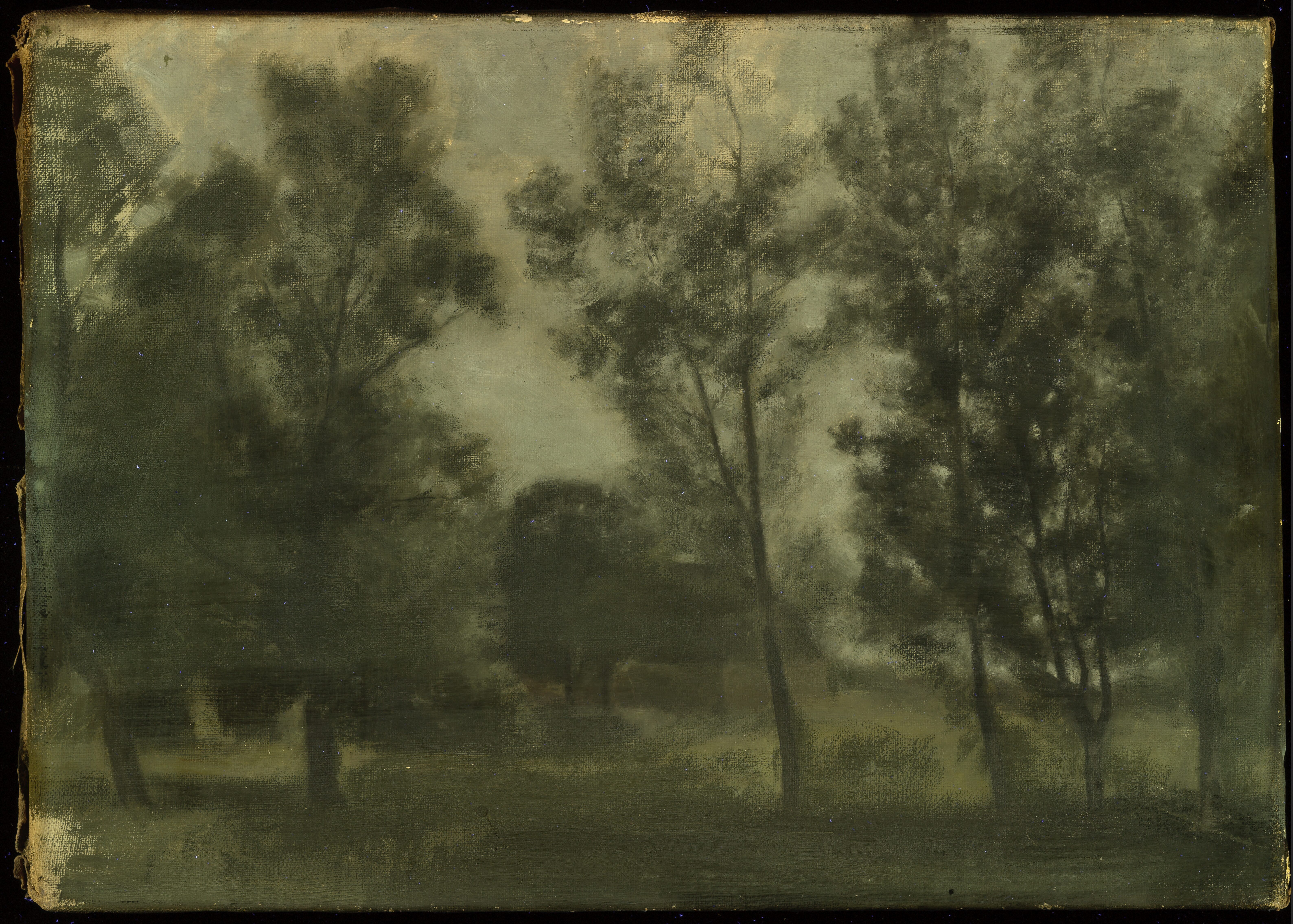 Dark particles on the exposed ground are visible in the top section of the foliage in the tree at the centre and may be remnants of an underdrawing.