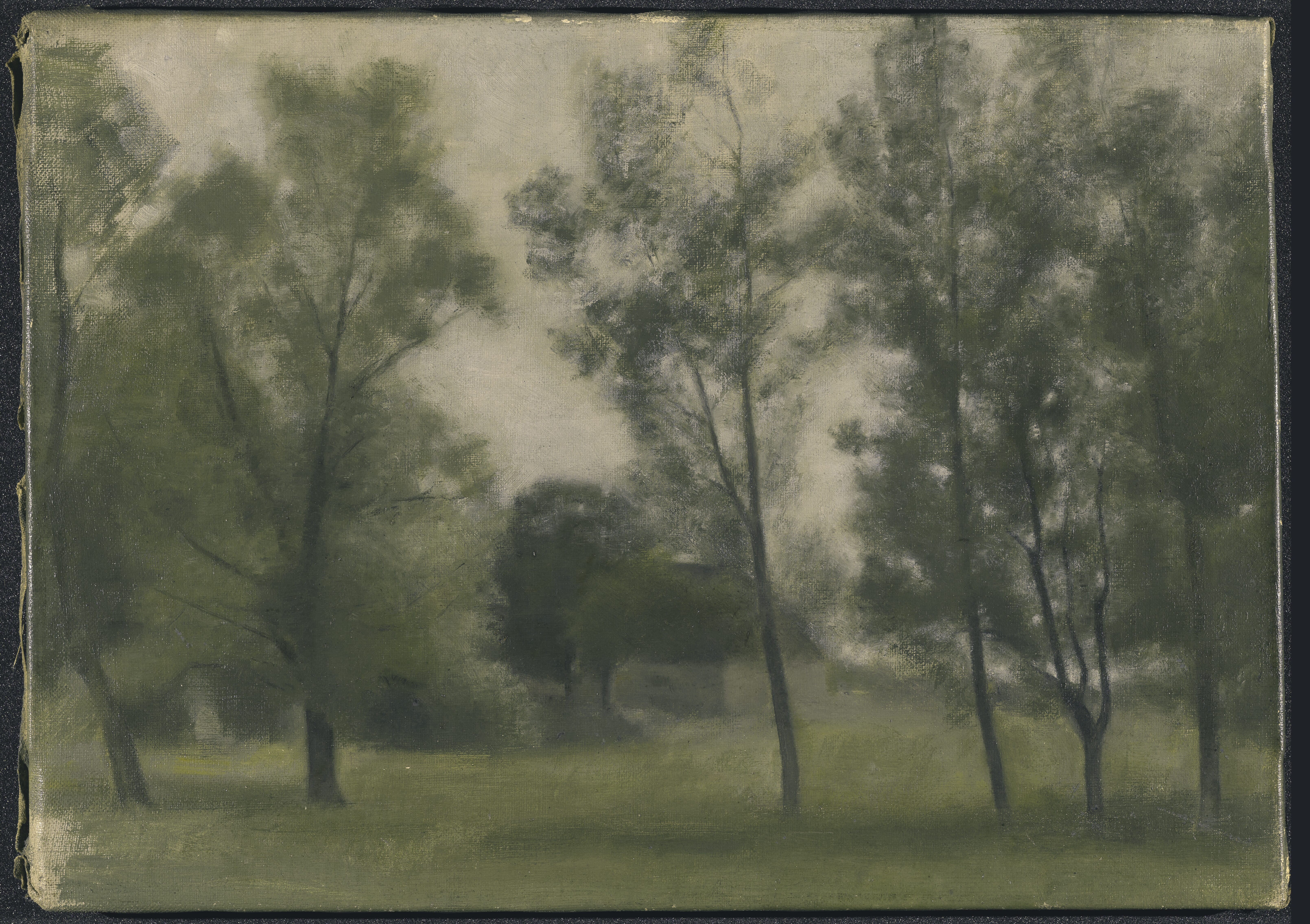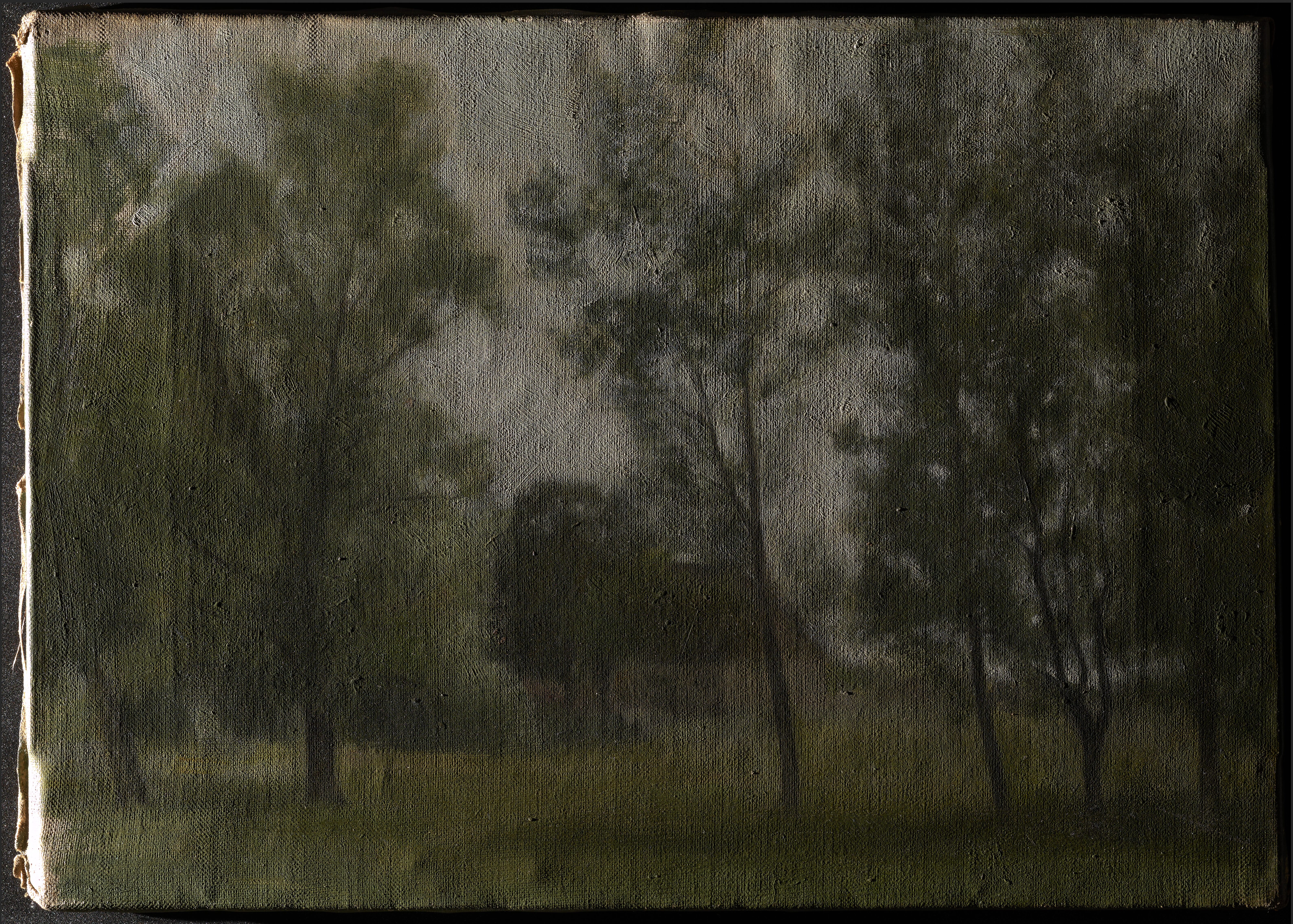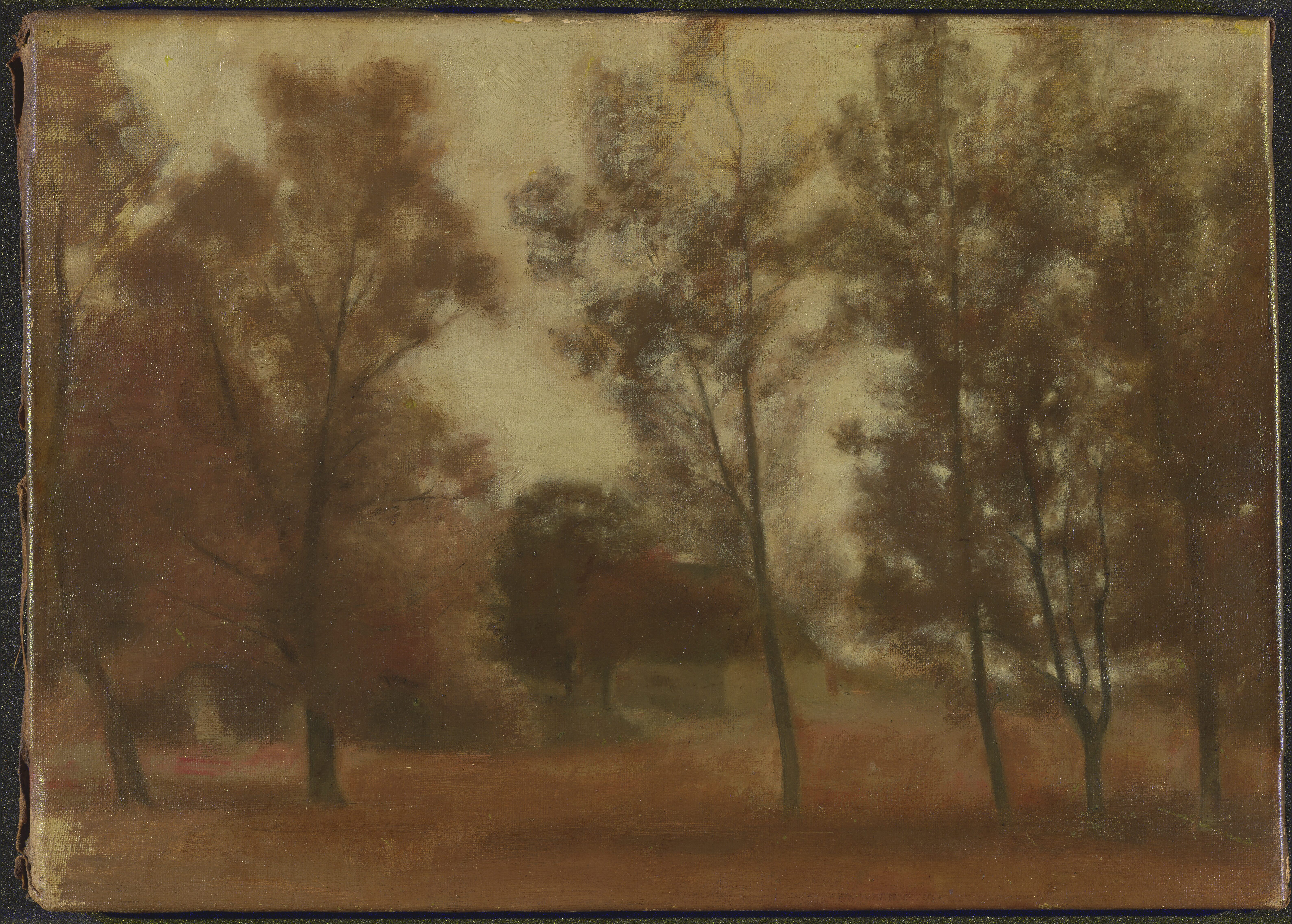 Dark particles on the exposed ground are visible in the top section of the foliage in the tree at the centre and may be remnants of an underdrawing.
