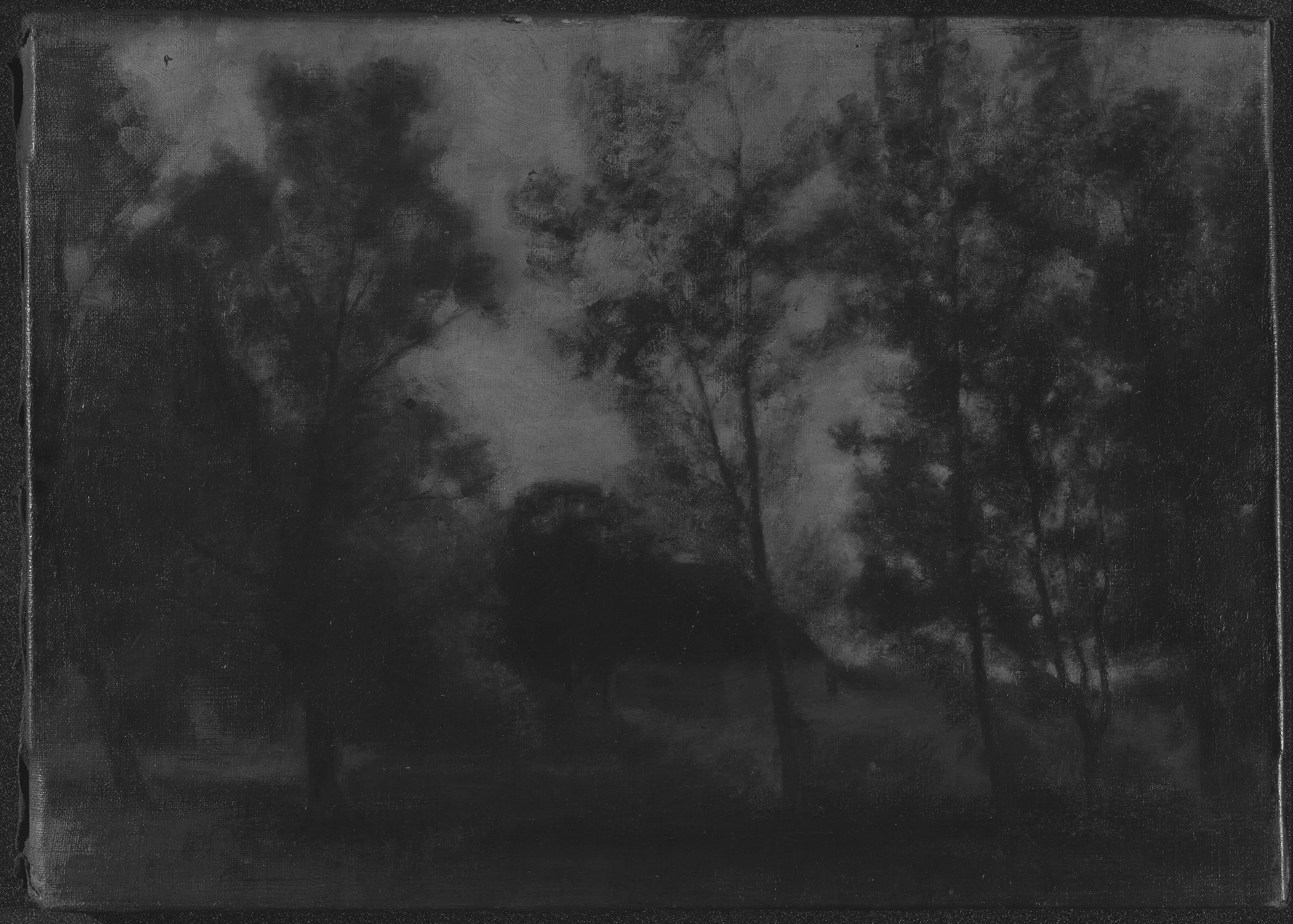 There are some overlapping areas of paint alternating with parts reserved in the early stages of execution. The foliage of the trees was applied partly with a scumbling technique making use of the the ground and canvas texture. In the foreground, including details in the central part of the composition, a more saturated, dense paint was applied wet-in-wet.