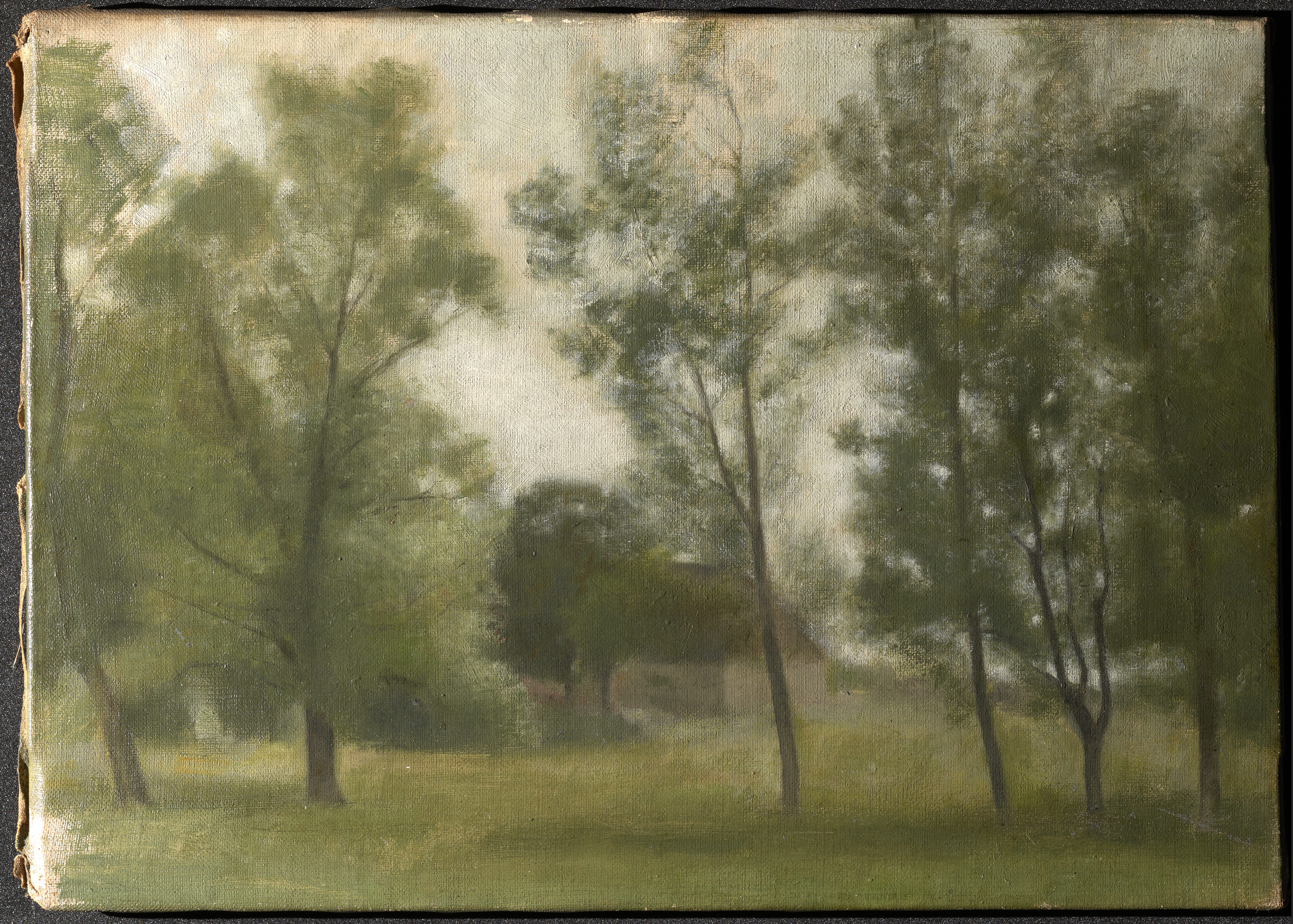 (Transl.): ‘LANDSCAPE. Gunsømagle near Roskilde. In the foreground, at regular intervals, is a row of slender trees with their foliage fading away against the pale grey sky. Further back, in the centre, is a farmer’s cottage.’