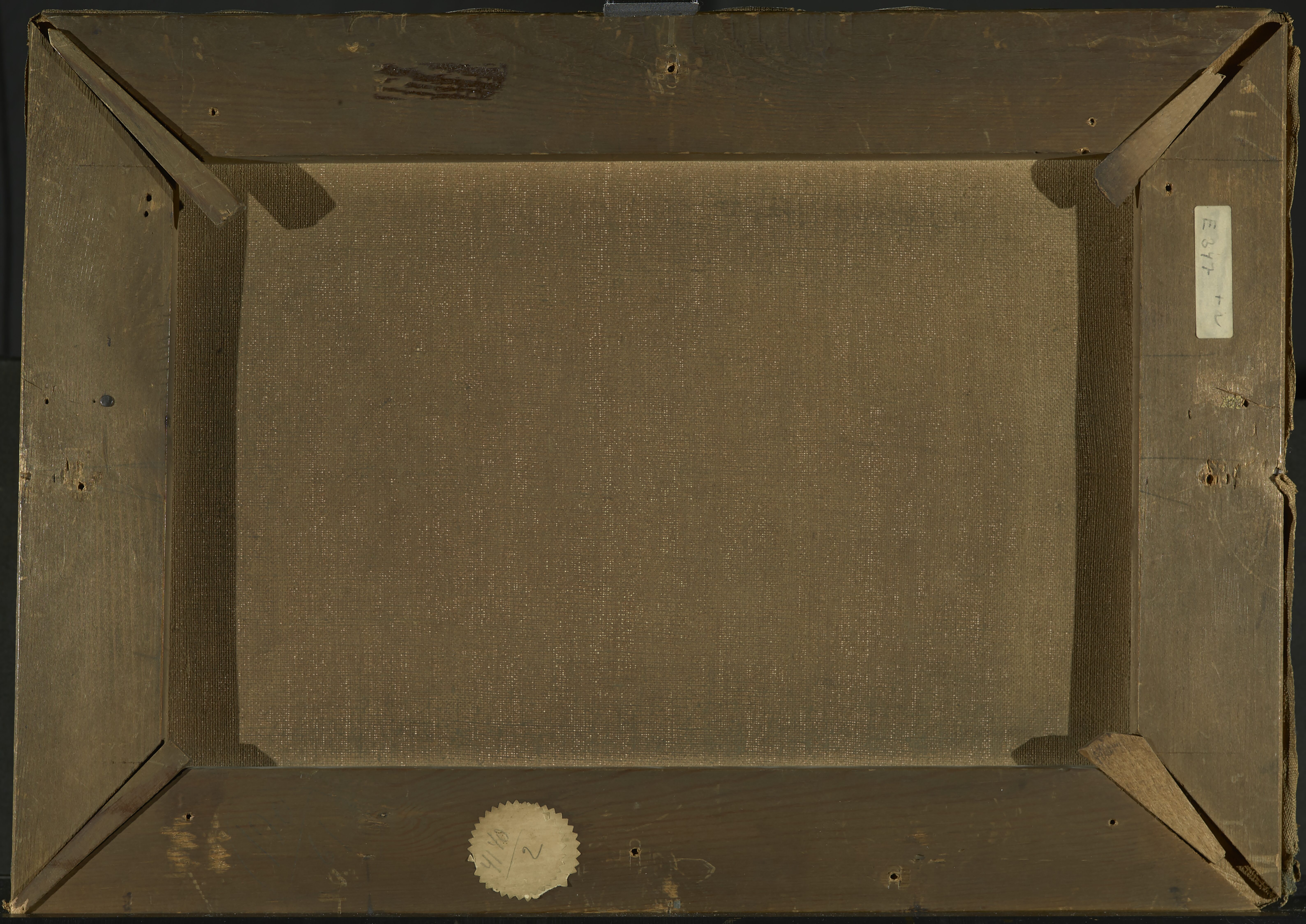 On the bottom bar are two round labels with jagged edges on top of each other, inscribed in pencil: ‘4140/2’. Label (from SMK conservation register) On the right-hand bar is a label from the SMK conservation register inscribed: ‘E447 + r’. An inscription in pencil at the left-hand side of the bottom bar reads: ‘170/61’.