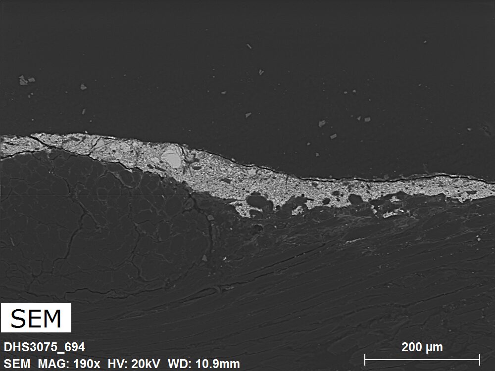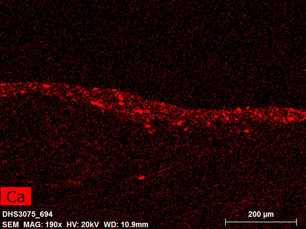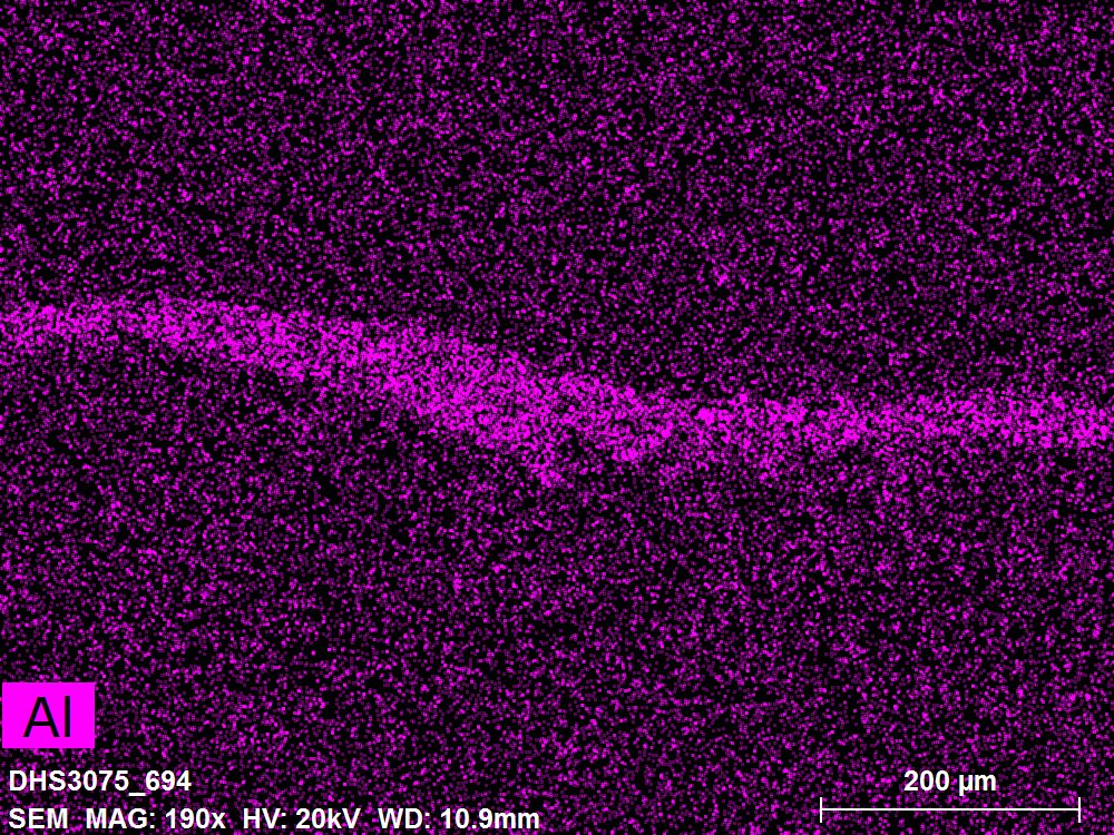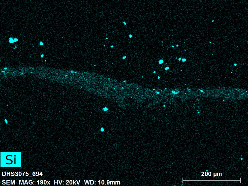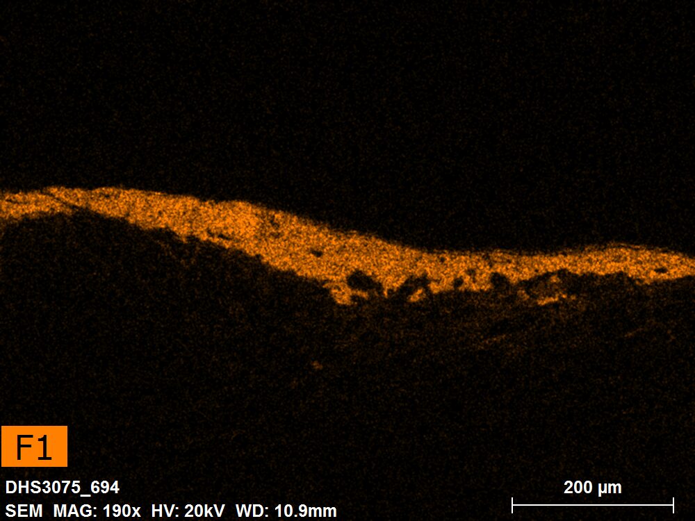 SEM-EDXS is a technique that provides highly detailed images at the microscopic level while simultaneously identifying the elemental composition of a sample. It is particularly valuable for studying the stratigraphy of paint cross sections at very fine scales, for the chemical characterisation of pigments, fillers and degradation products, and for detecting trace elements that may indicate very specific materials. Below, the elements listed in parentheses refer to minor elements whose relative abundance is below 10% of the total signal. The F1 map below represents the Pb M line. Read more under SEM-EDXS in the glossary.