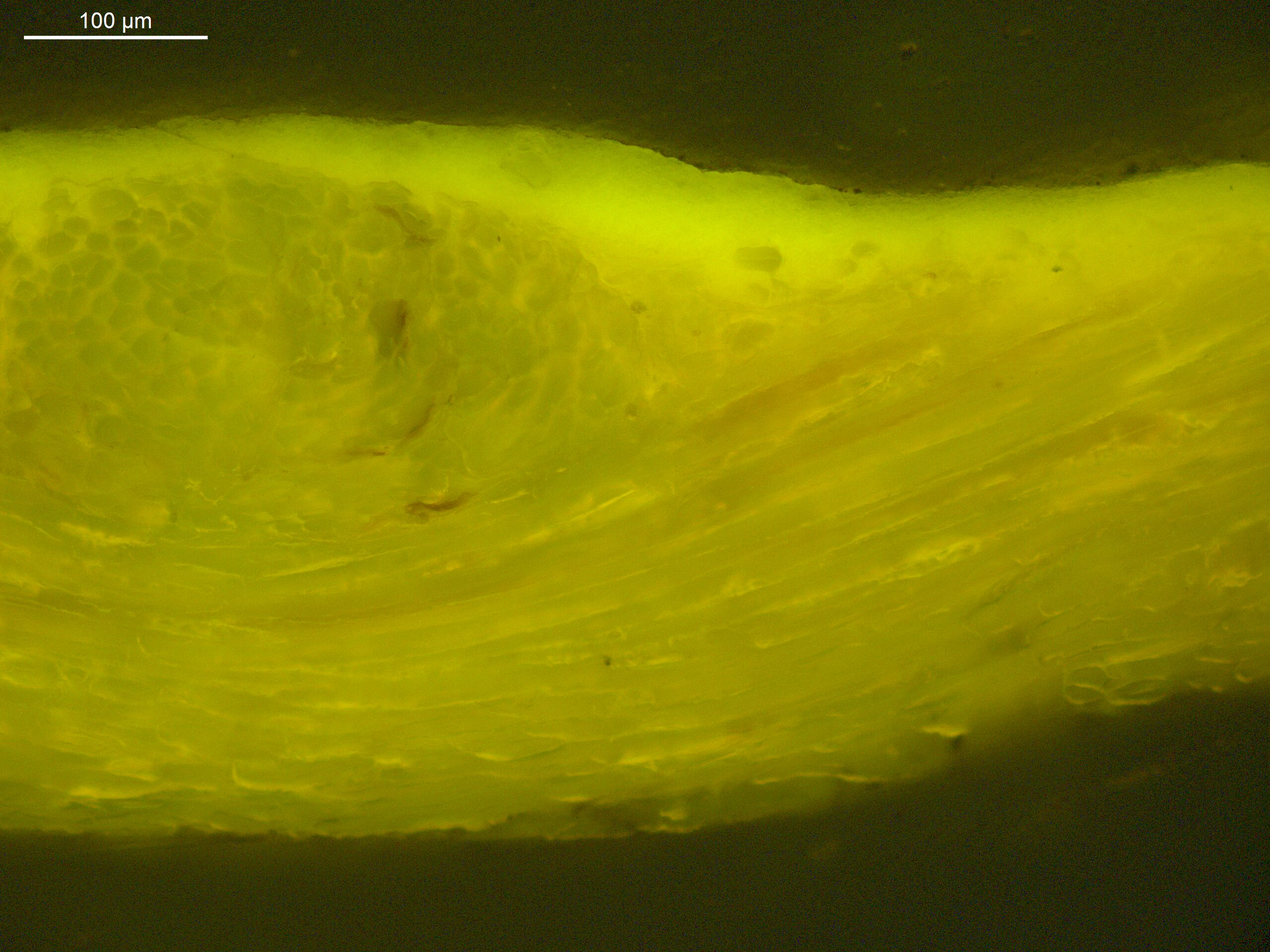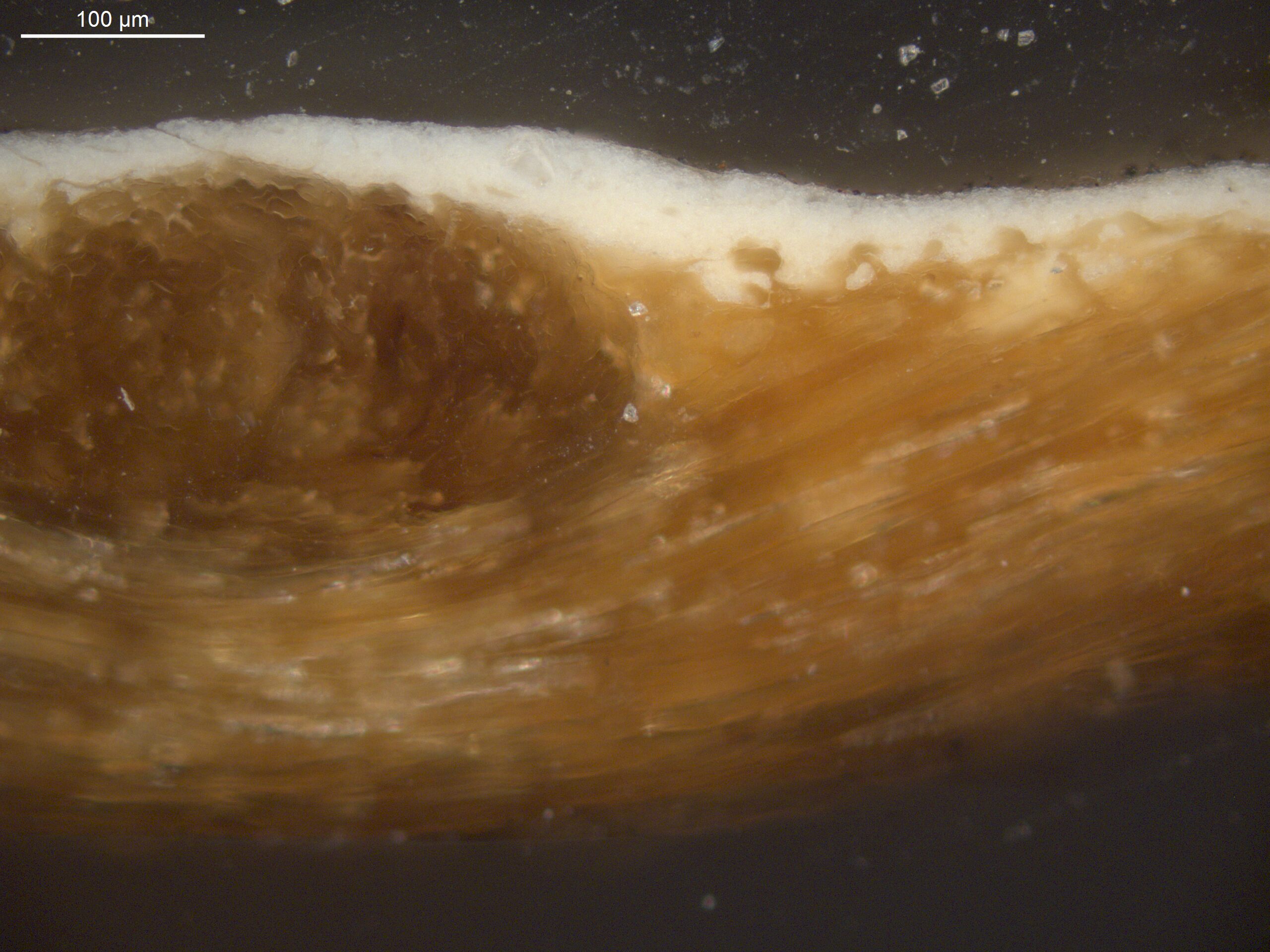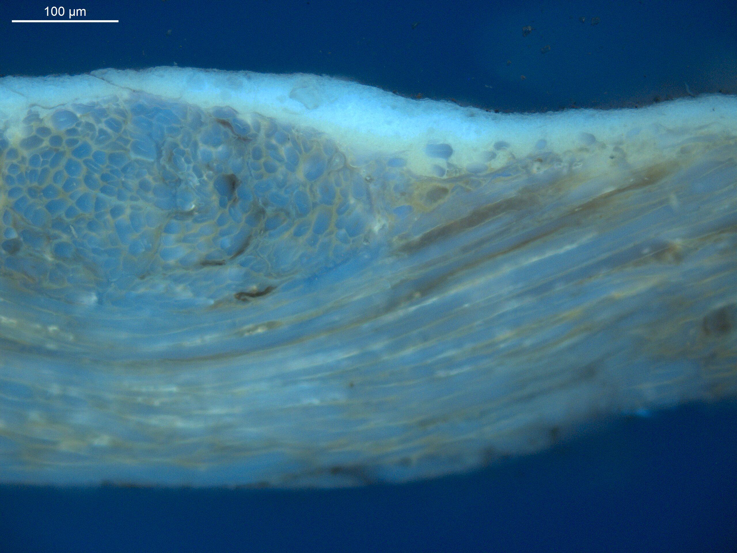 Optical microscopy uses visible light and lenses to magnify and examine the surface and structure of a painting. When applied to cross sections of paint samples, it allows for detailed observation of a painting’s stratigraphy (layer structure) and pigment particles. It is often employed with various illumination techniques, such as dark field and UV fluorescence, to enhance the analysis. Layer number 1 in the results section below the images refers to the layer at the bottom of the cross section.