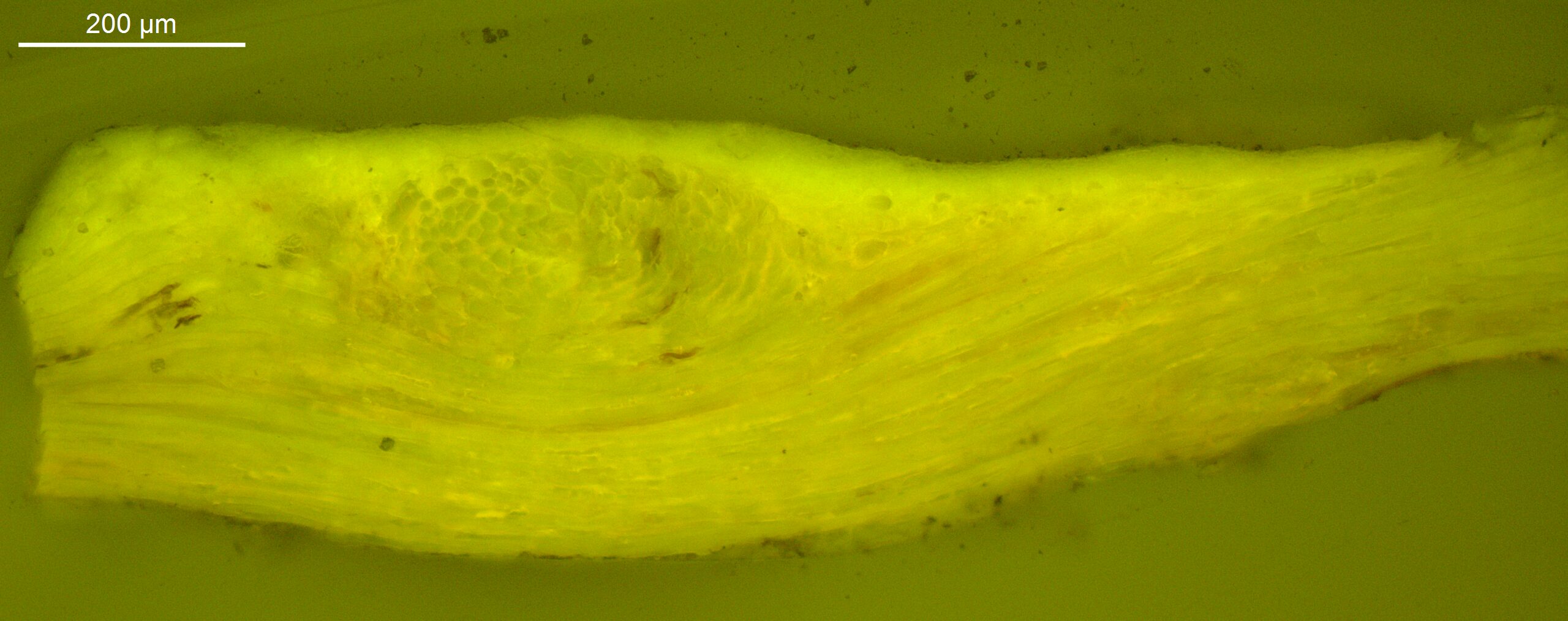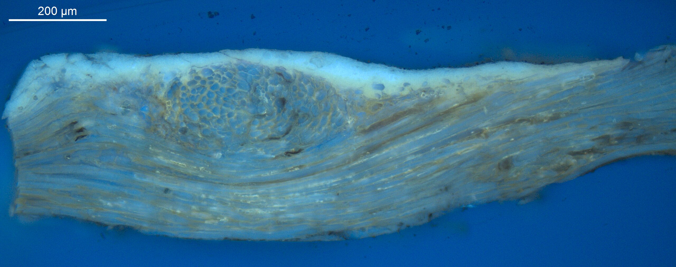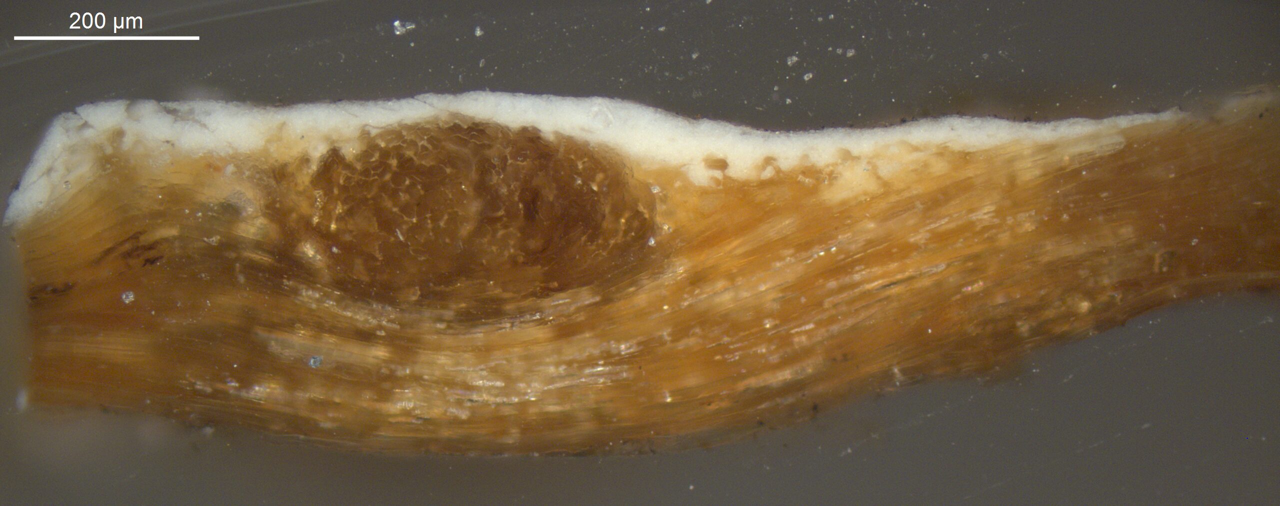 Optical microscopy uses visible light and lenses to magnify and examine the surface and structure of a painting. When applied to cross sections of paint samples, it allows for detailed observation of a painting’s stratigraphy (layer structure) and pigment particles. It is often employed with various illumination techniques, such as dark field and UV fluorescence, to enhance the analysis. Layer number 1 in the results section below the images refers to the layer at the bottom of the cross section.