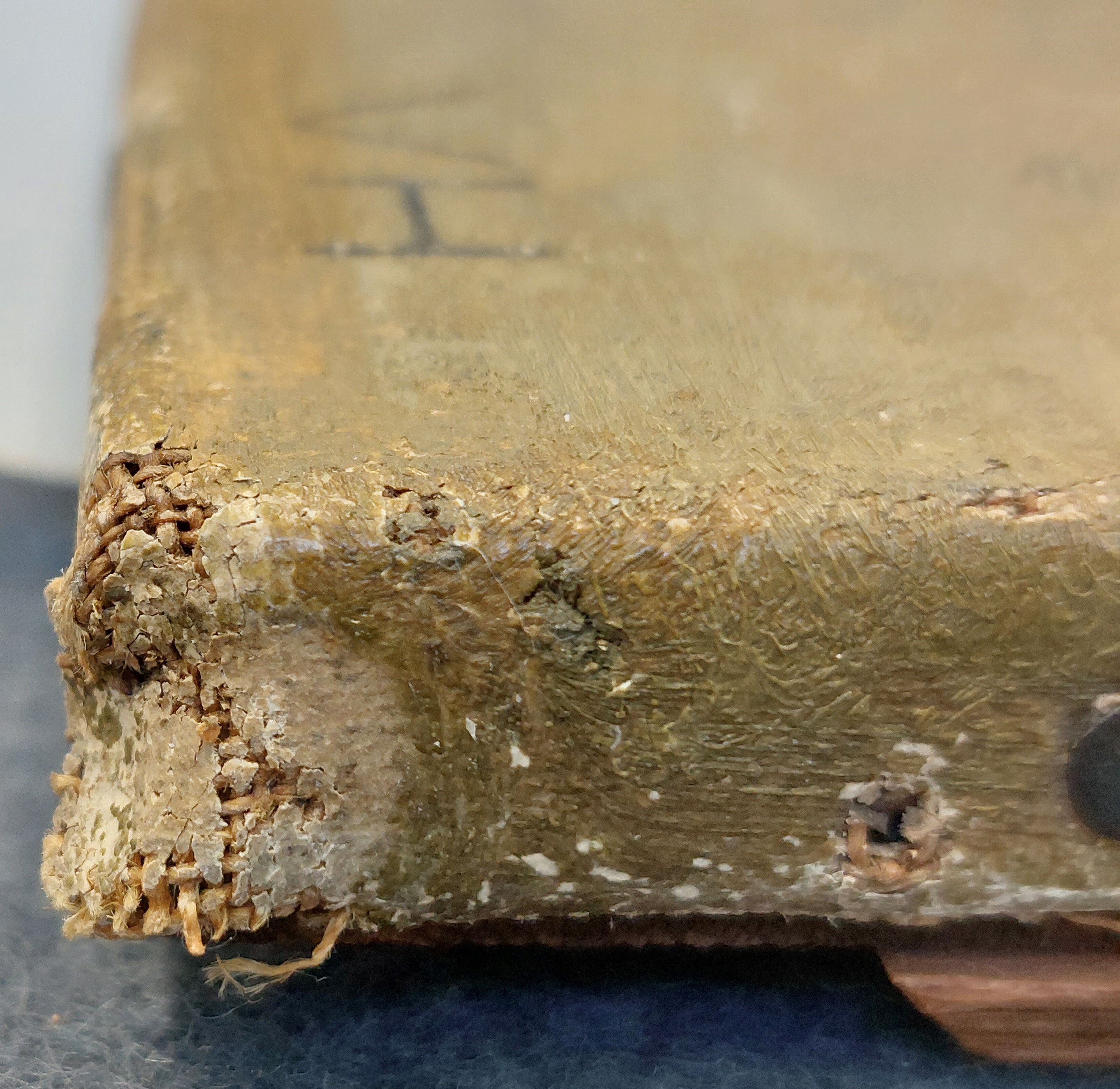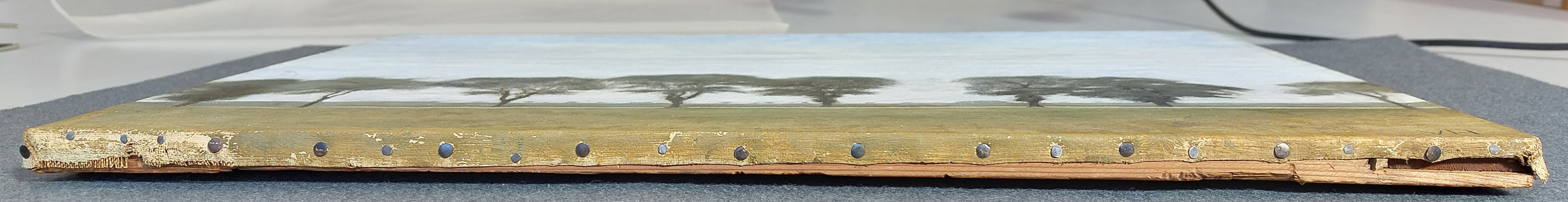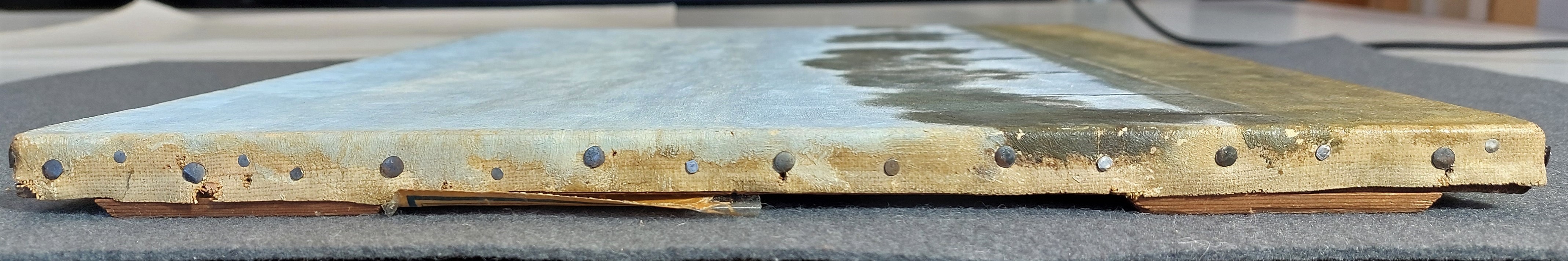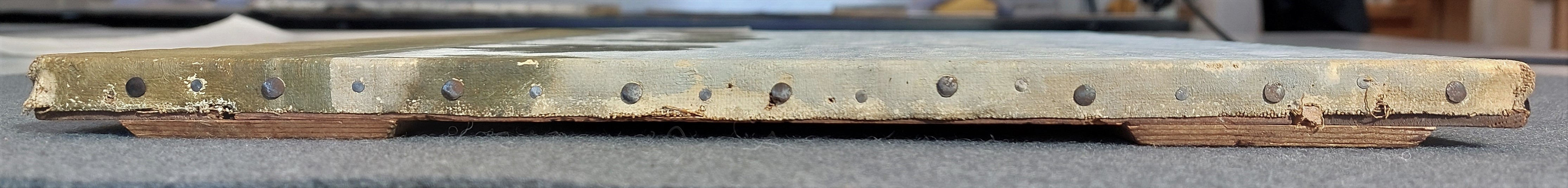 A strong glue, applied in the sizing process, has left the canvas brown and stiff.