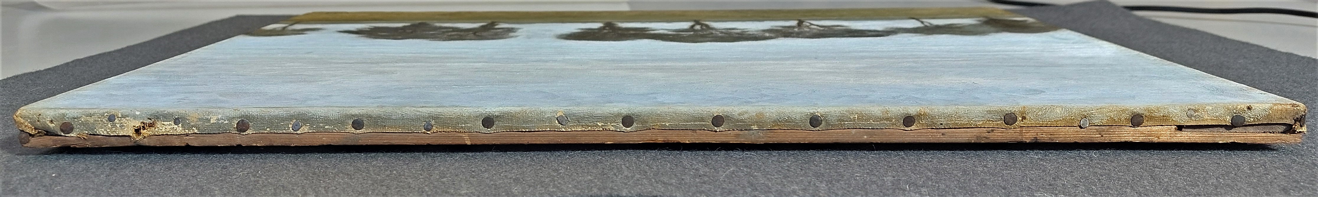 A pinhole and drawing pin mark is found at the bottom corner of the right-hand tacking edge.