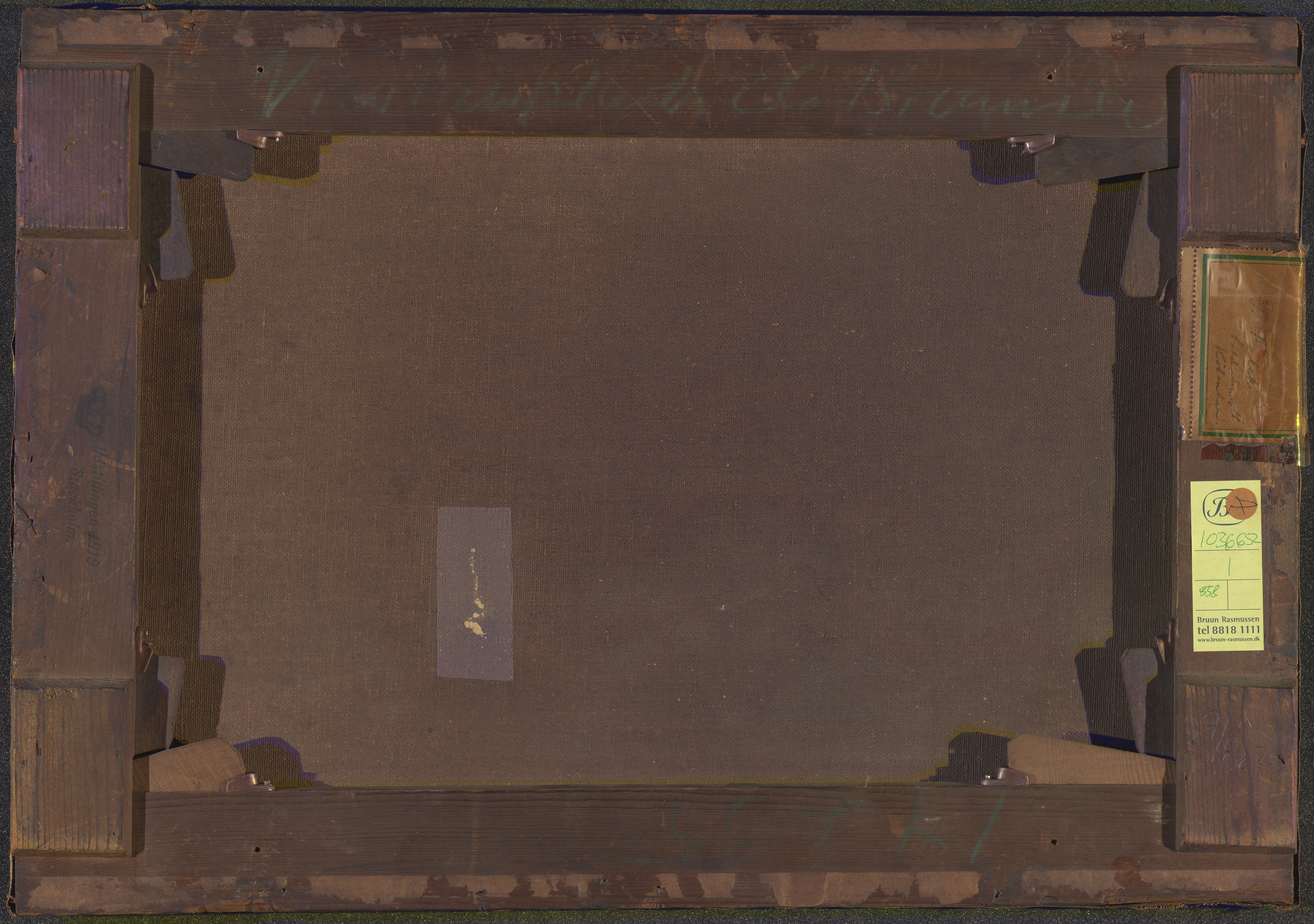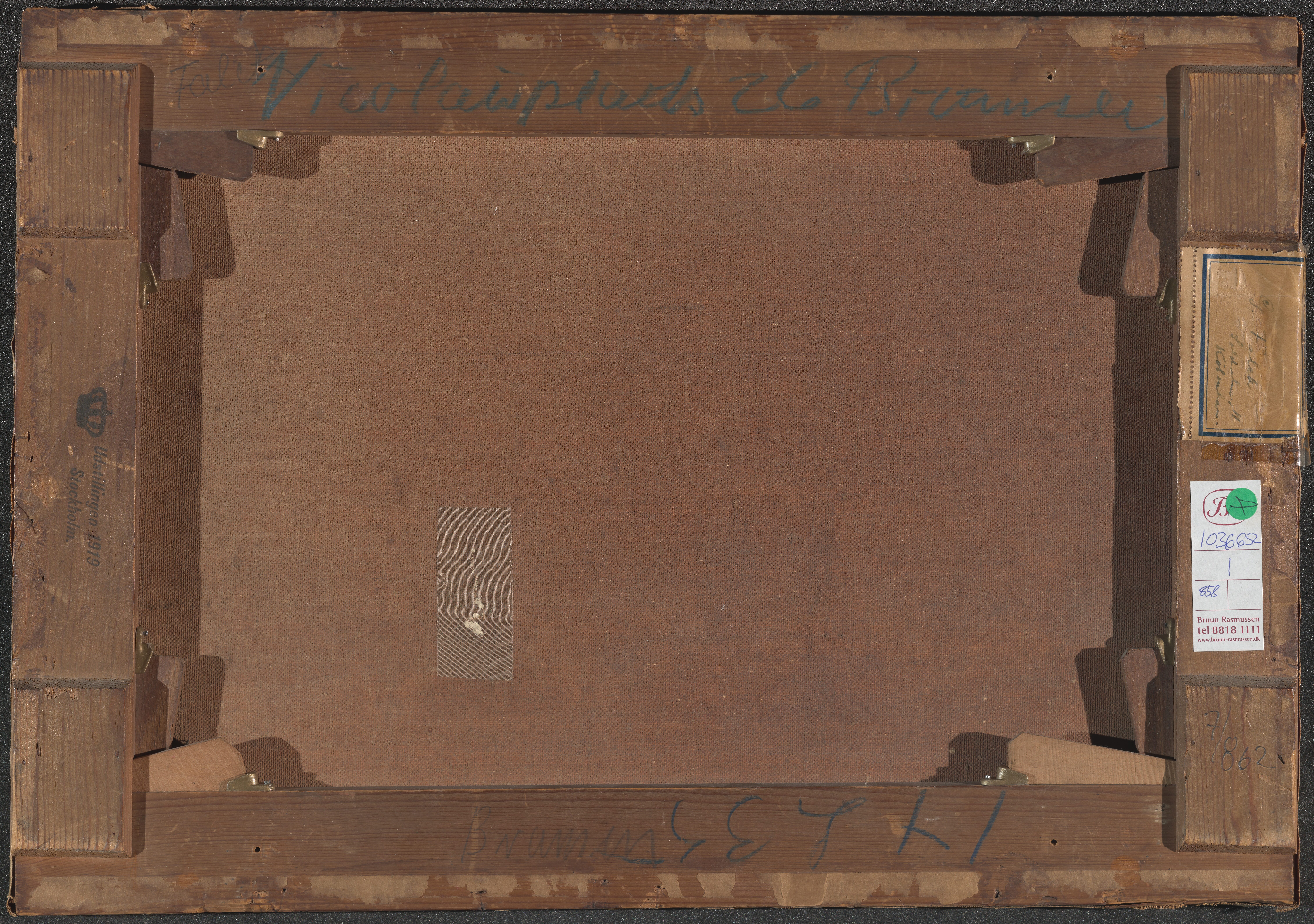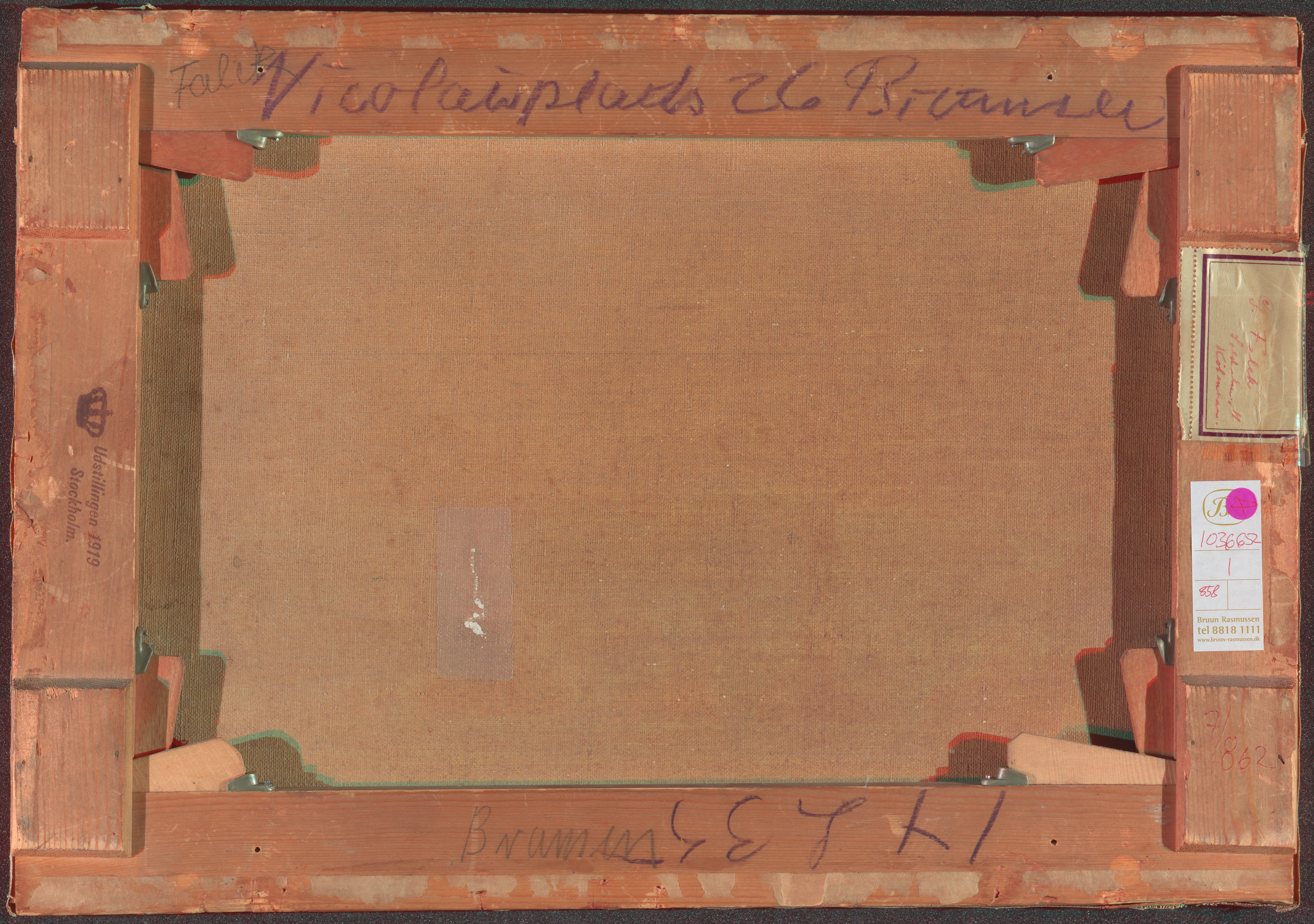 In blue crayon: ‘Bramsen’. ‘14 L 35’ and ‘Nicolaiplads 26 Bramsen’. In black ballpoint: "7/862". In pencil: "Falck". A label inscribed in ink: ‘G. Falck / Soldalen 11 / Kòbenhavn’. A label from the Bruun Rasmussen auction house with the inscripton: ‘1036652/1/858’.