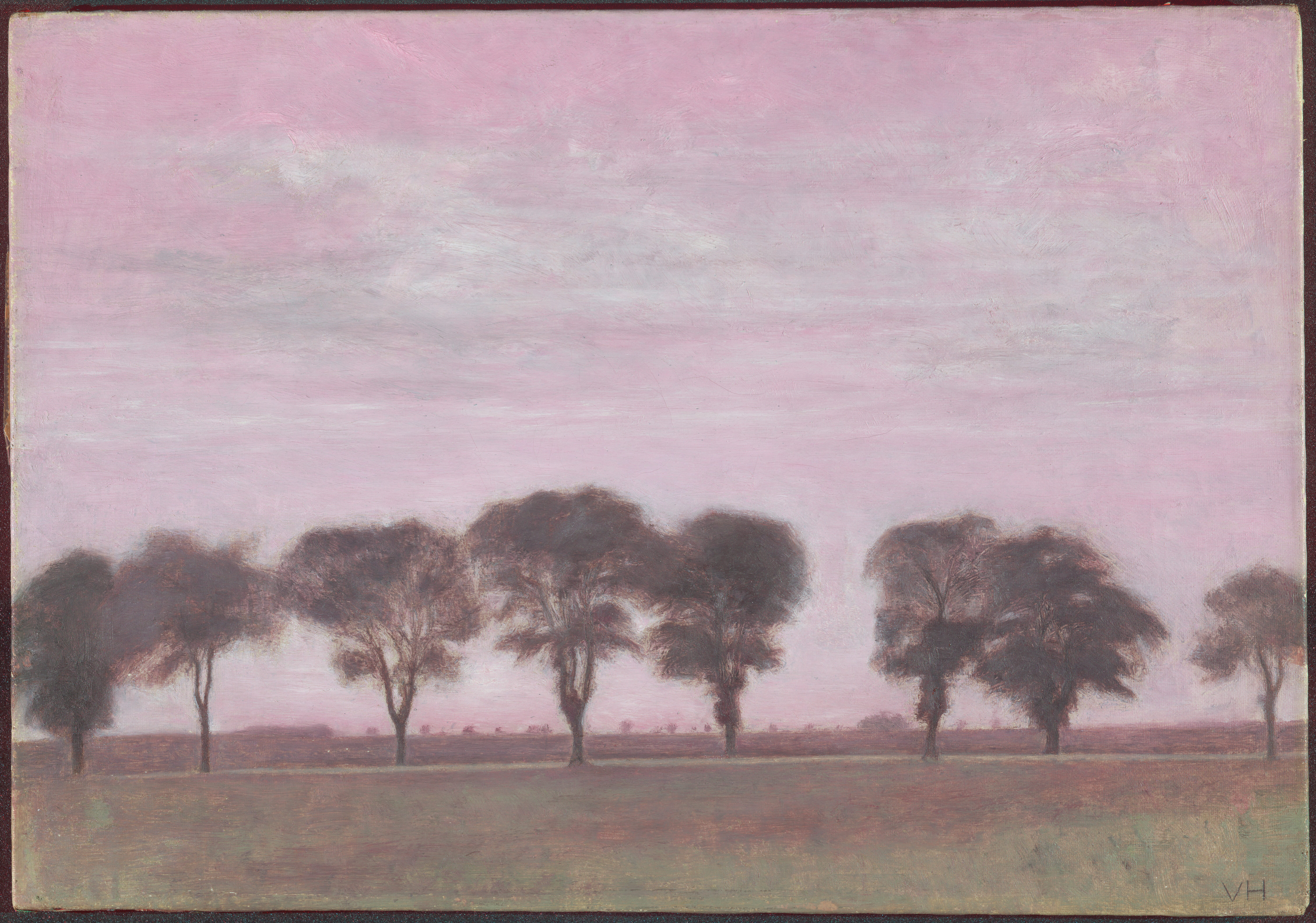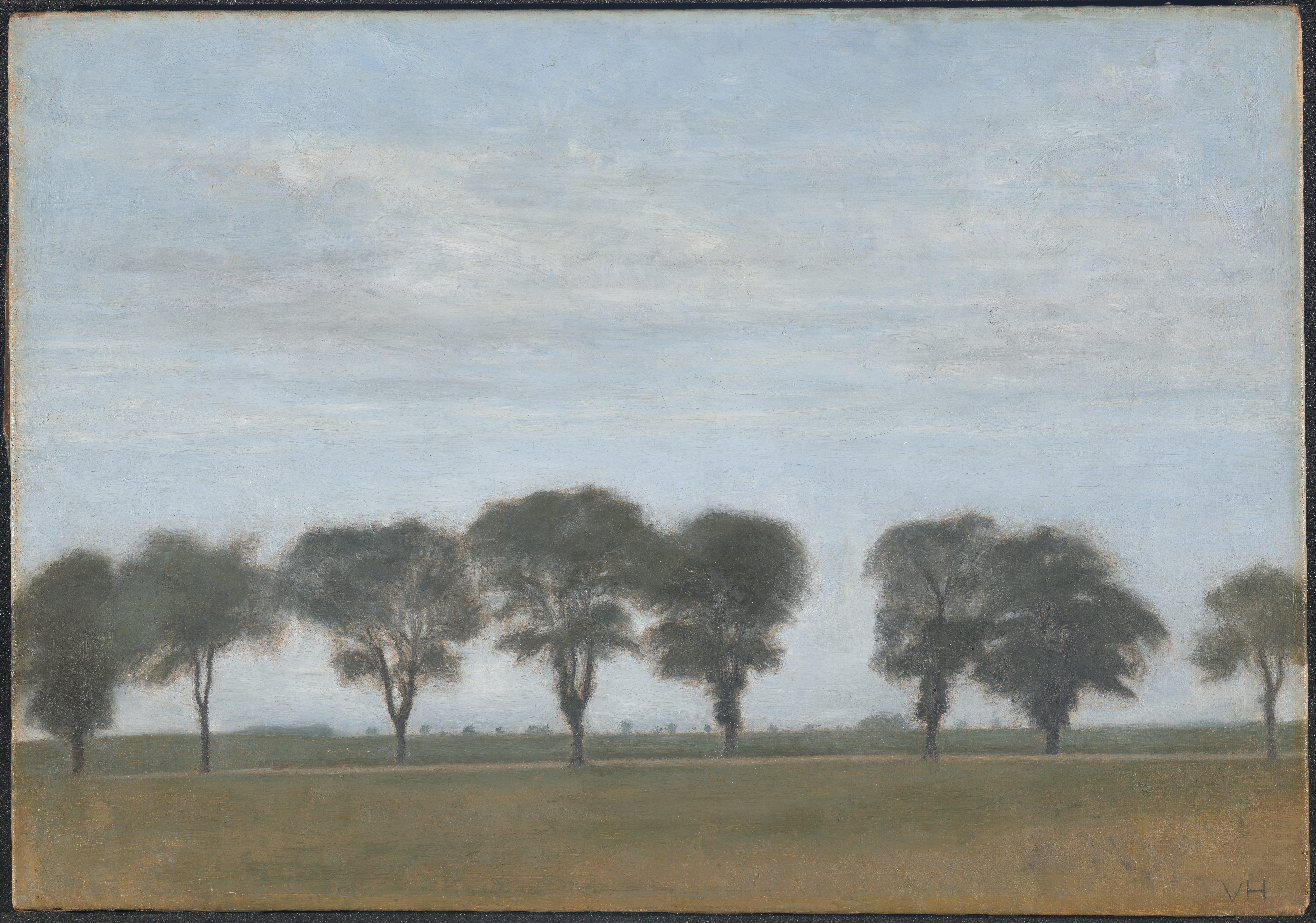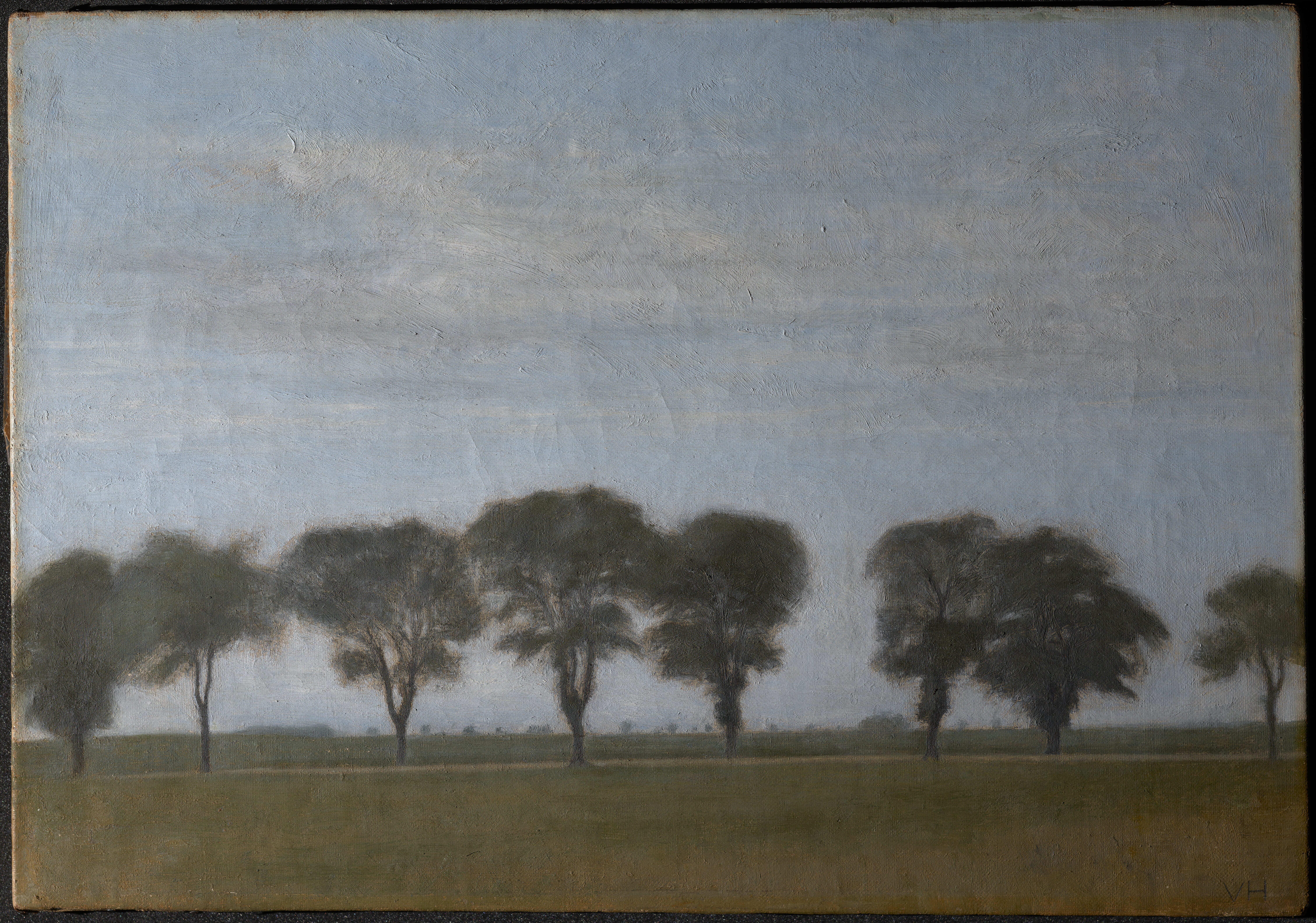 After their stay in Paris in 1892 Ida and Vilhelm Hammershøi went to the town Gentofte north of Copenhagen during summer. Here Hammershøi made a series of compositions with this motif from Kongevejen (Bramsen (1918) nos. 115,116 and 117). Notable is Hammershøi's interest in the parallel line formed by the row of trees stretching from side to side in the composition.