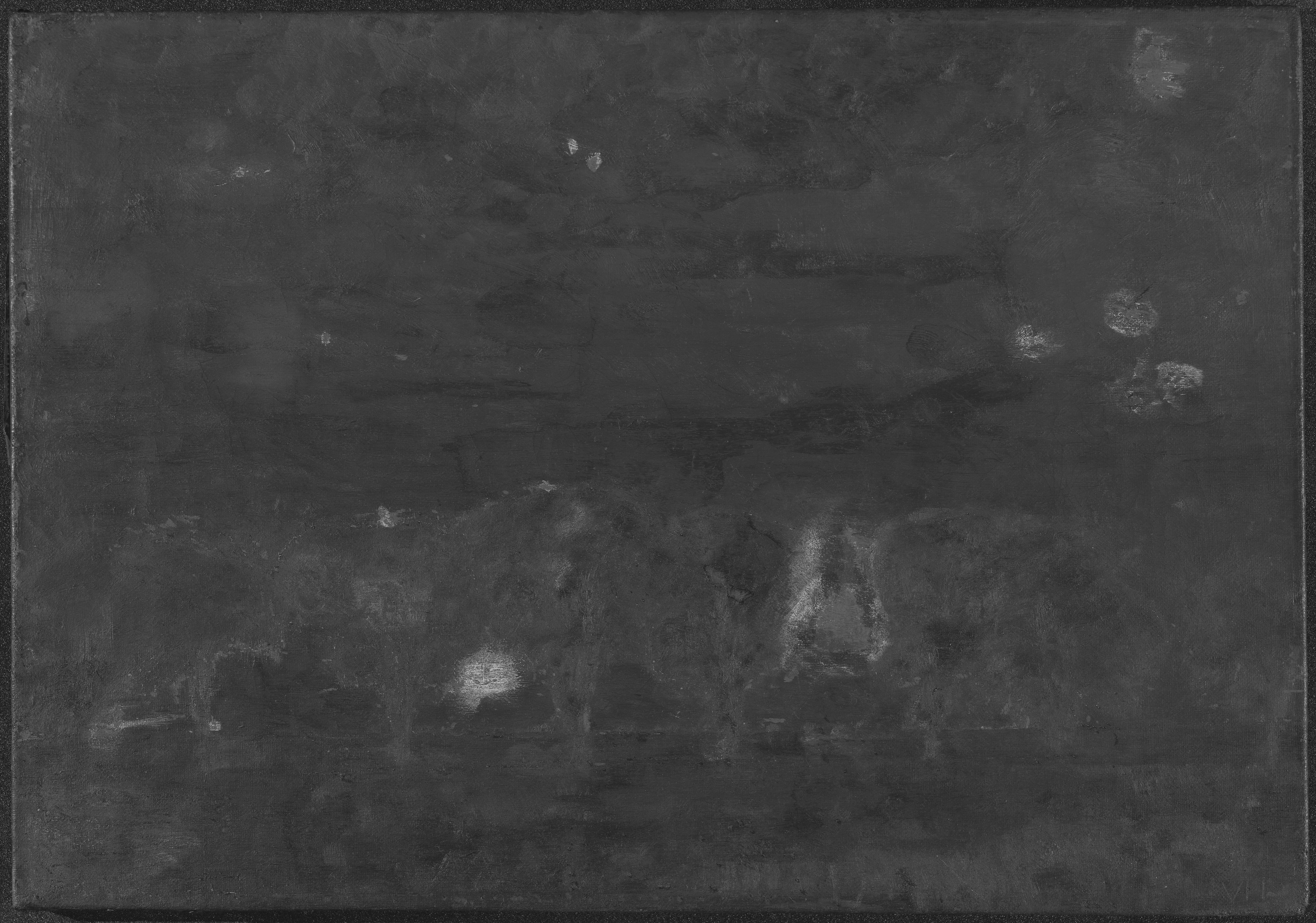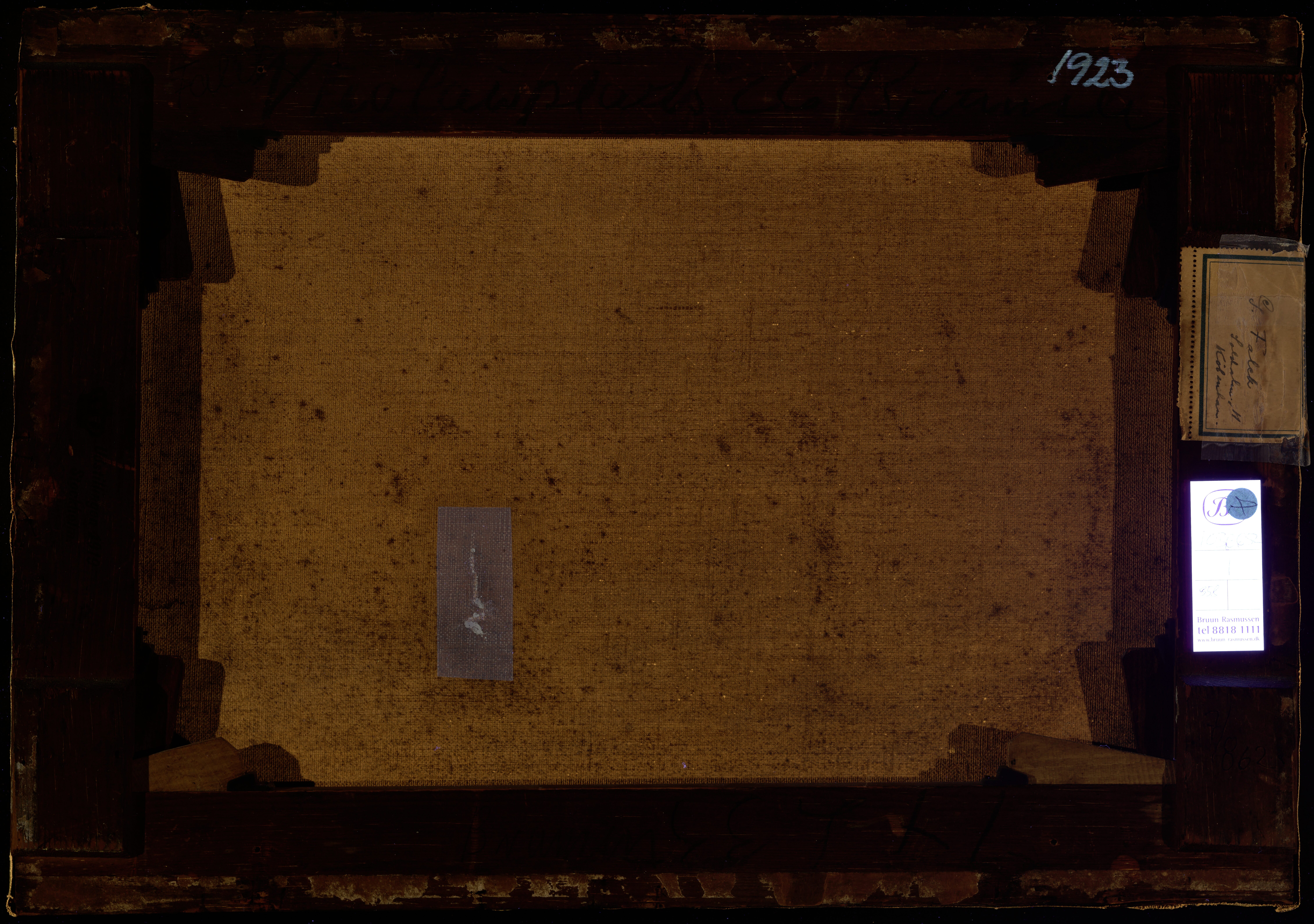 A yellow transparent layer covering part of the ground is seen on the left-hand tacking edge, a feature found in some other paintings by Hammershøi as well. It is uncertain whether it is an intermediate varnish or isolating layer applied on top of an underdrawing or whether it is an oil absorbed from the paint.