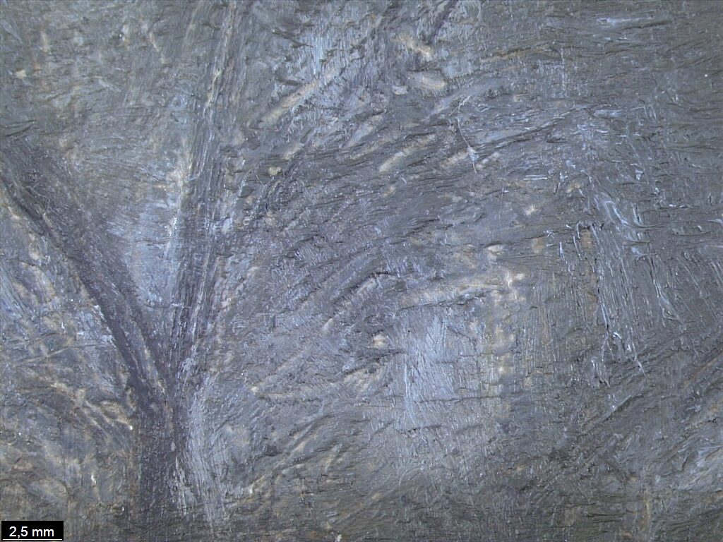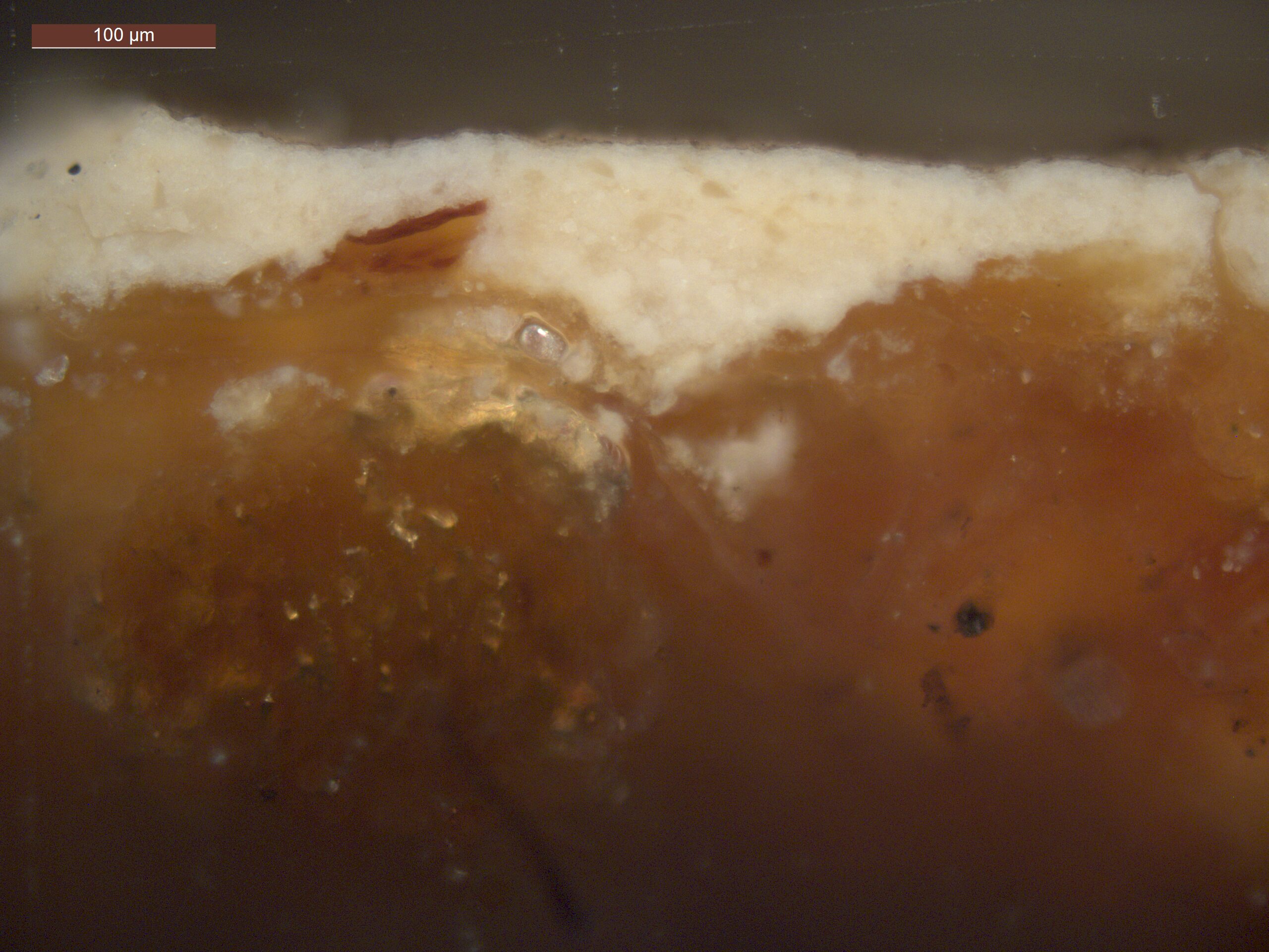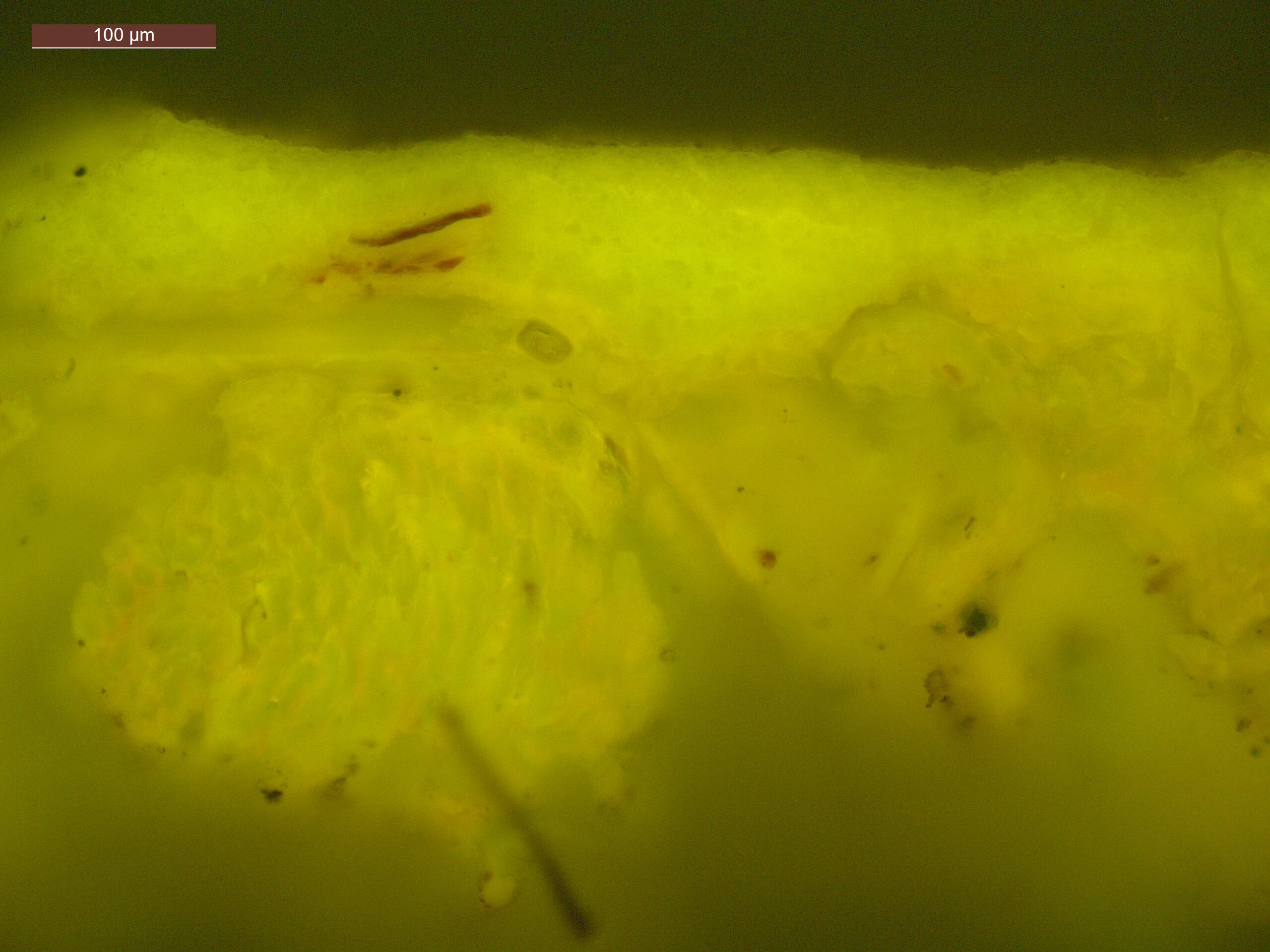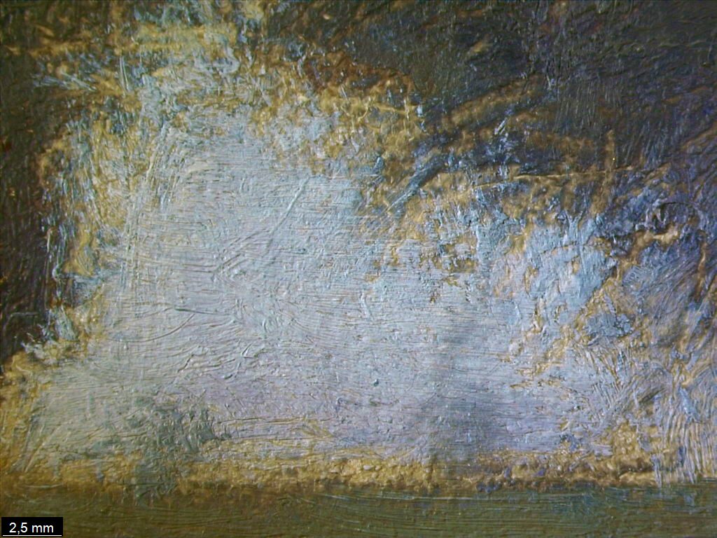 The light grey underpaint is thick and with a porous structure. The yellow underpaint of the foreground is thin and transparent.