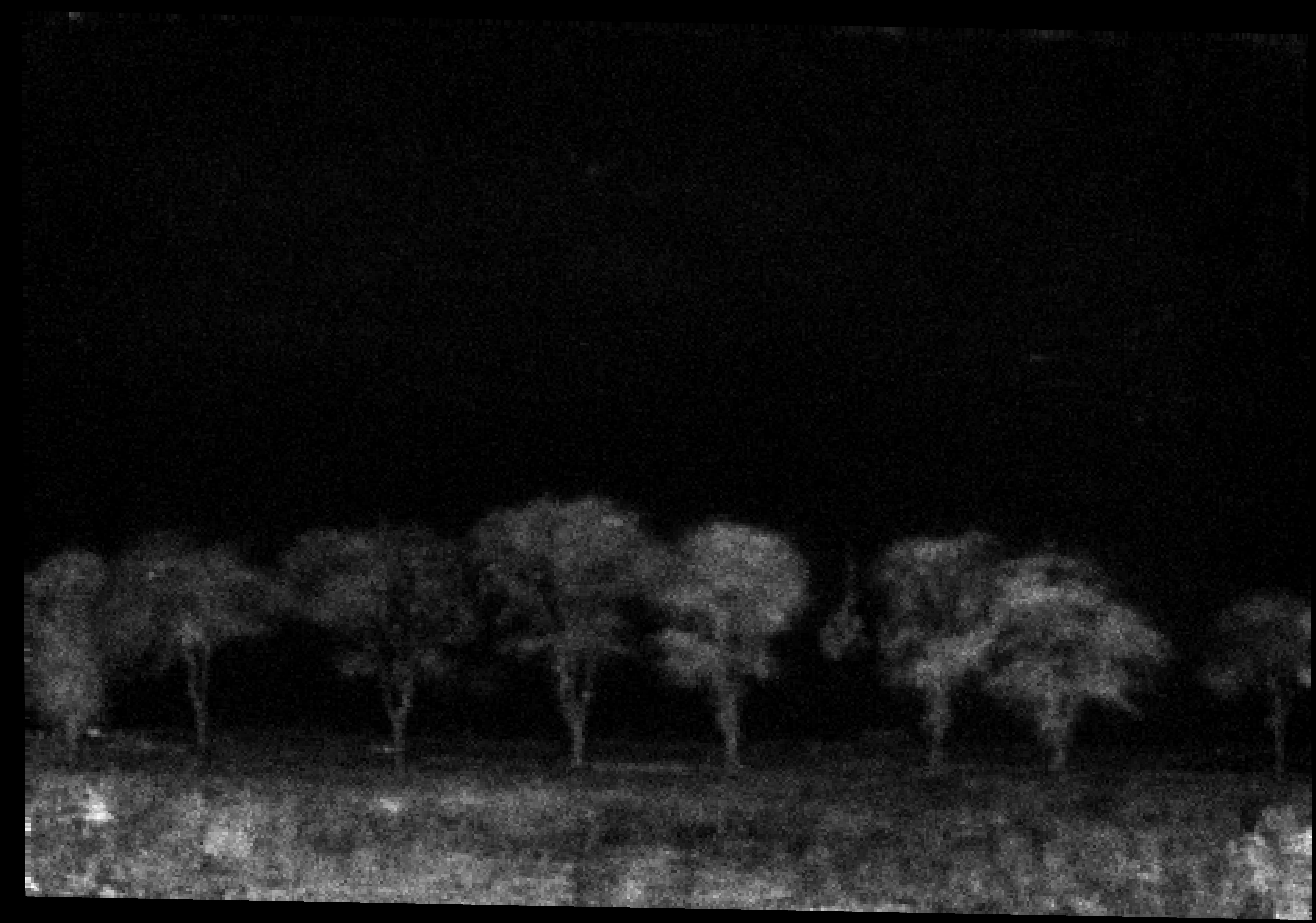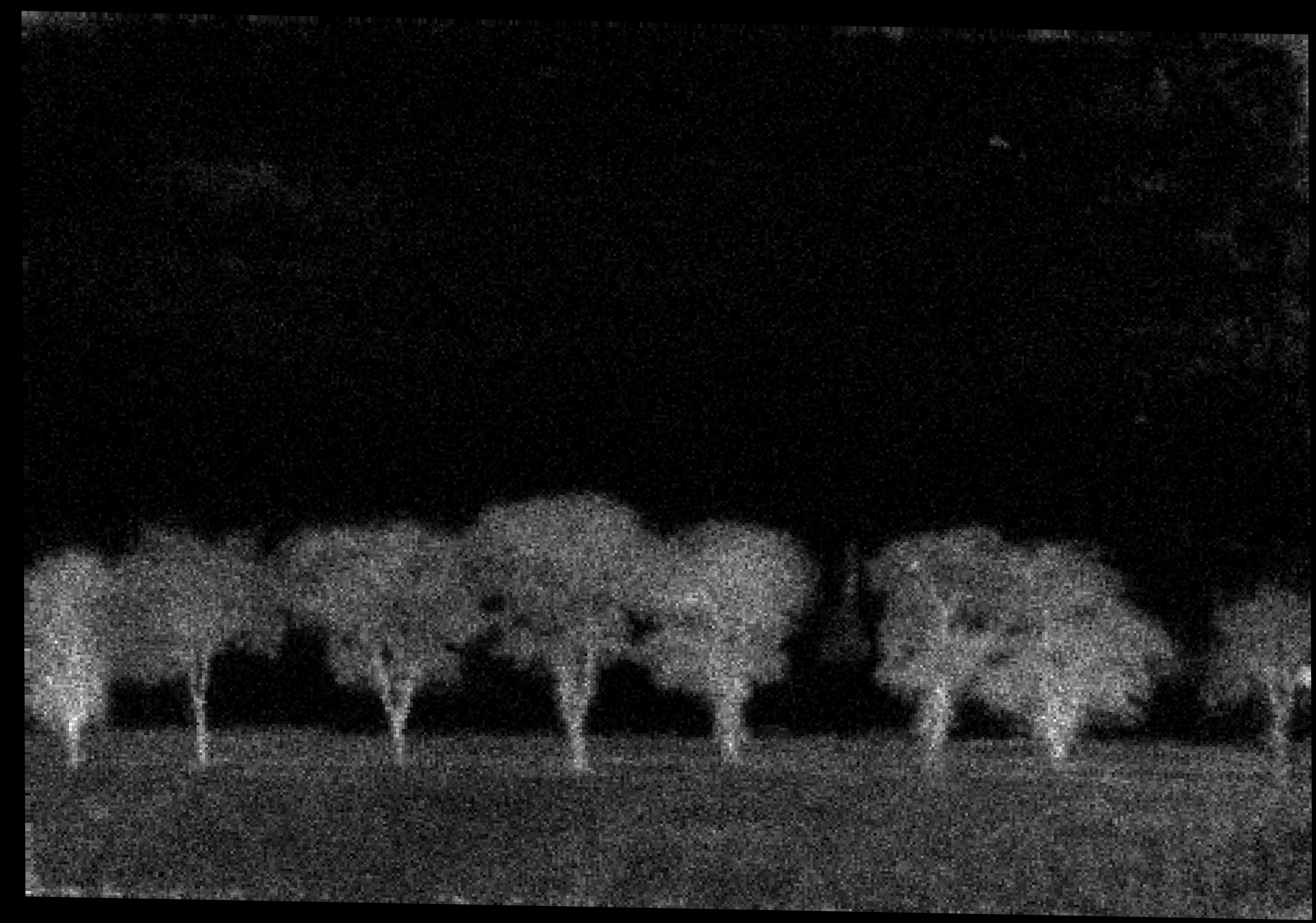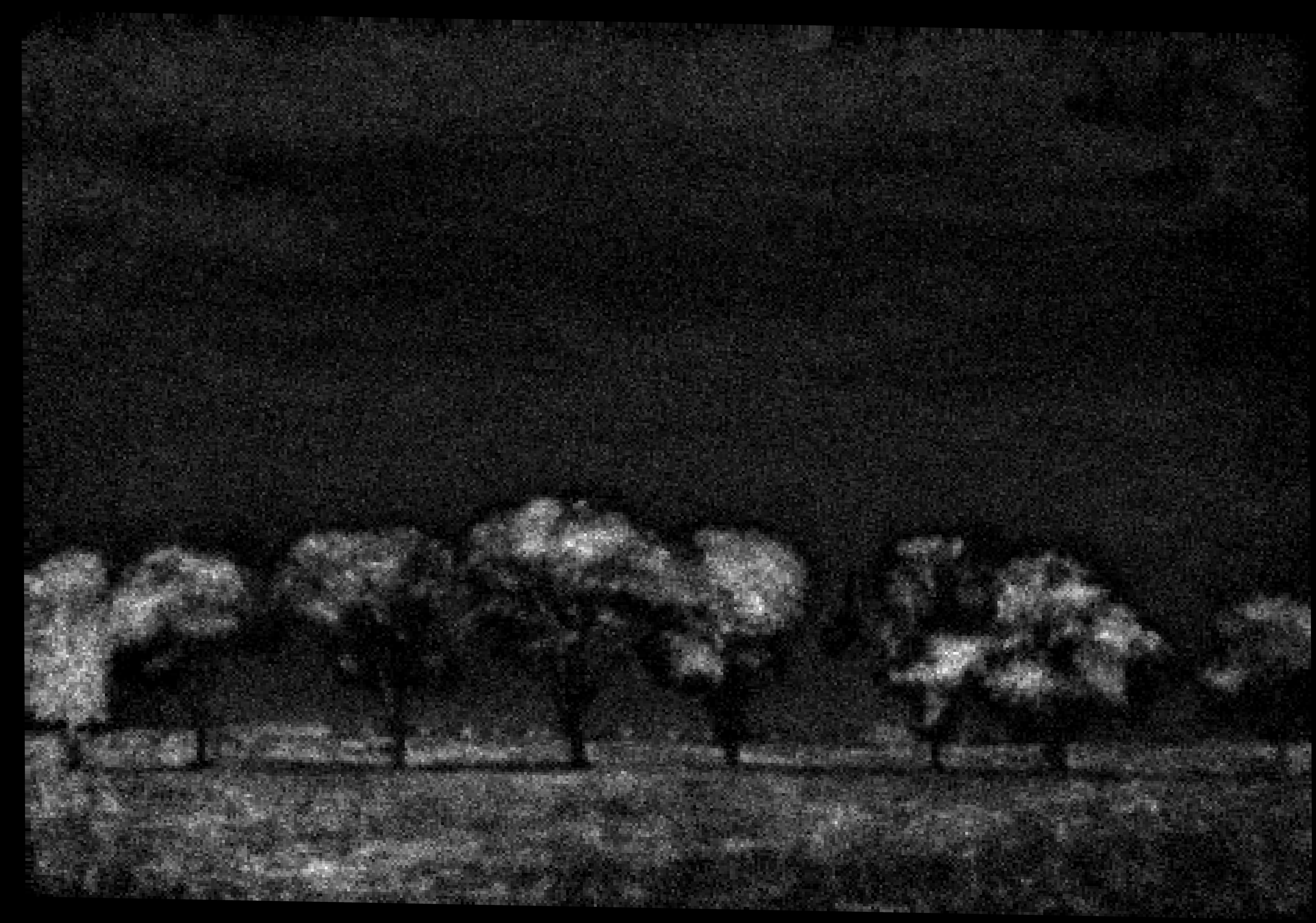 In the reserved zones around the trees and, to a lesser degree, in the reserves between the sky and the landscape.