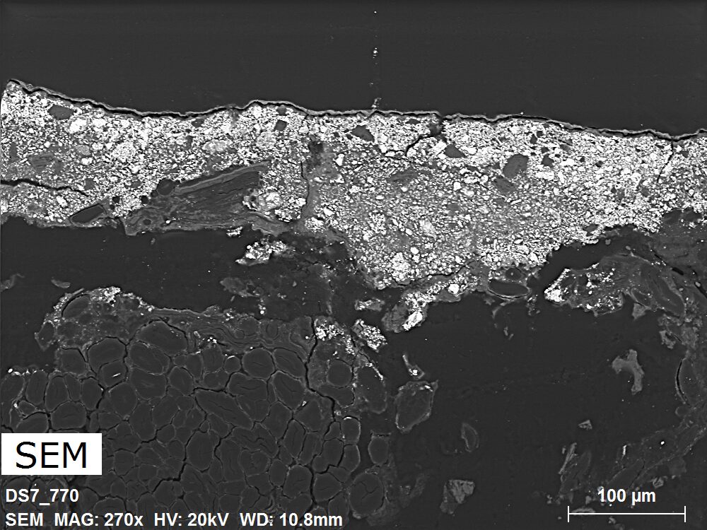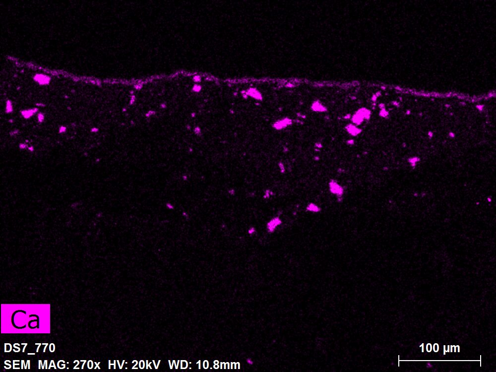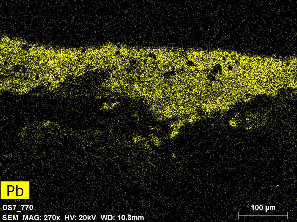 SEM-EDXS is a technique that provides highly detailed images at the microscopic level while simultaneously identifying the elemental composition of a sample. It is particularly valuable for studying the stratigraphy of paint cross sections at very fine scales, for the chemical characterisation of pigments, fillers and degradation products, and for detecting trace elements that may indicate very specific materials. Below, the elements listed in parentheses refer to minor elements whose relative abundance is below 10% of the total signal. The F1 map below represents the Pb M line. Read more under SEM-EDXS in the glossary.