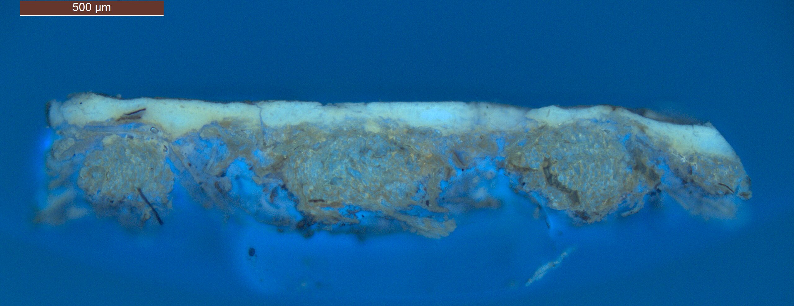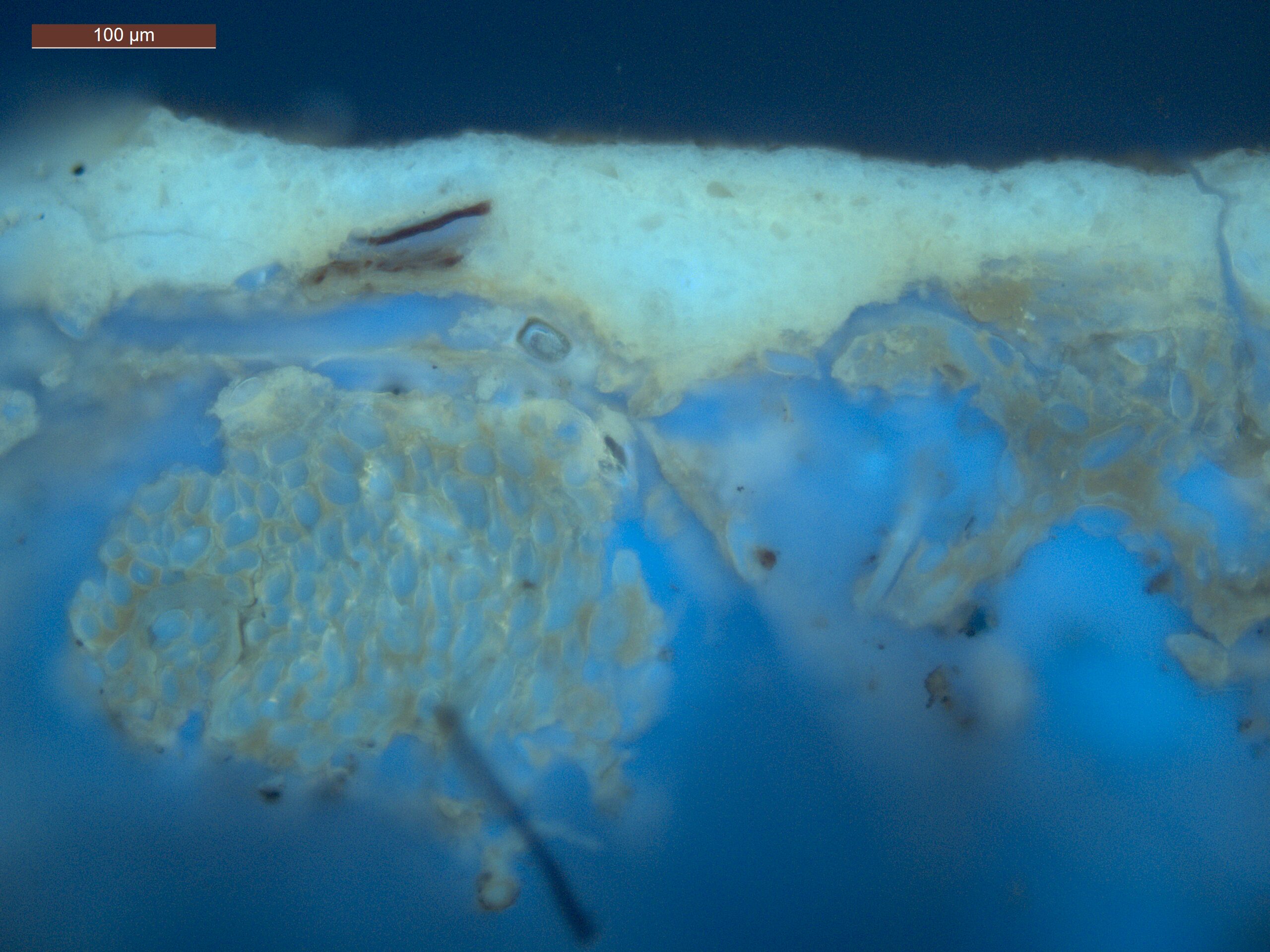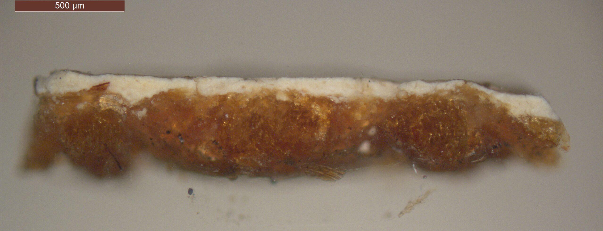Optical microscopy uses visible light and lenses to magnify and examine the surface and structure of a painting. When applied to cross sections of paint samples, it allows for detailed observation of a painting’s stratigraphy (layer structure) and pigment particles. It is often employed with various illumination techniques, such as dark field and UV fluorescence, to enhance the analysis. Layer number 1 in the results section below the images refers to the layer at the bottom of the cross section.