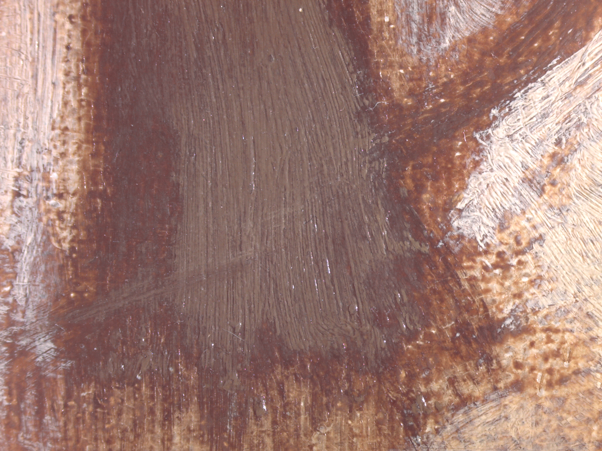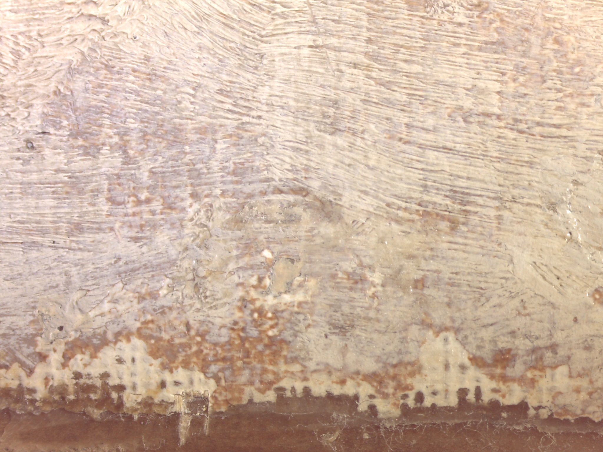 The rather warm general tonality of the painting is probably in part due to a combination of the wax-resin impregnation and a darkening of the varnish on the surface.