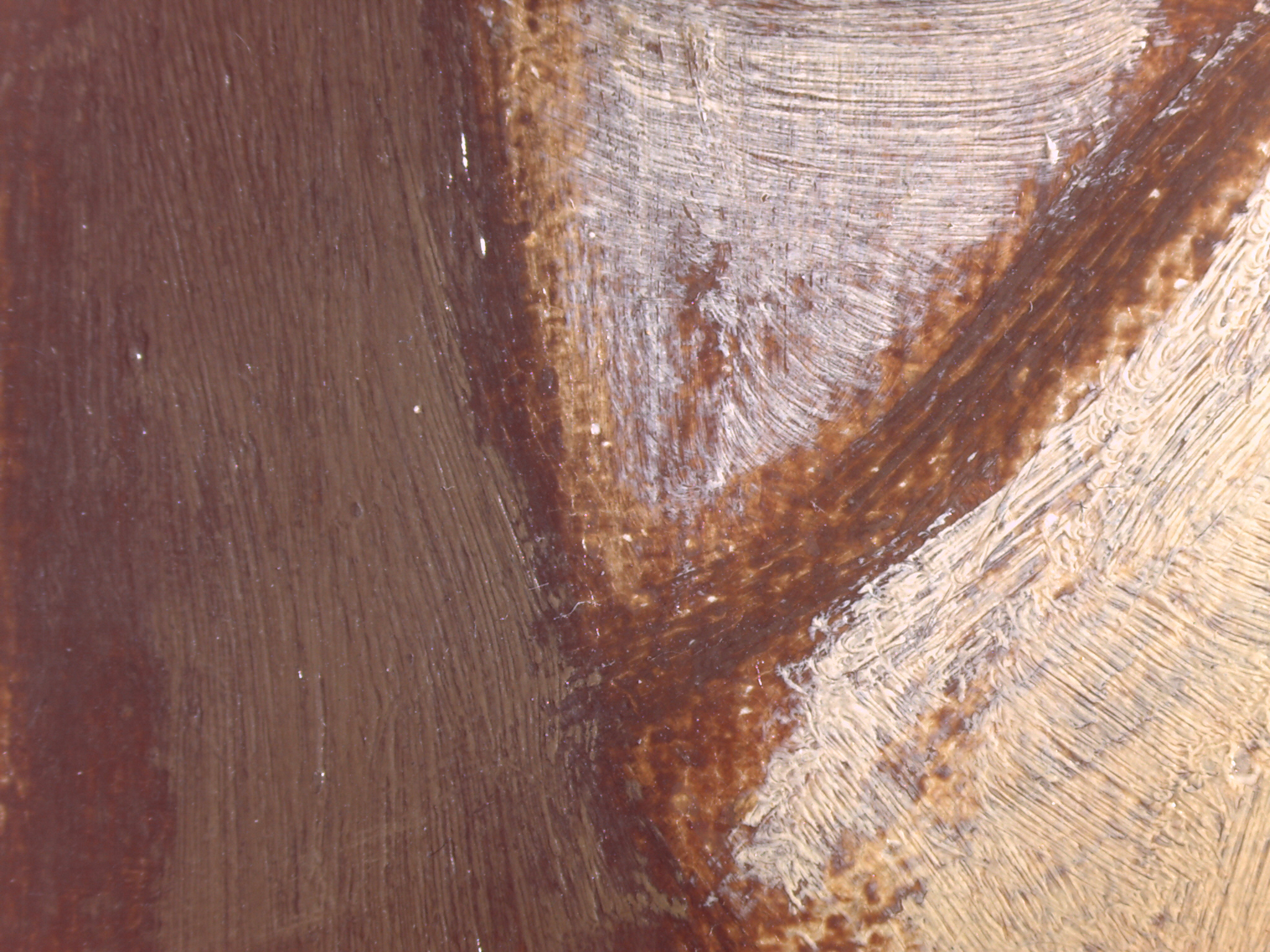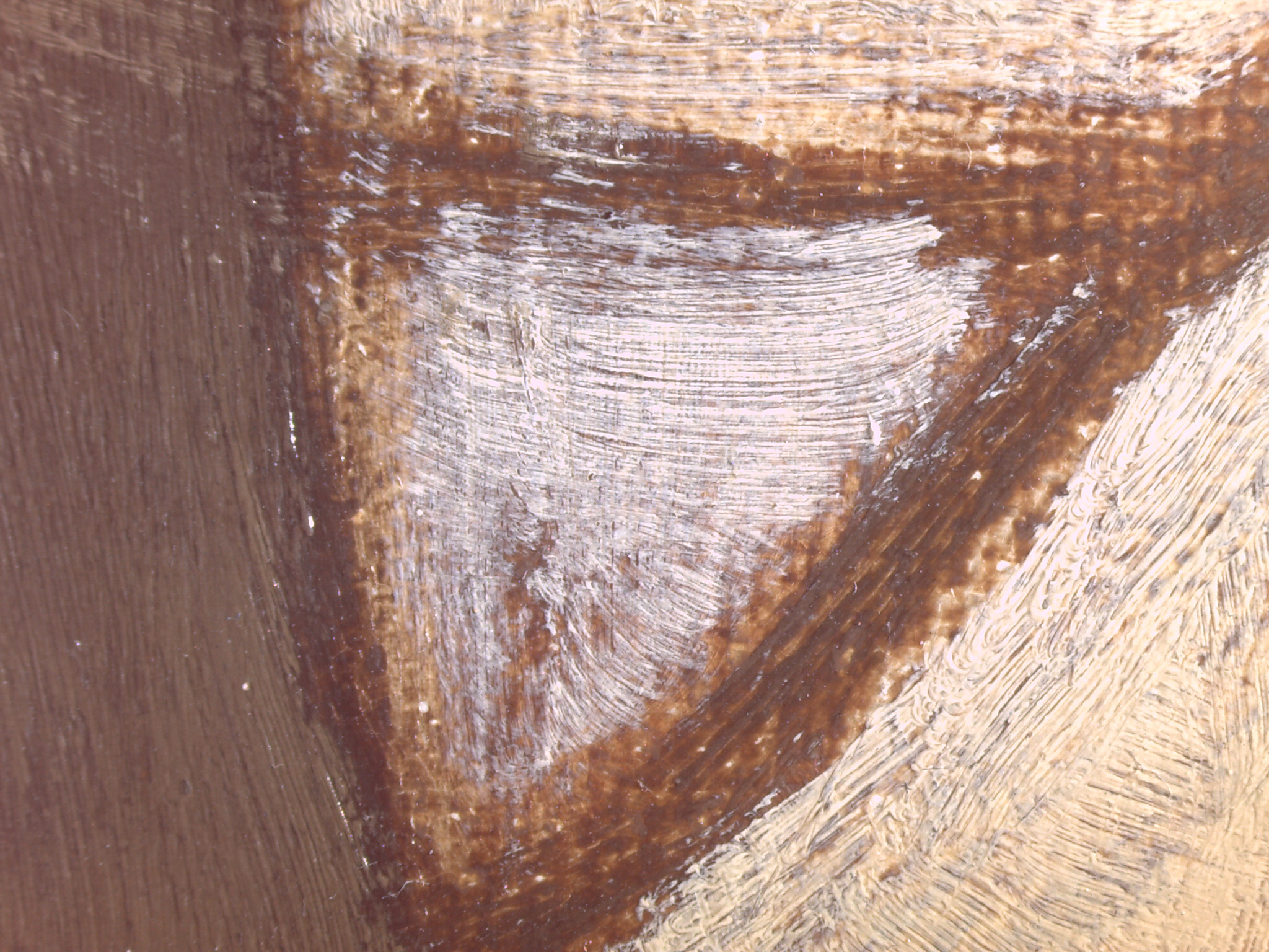 The ground layer is a preparatory layer applied directly to the support to create a smooth surface for painting. It is typically opaque and monochrome in color, providing a neutral base that influences the subsequent application of paint layers and the final appearance of the painting. The composition of the ground layer varies depending on the type of support and the historical period of the artwork. Hammershøi typically painted on white and industrially primed canvasses.