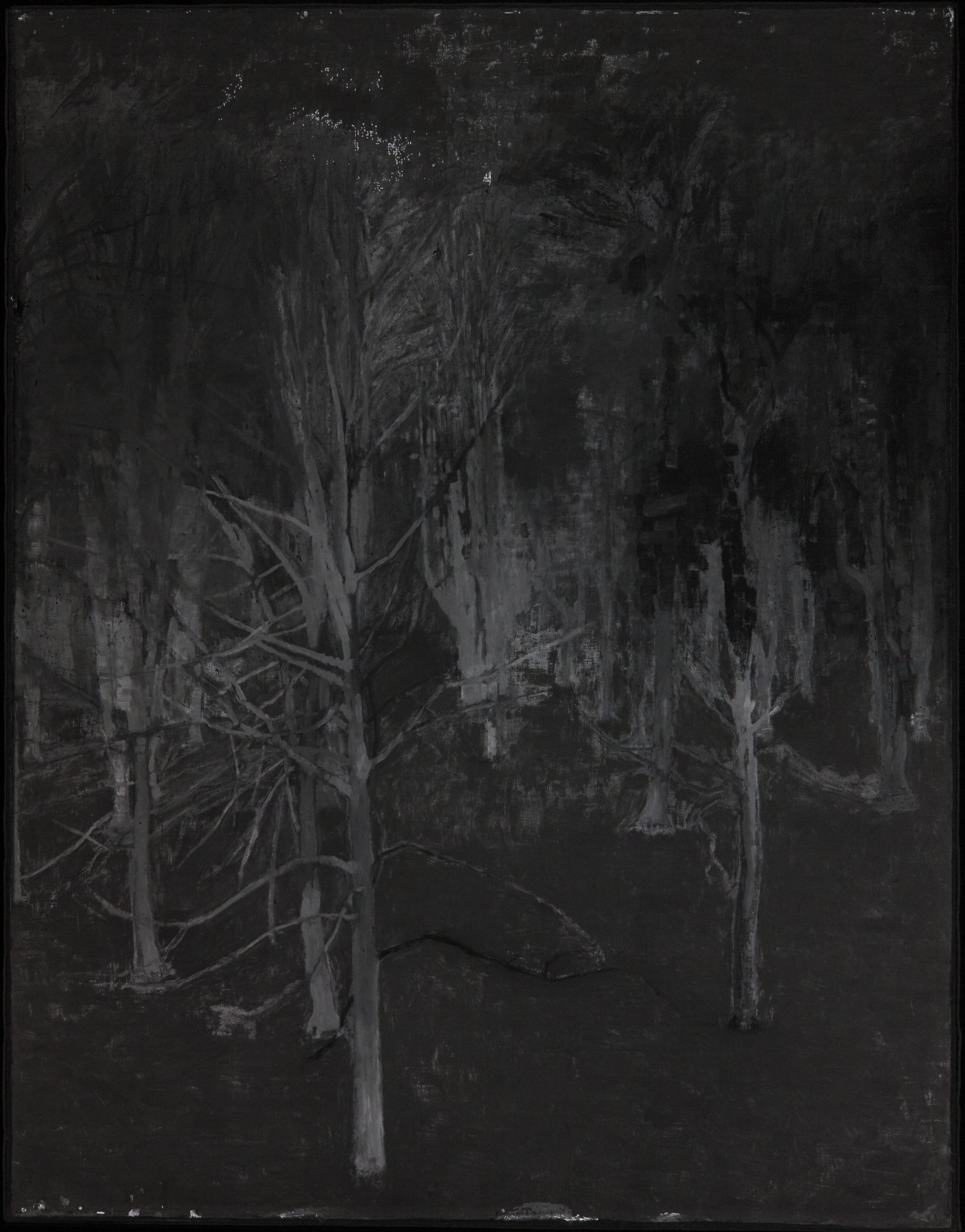 The trees were painted first, followed by the grey paint of the sky and the snow. While the paint of the sky overlaps the trees in places, the white of the snow is painted around the trunks and branches and mostly leaves gaps with exposed underpaint around them. The tree trunks and branches were painted initially with a dark brown, the trunks subsequently covered partly with the dark olive-green paint.