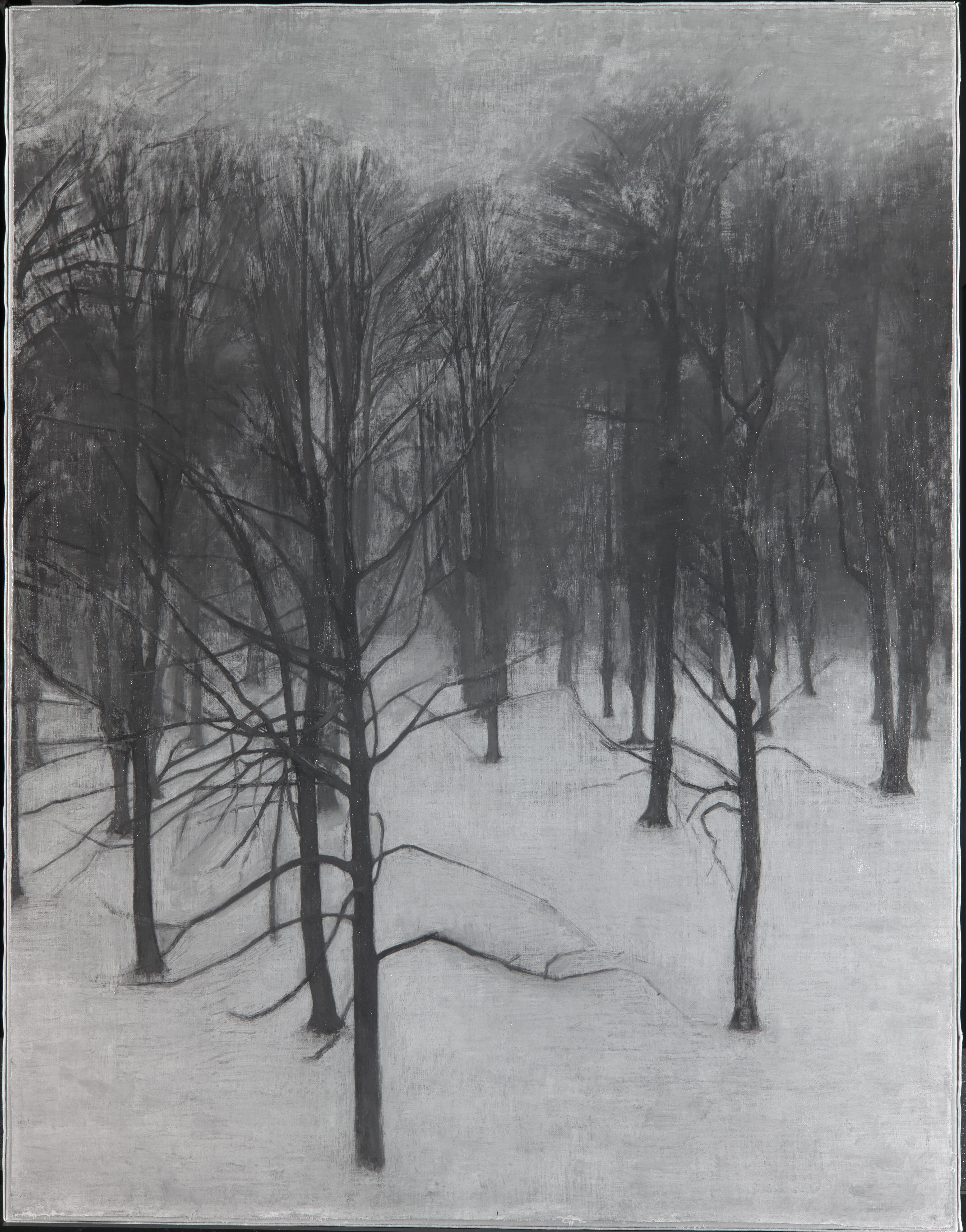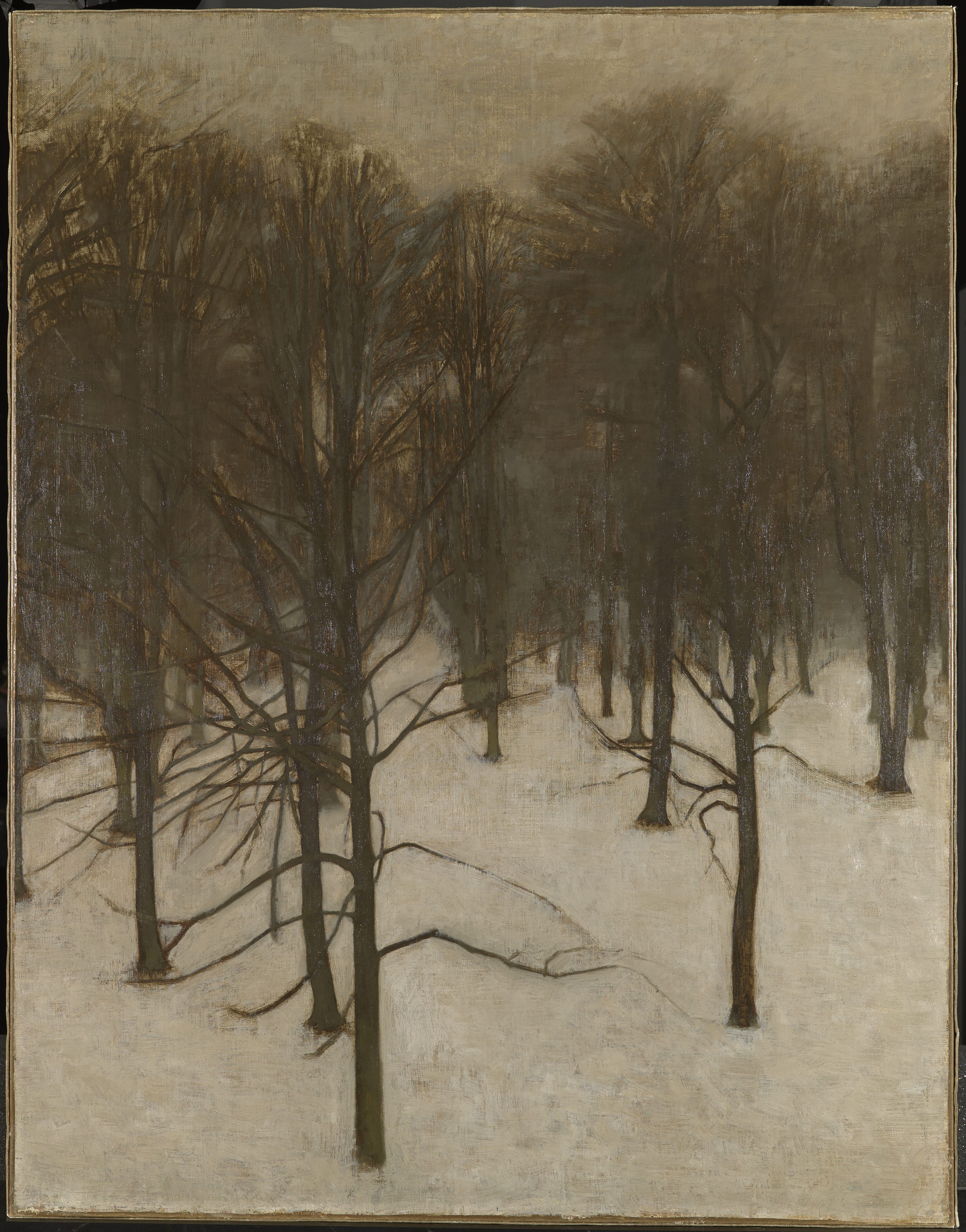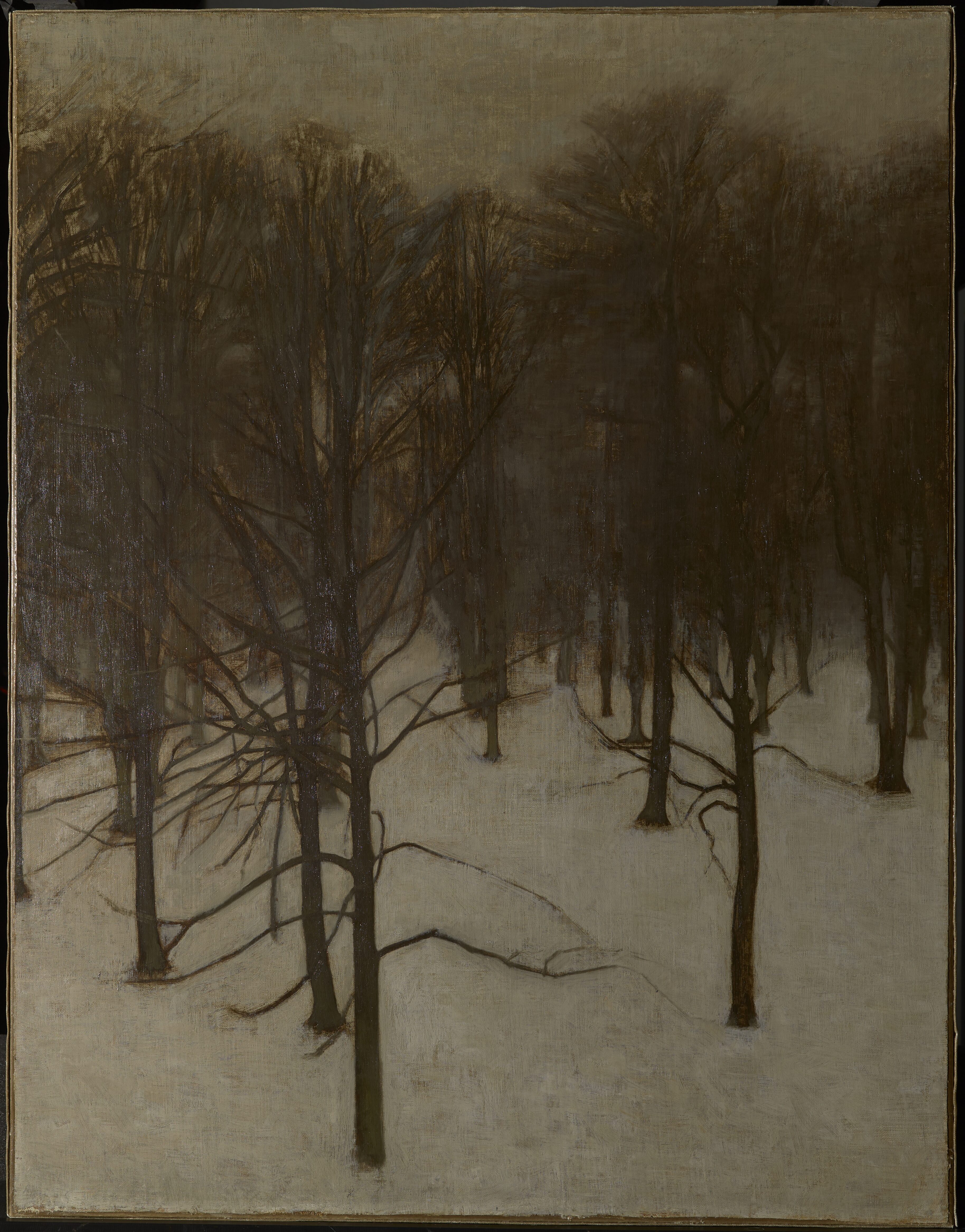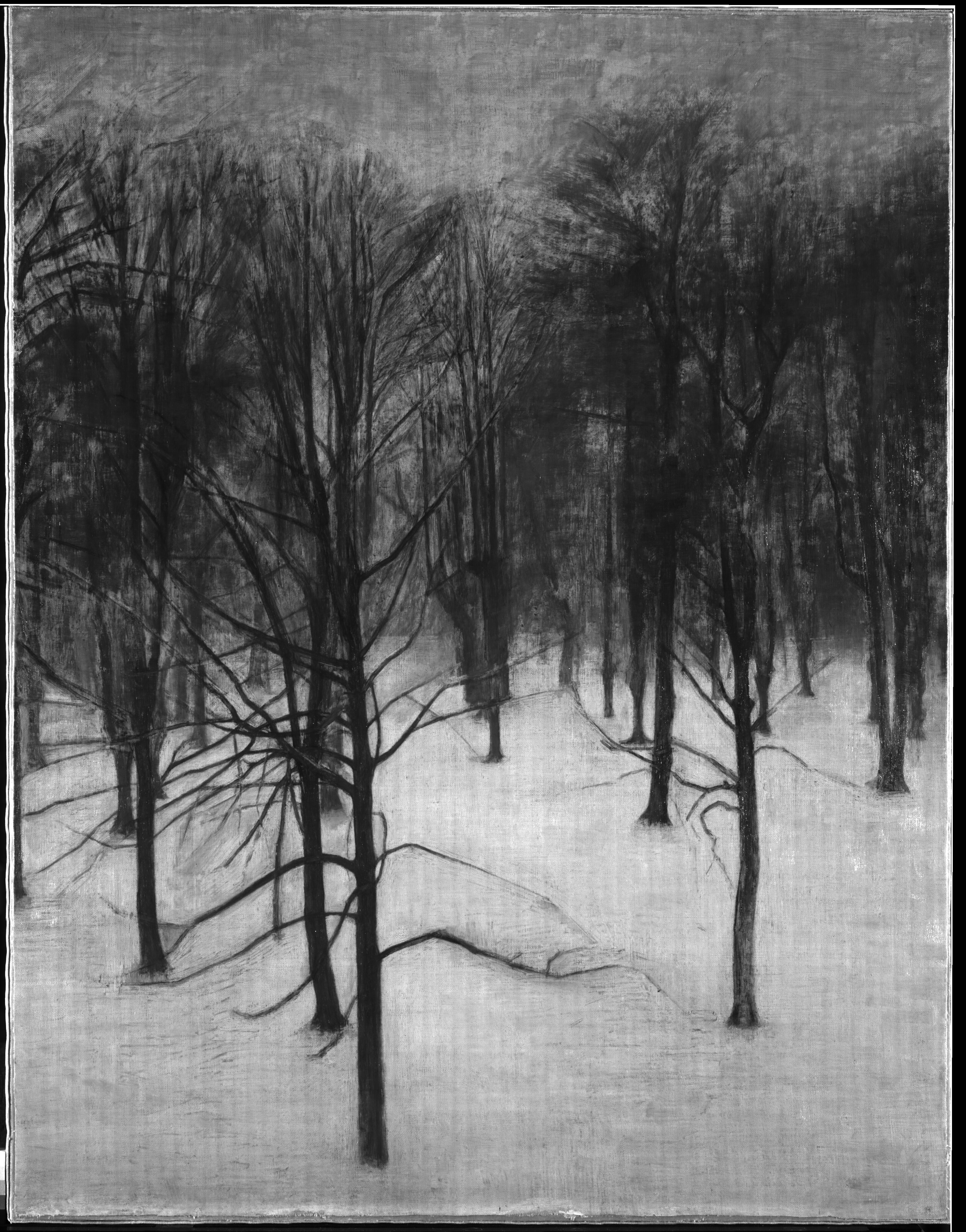 SNE-LANDSKAB. Søndermarken. Jorden er dækket af Sne, mod hvilken nogle nøgne Træer tegner deres Stammer, medens deres Grenetoppe fortoner sig mod den graa Luft. Billedet var oprindelig større; den ufærdige Del blev afskaaret.