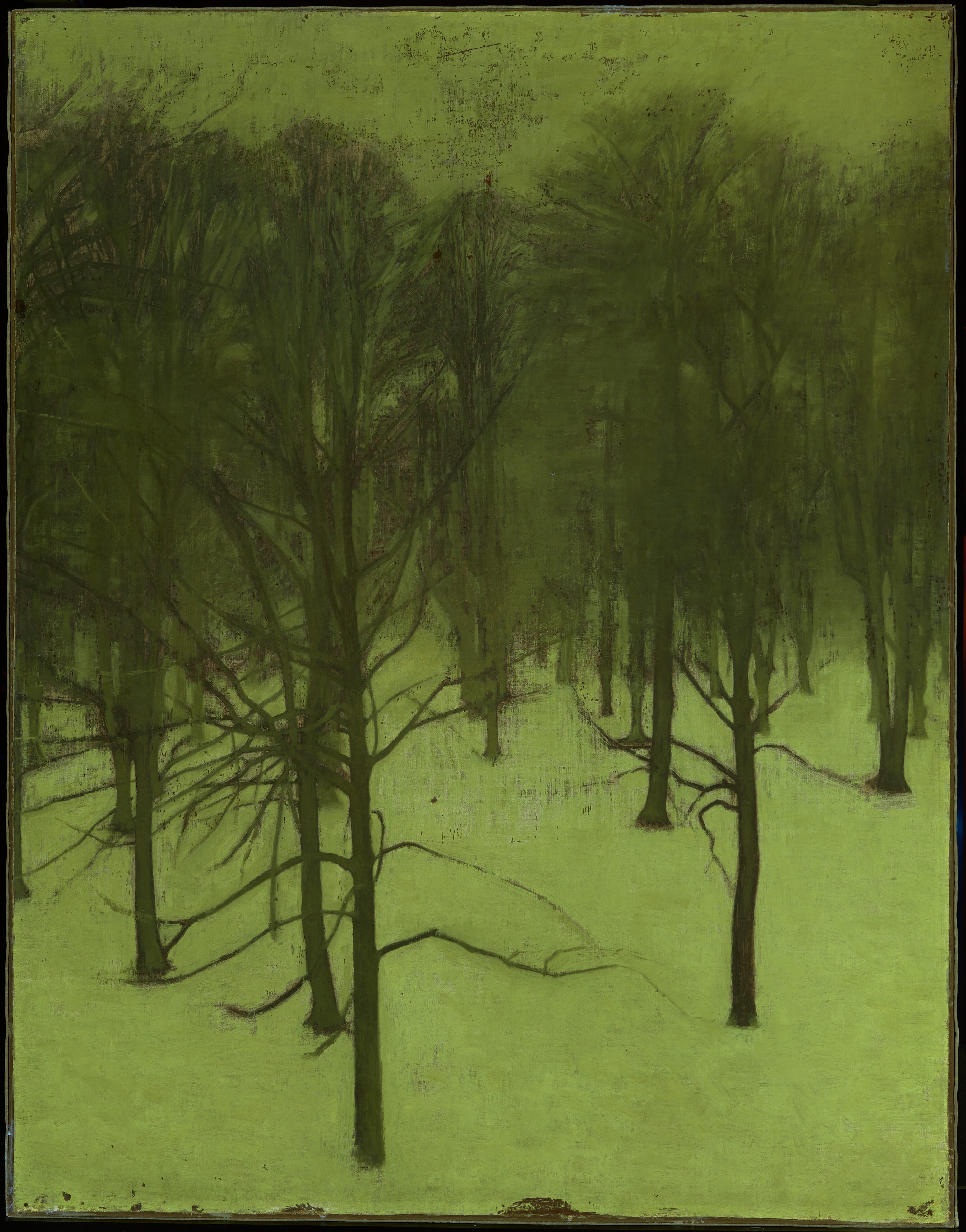 The paint application is rather open throughout the painting, leaving the ground and underpainting exposed in many places of the foreground and the trees and, even more so, in the sky. The majority of the paint strokes in the snow and the sky are rather short, whereas they are longer in the trunks and branches of the trees. The direction of the paint strokes is varying, with a predominantly horizontal direction in the foreground but with many brushstrokes also following the outlines of tree trunks and branches. In the thicket of the trees the predominant direction is more vertical.