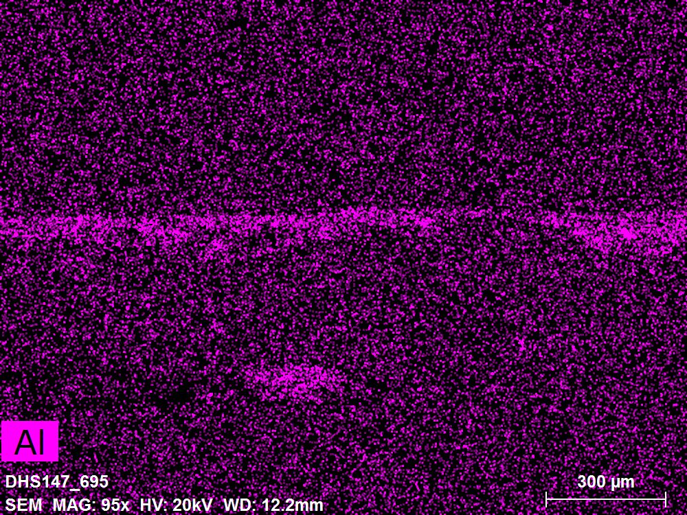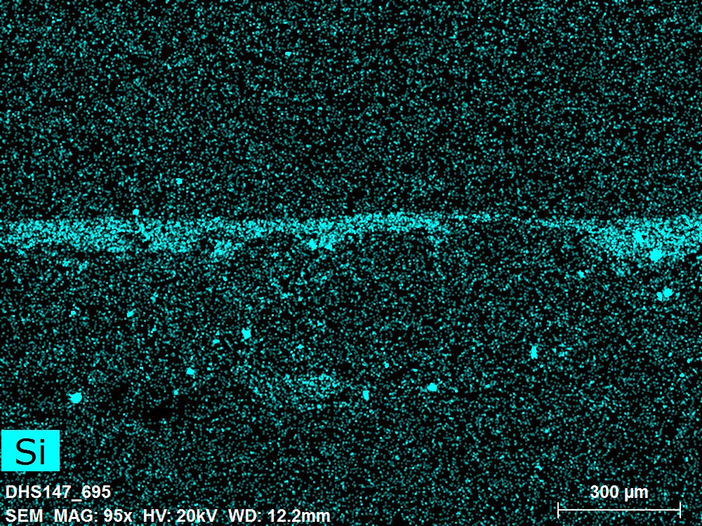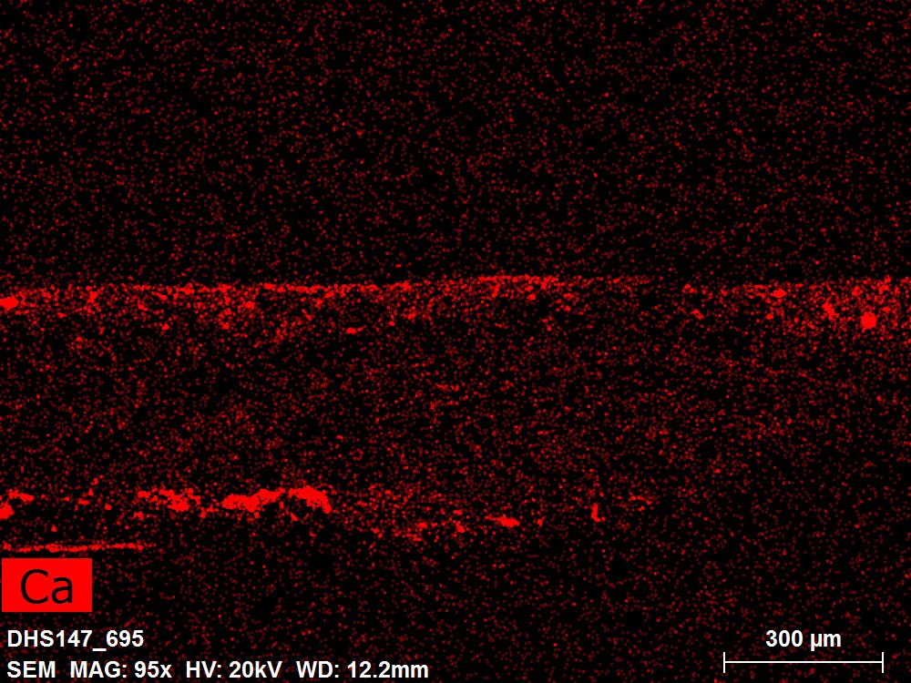 SEM-EDXS is a technique that provides highly detailed images at the microscopic level while simultaneously identifying the elemental composition of a sample. It is particularly valuable for studying the stratigraphy of paint cross sections at very fine scales, for the chemical characterisation of pigments, fillers and degradation products, and for detecting trace elements that may indicate very specific materials. Below, the elements listed in parentheses refer to minor elements whose relative abundance is below 10% of the total signal. The F1 map below represents the Pb M line. Read more under SEM-EDXS in the glossary.