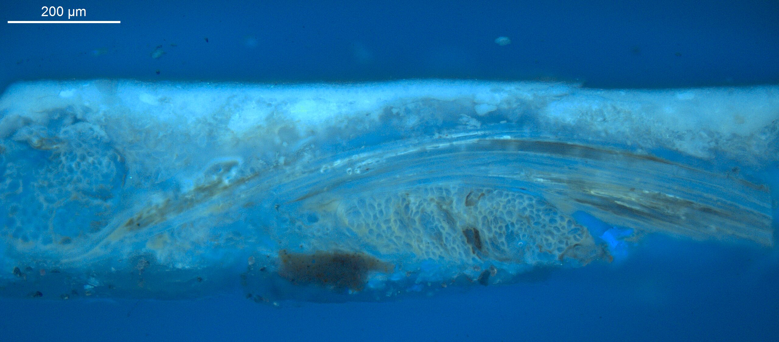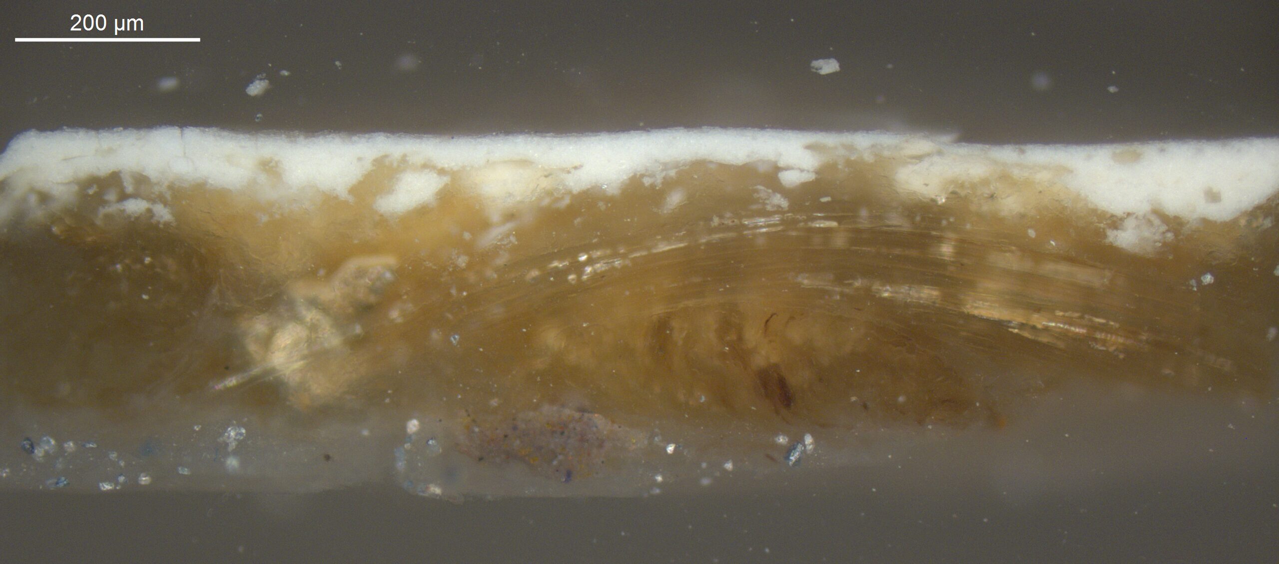 Optical microscopy uses visible light and lenses to magnify and examine the surface and structure of a painting. When applied to cross sections of paint samples, it allows for detailed observation of a painting’s stratigraphy (layer structure) and pigment particles. It is often employed with various illumination techniques, such as dark field and UV fluorescence, to enhance the analysis. Layer number 1 in the results section below the images refers to the layer at the bottom of the cross section.