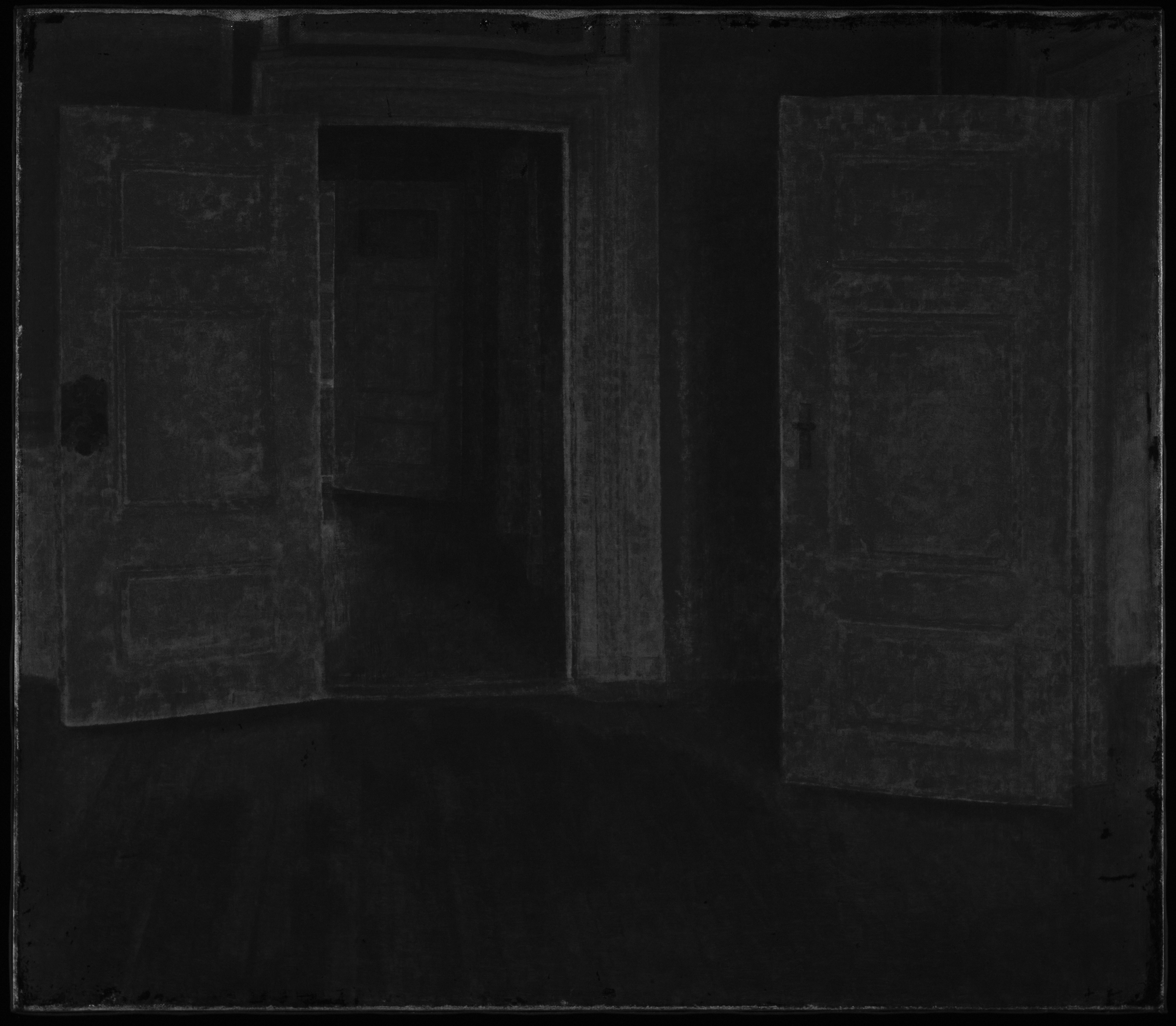 A varnish is sometimes applied as a final transparent layer over the dried paint layer to protect the artwork from dust, dirt, and mechanical damage. In addition to providing protection, varnish saturates the colours and evens out the surface gloss. Over time, this layer may yellow, or degrade. Until the 20th century, it was common practice to varnish oil paintings. In Hammershøi’s time, however, oil paintings were not always varnished, and we know that Hammershøi sometimes deliberately chose to leave his works unvarnished.