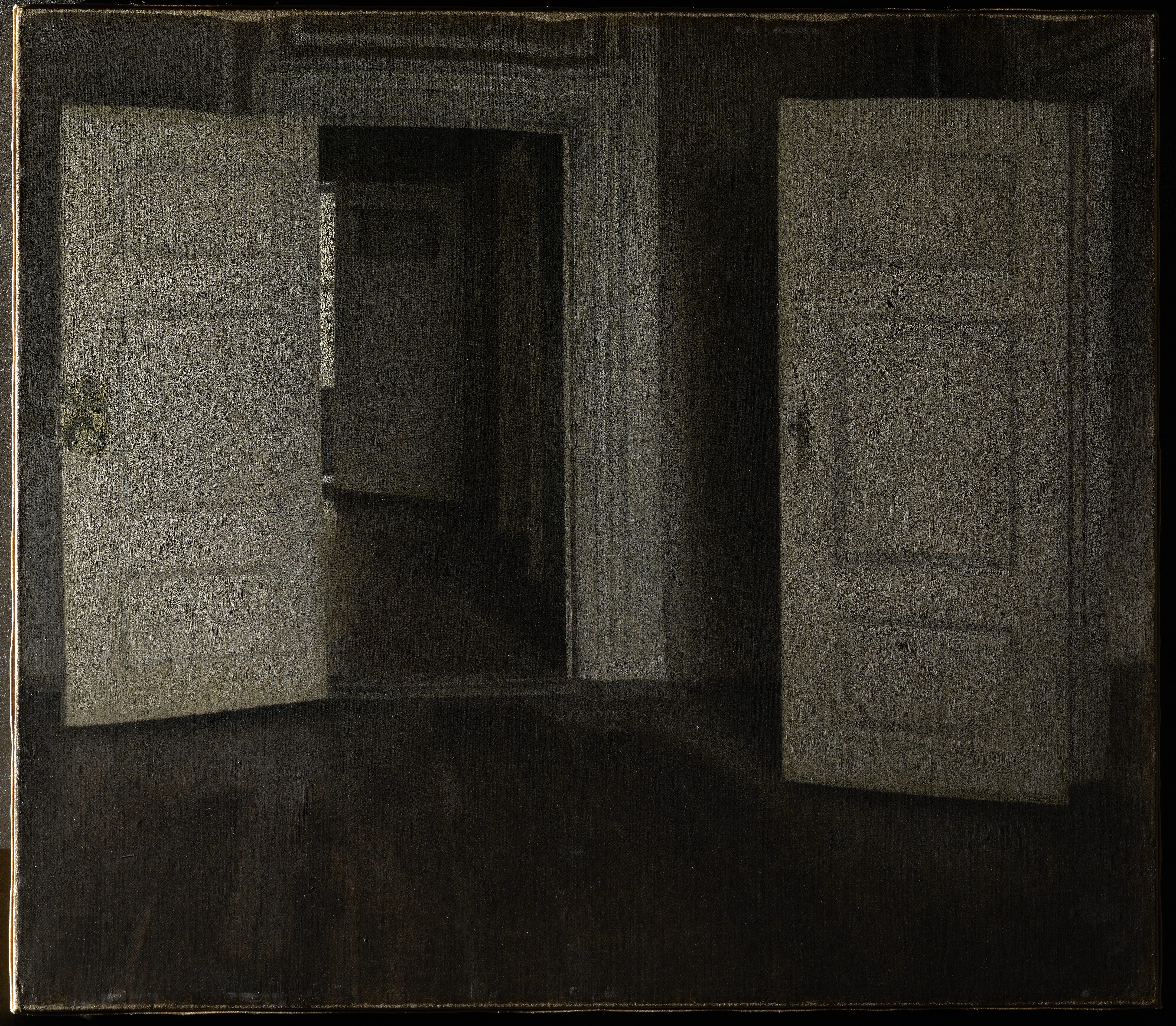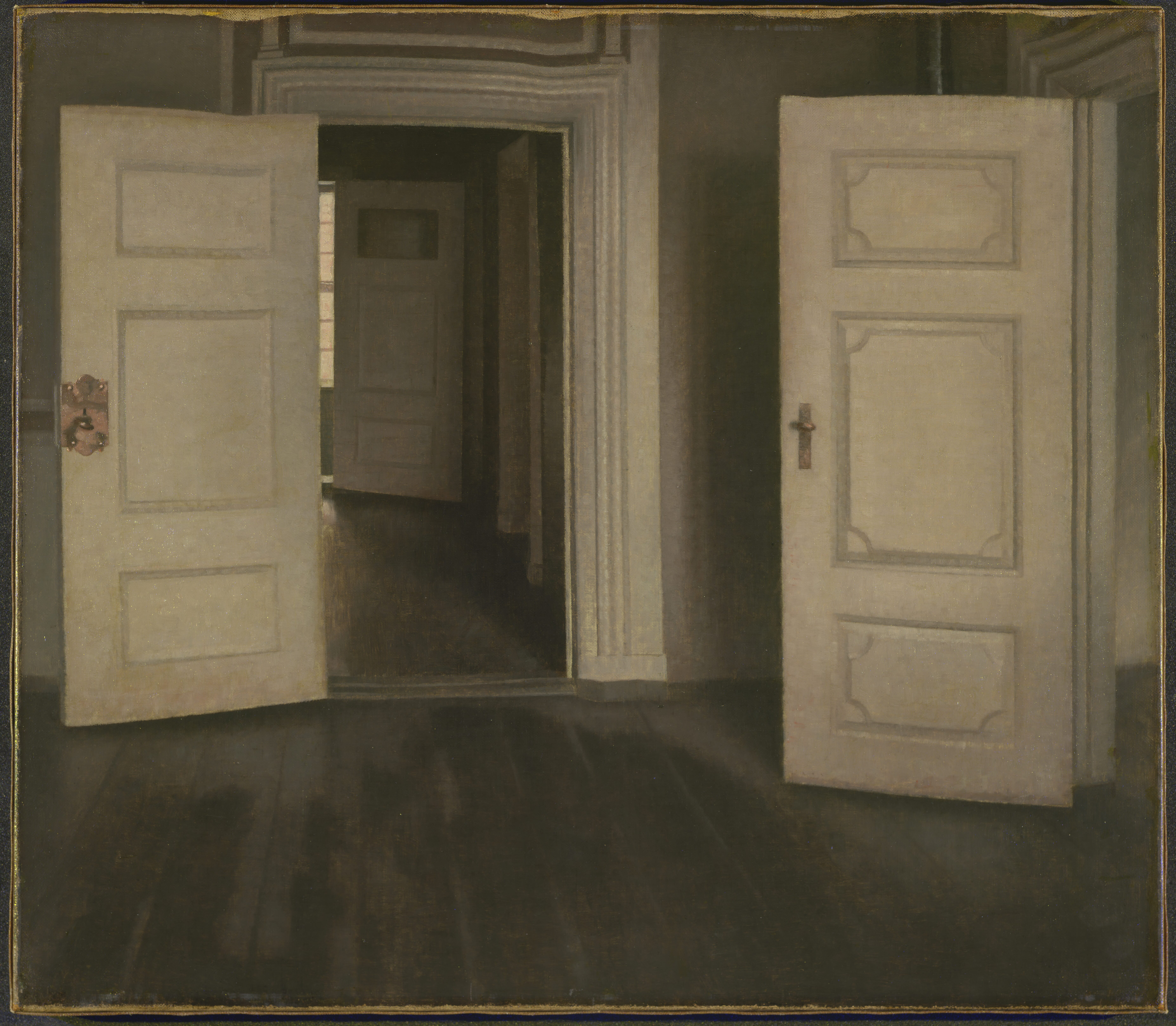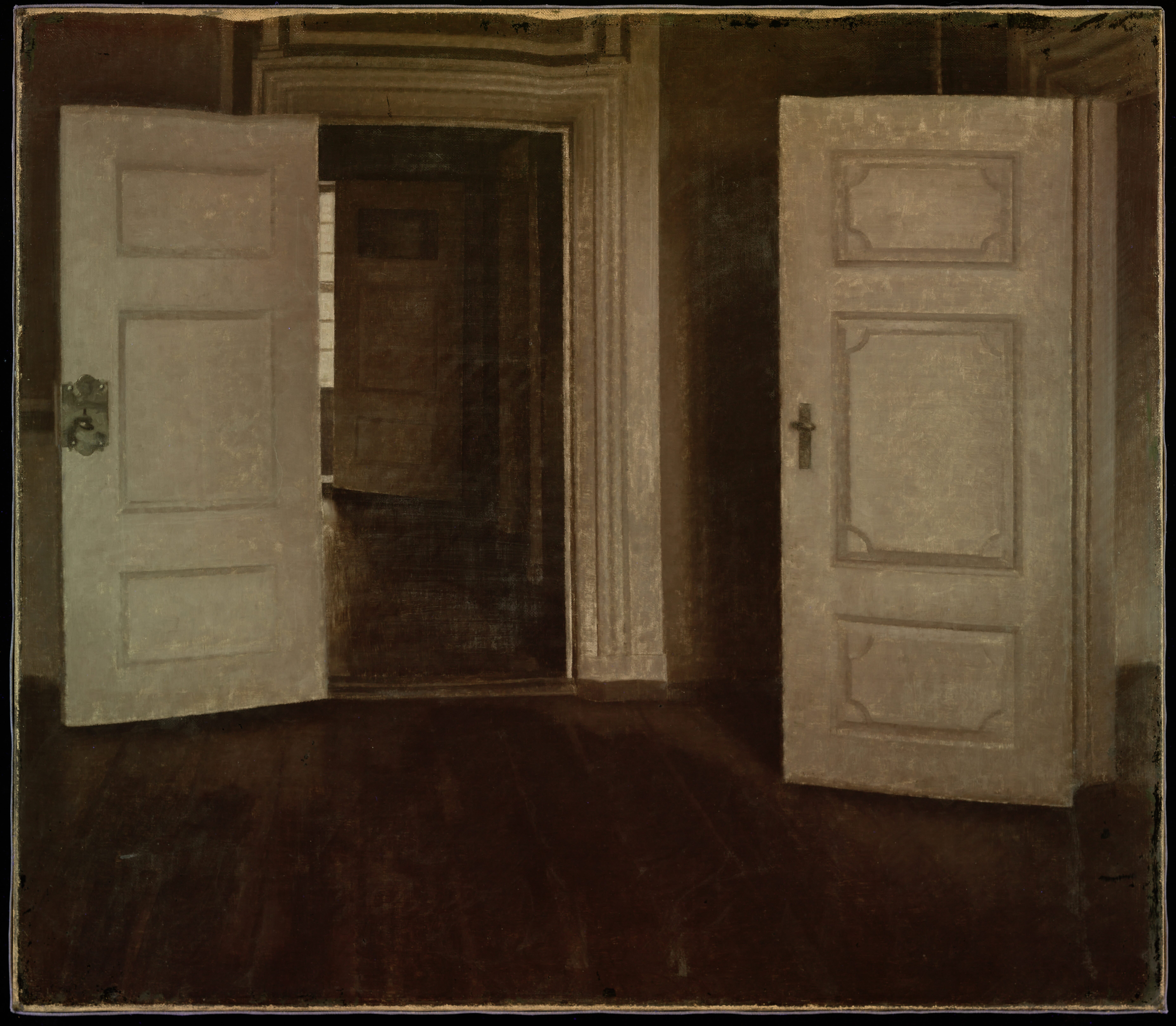 Hammershøi excels in intriguing views like this where the main motif is a flow leading through a line of half-opened doors. A plotless motif that results in a lot of questions seeking to find a plot: what is going on?