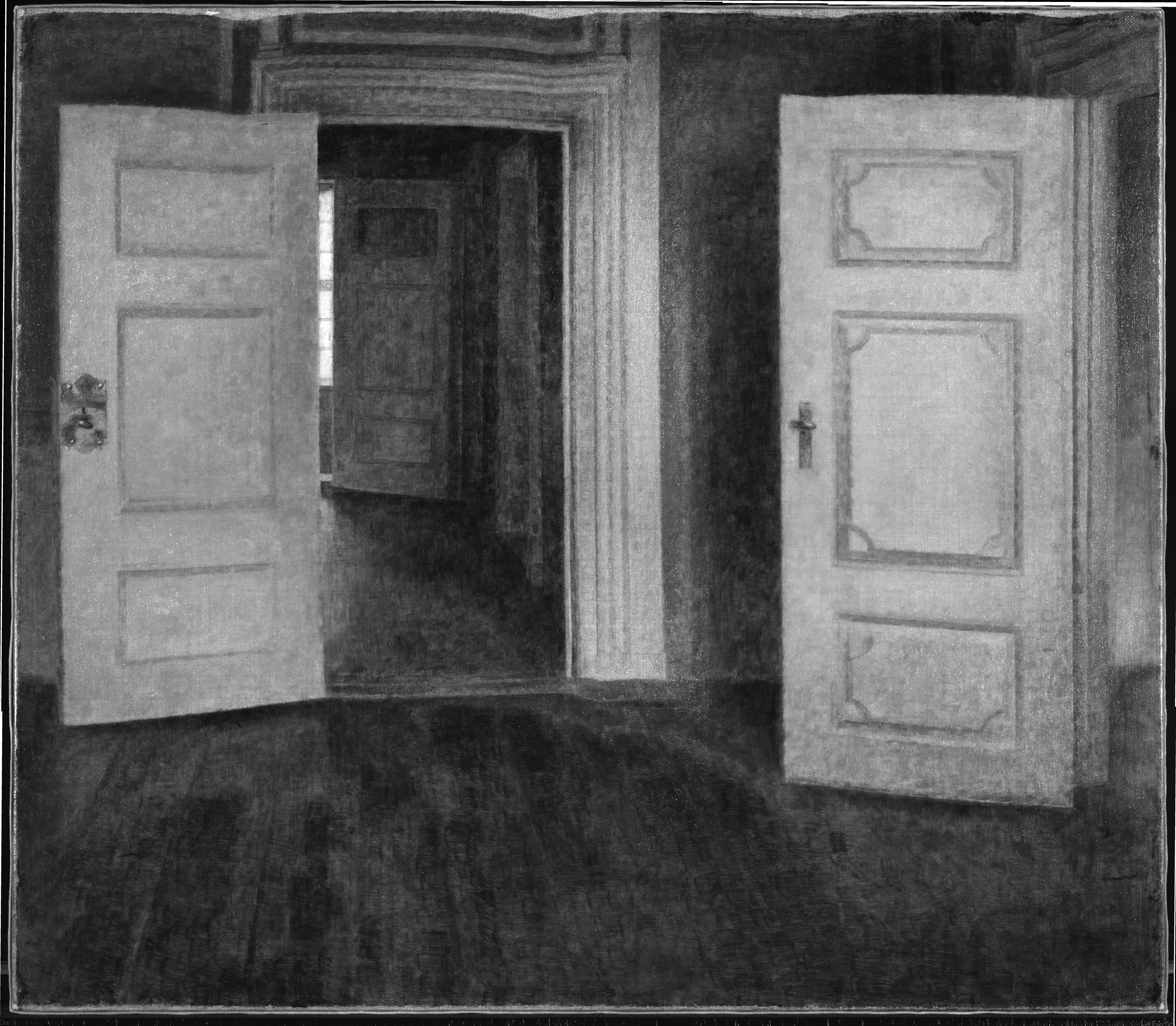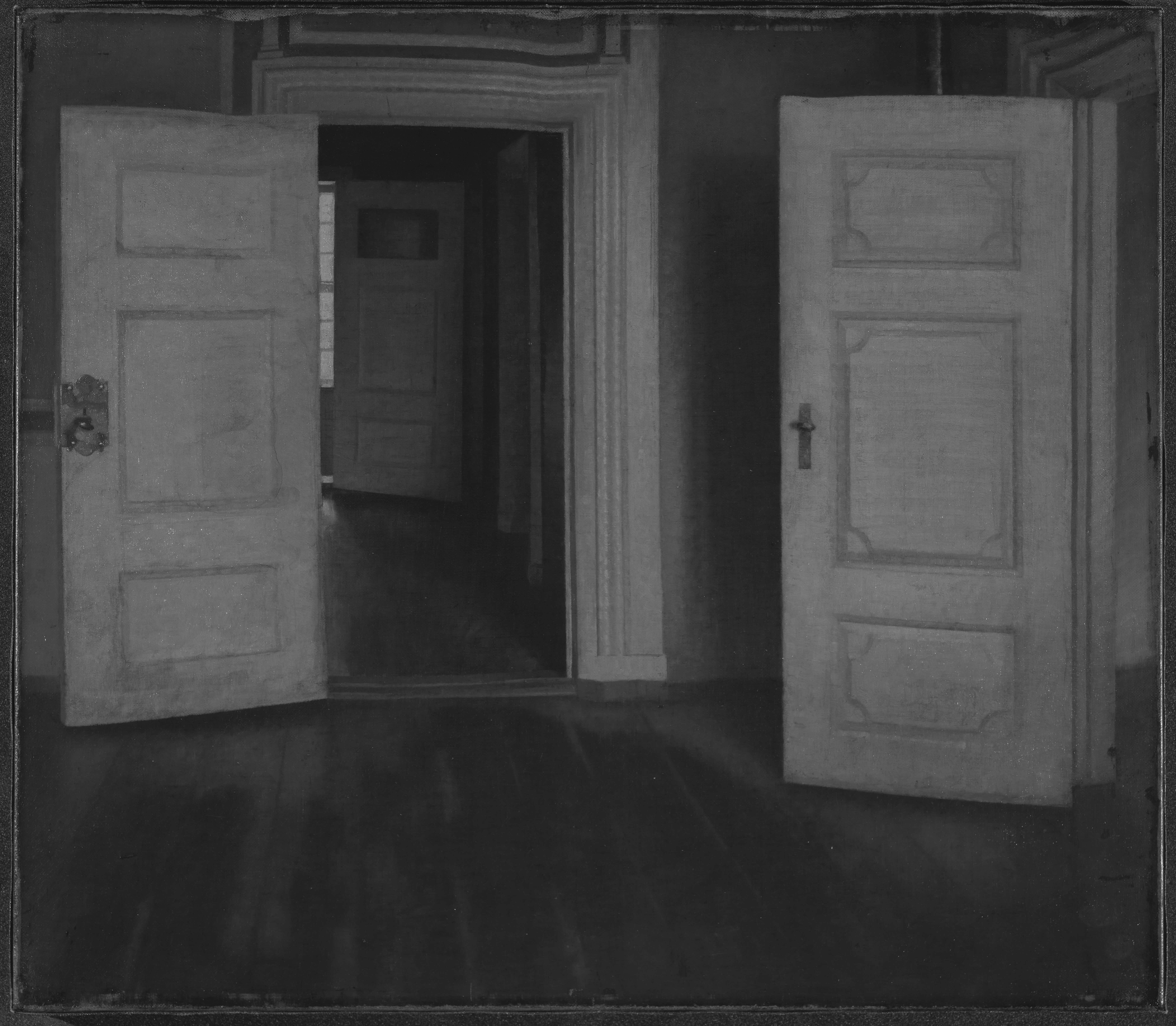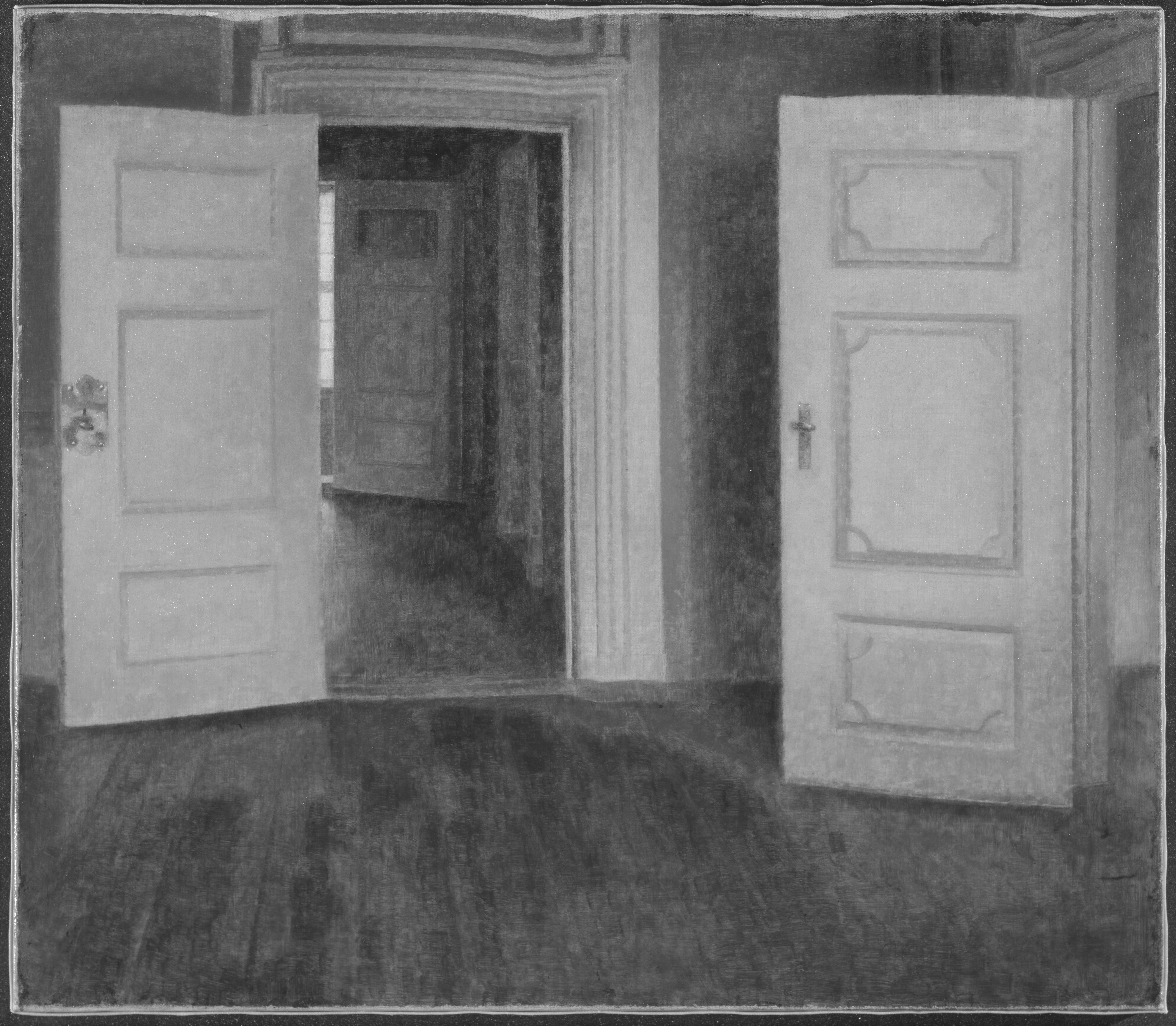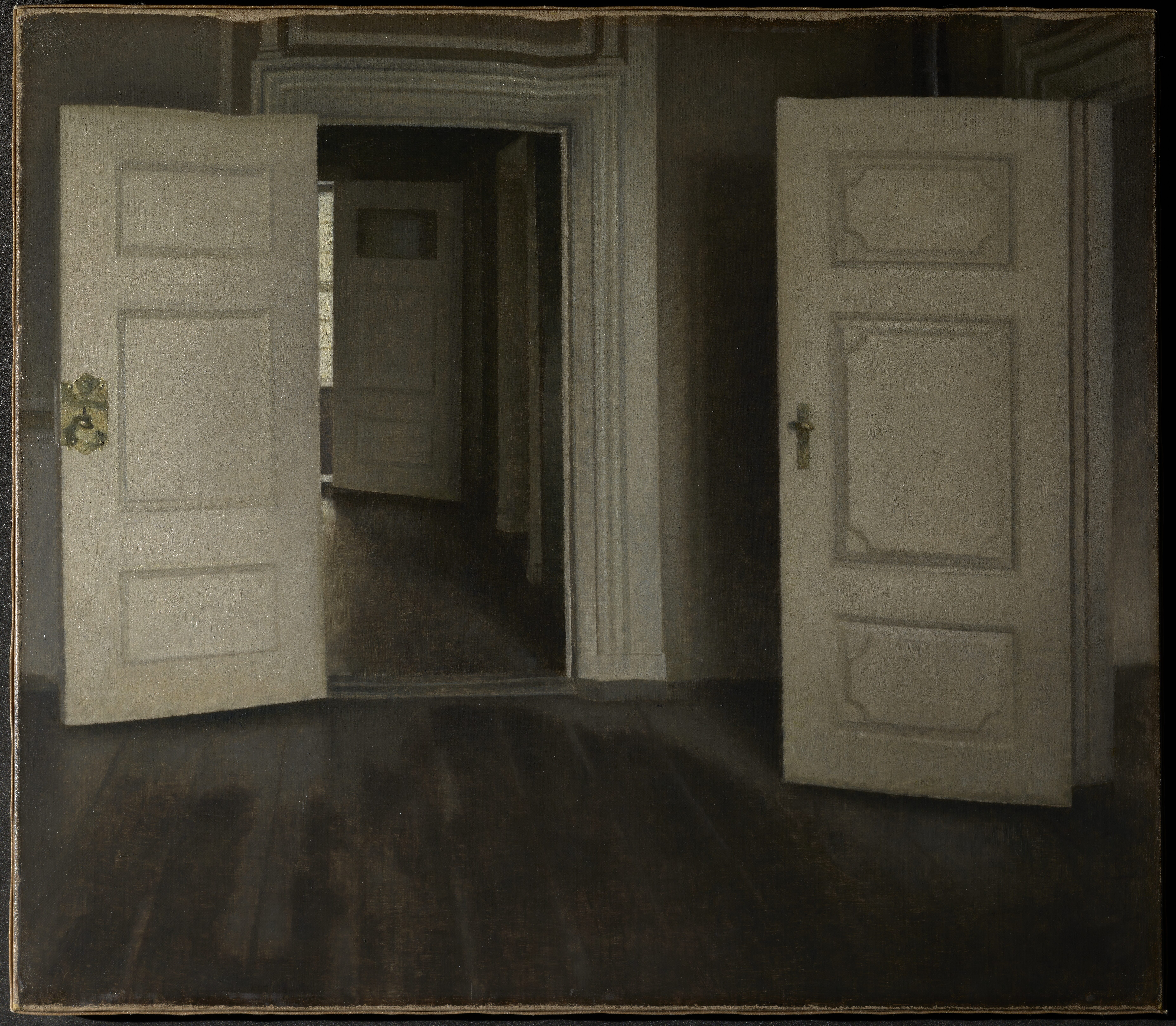 Hammershøi excels in intriguing views like this where the main motif is a flow leading through a line of half-opened doors. A plotless motif that results in a lot of questions seeking to find a plot: what is going on?