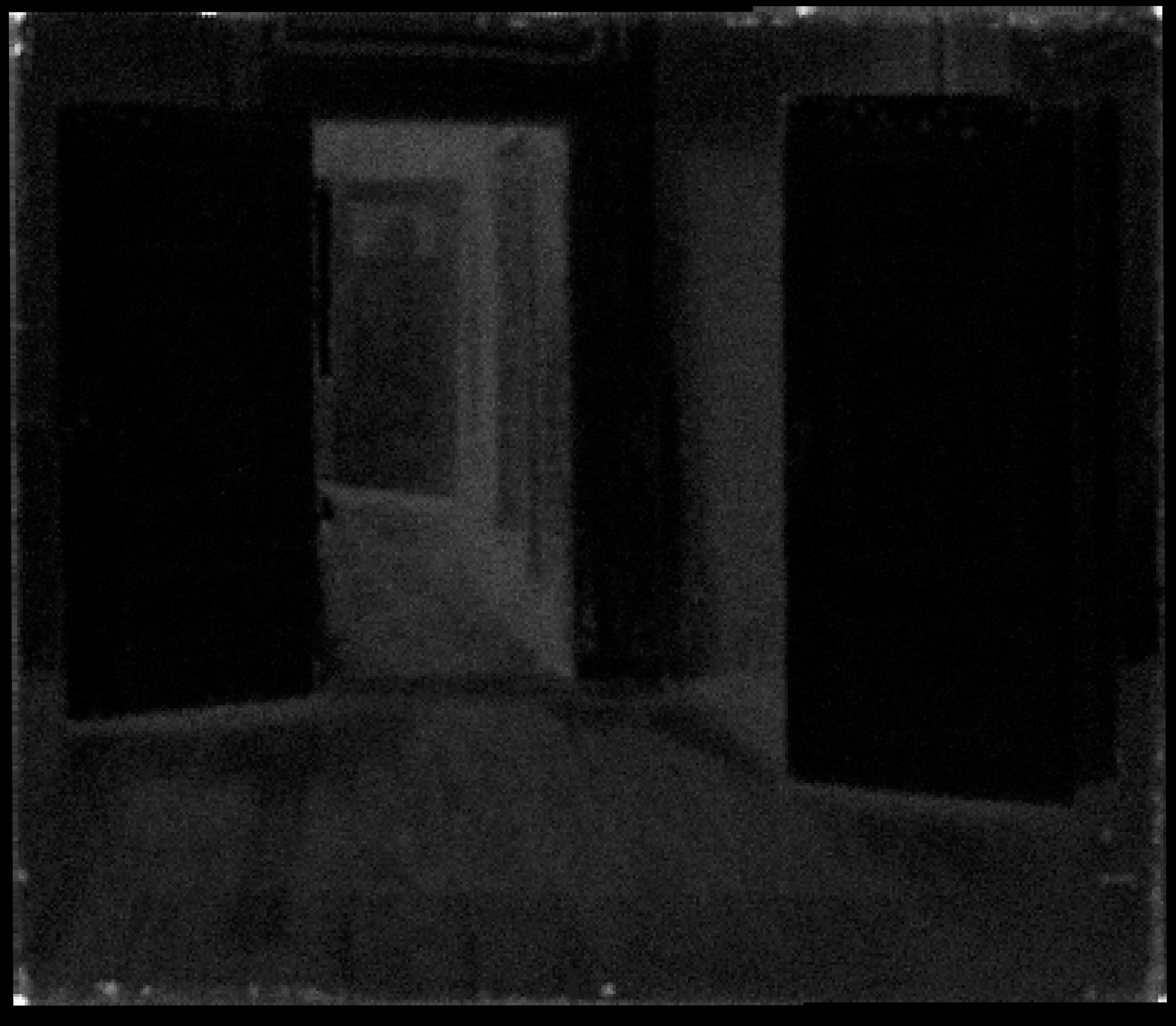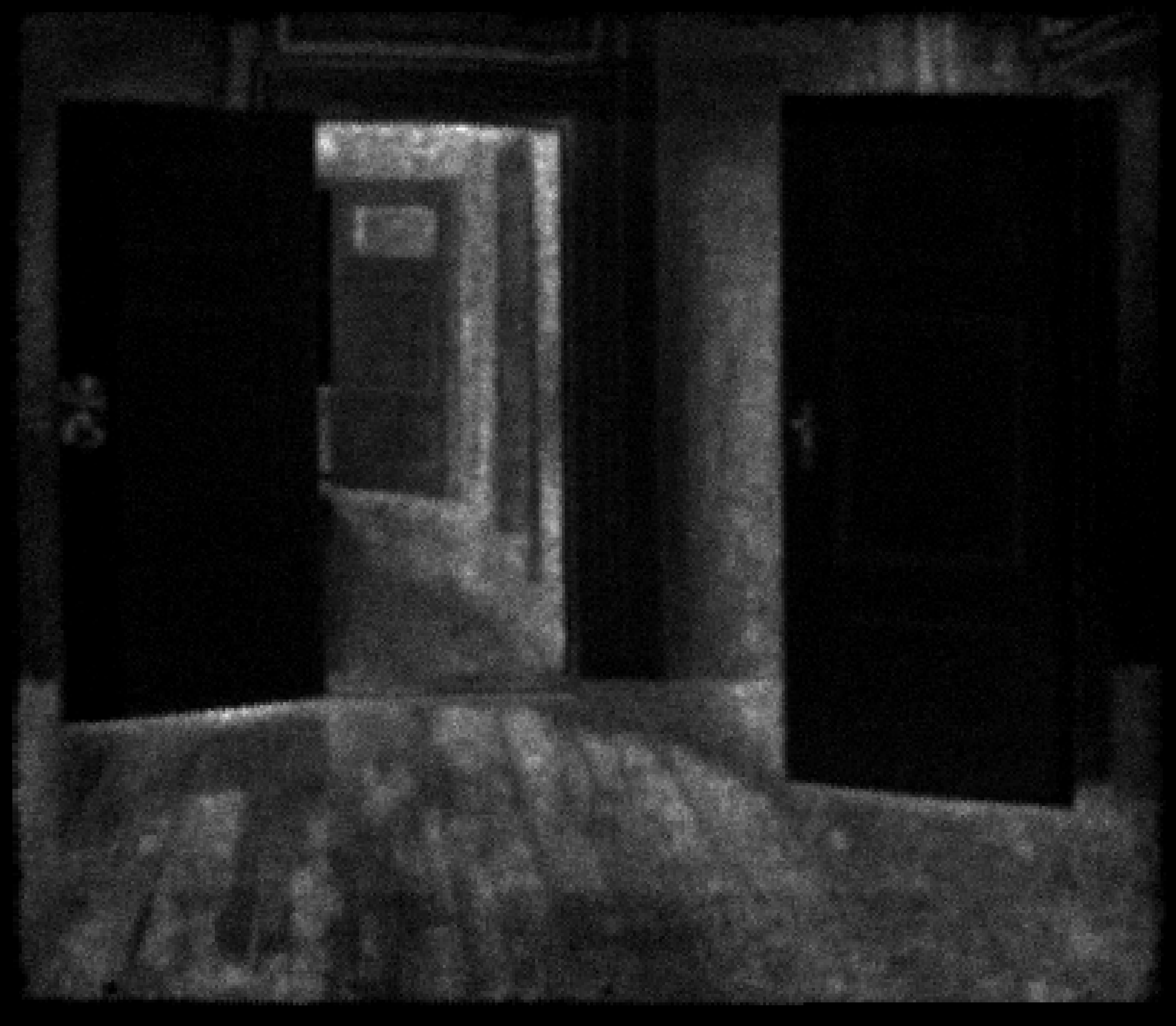 (Transl): LIVING ROOM. ”Open Doors”. Through an open door in the back wall of the front room one is looking into two rooms behind, the doors of which are also open. None of the rooms shows any figure, any piece of furniture, painting or such. At the front on the right a white door, wide open. In the hindmost room is a narrow section of a large window with small panes, from which a strong light falls across the floor.