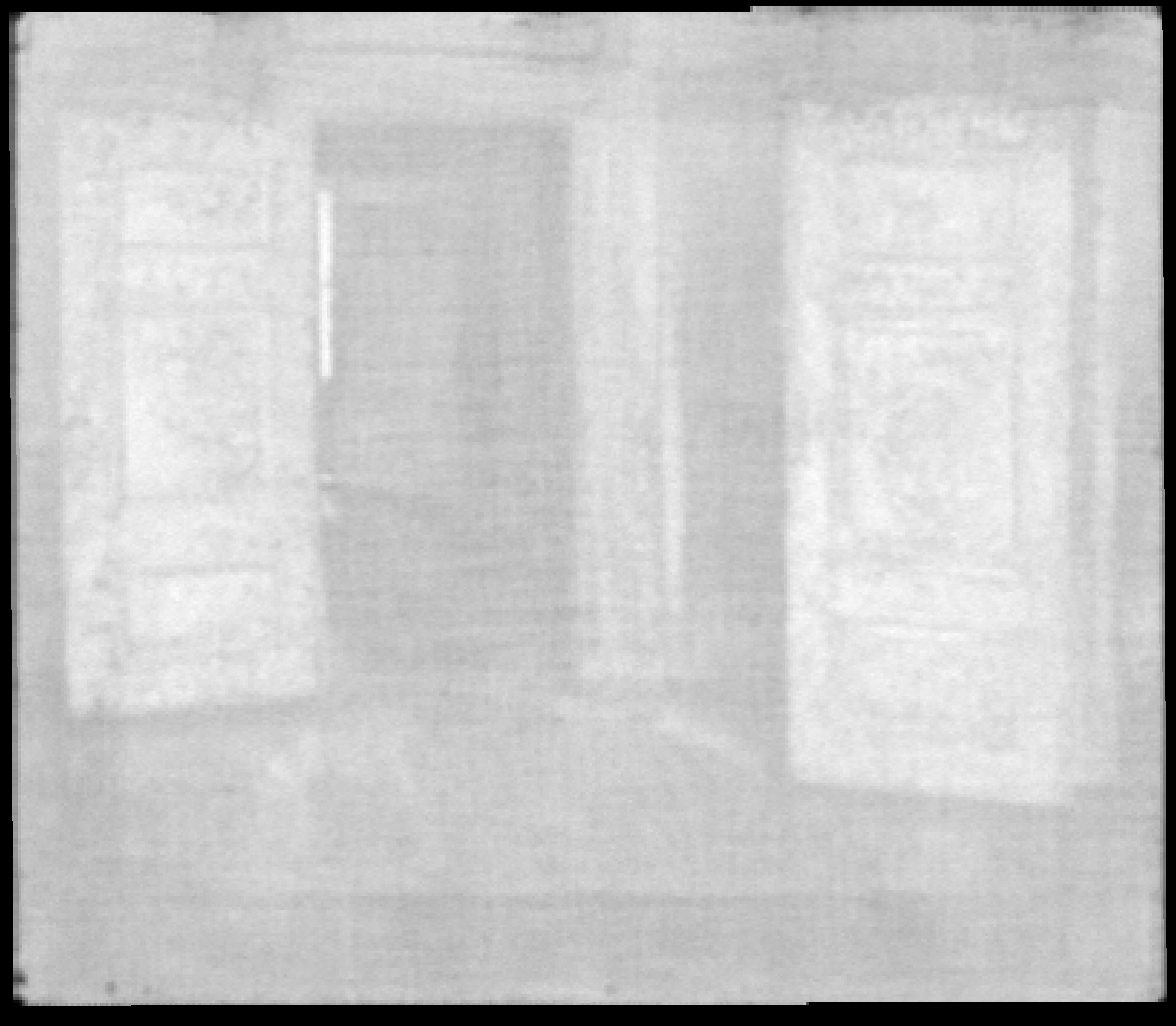 Thin lines of potential underdrawing are visible locally in the door panels and the door frames.